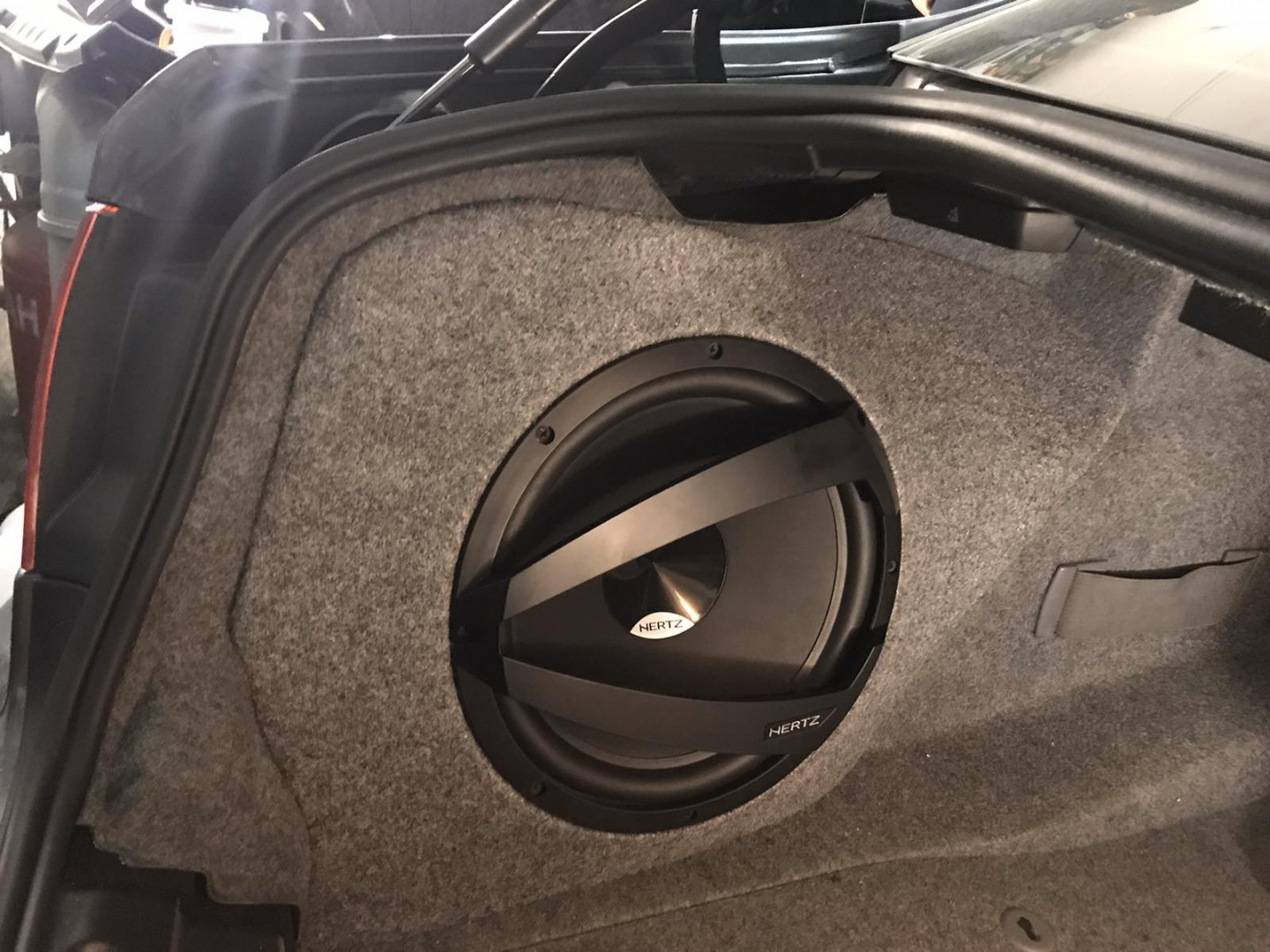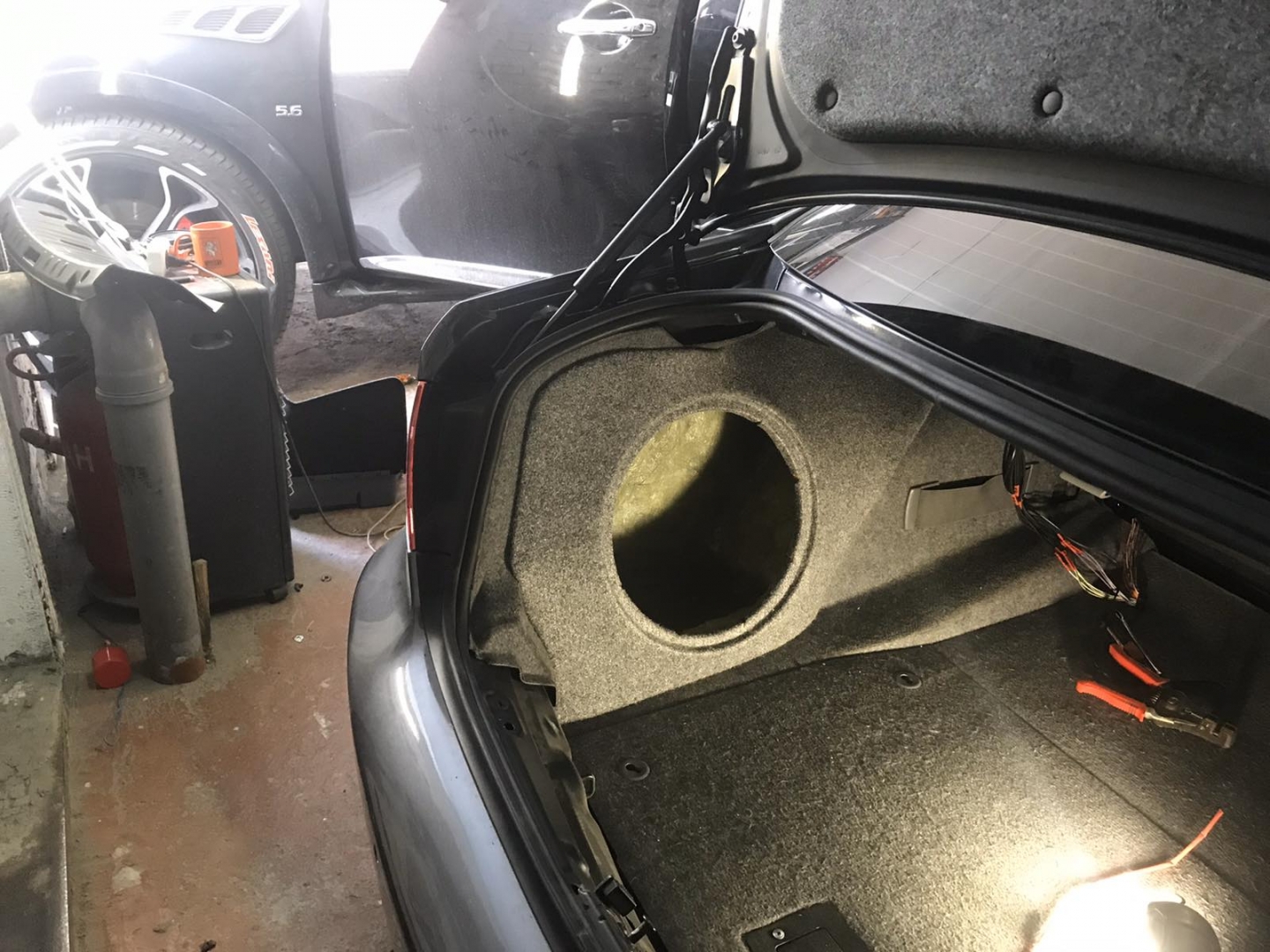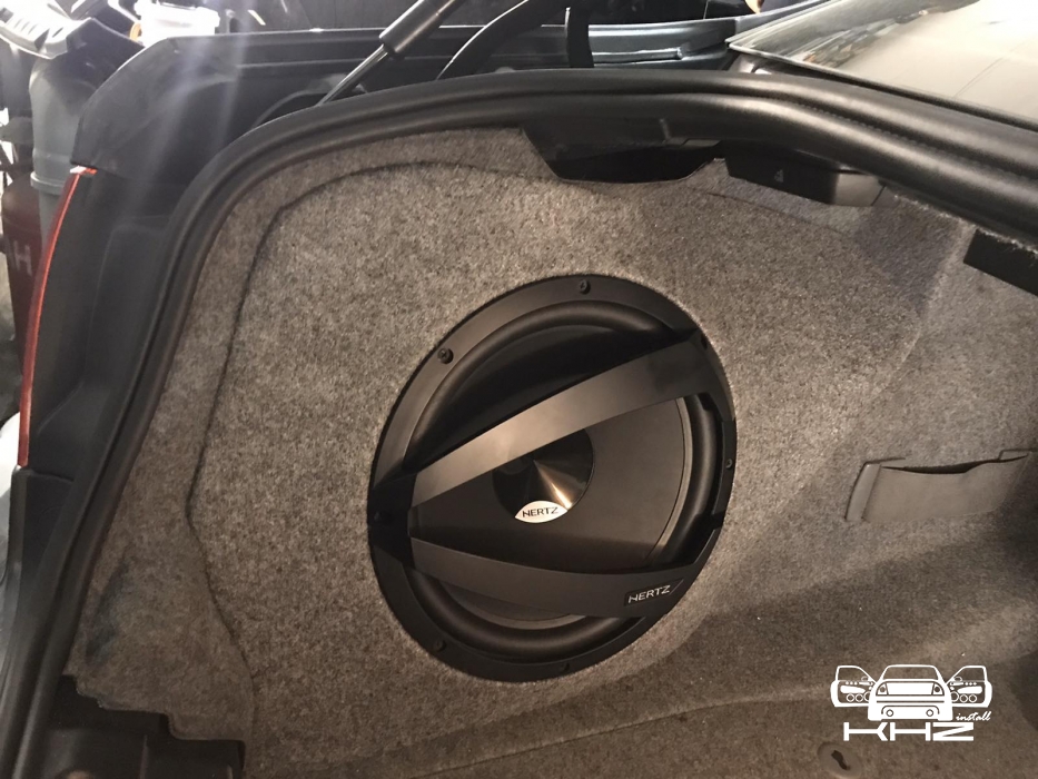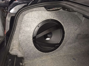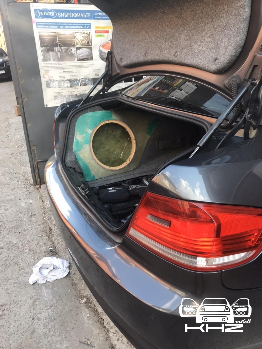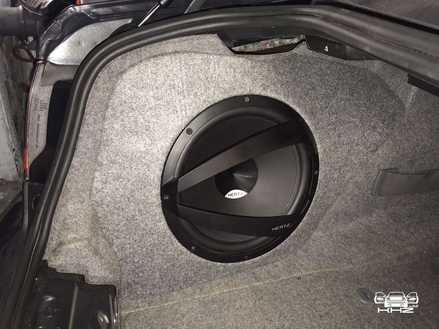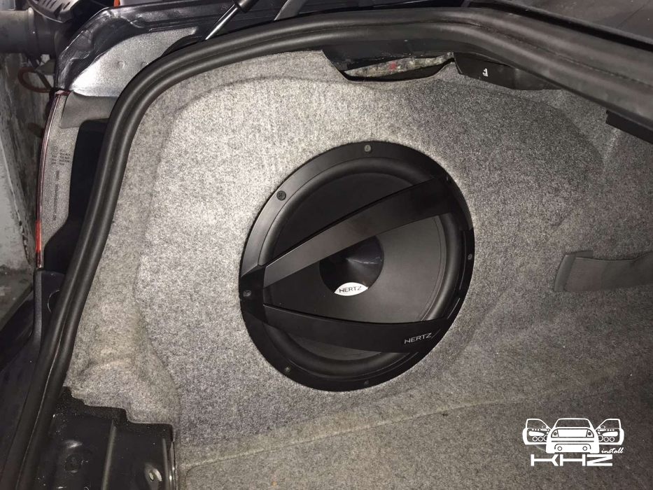 Фінальний етап по установці сабвуфера в BMW 3 E92, це закріплення самого сабвуфера, його ми обирали за бюджетом і він повинен бути з максимальною чутливістю, так як наш підсилювач звуку був без великого запасу потужності. І для цього завдання ідеально підійшов Hertz Dieci 30-ти сантиметровий сабвуфер із захисним грилем у комплекті. Він був випробуваний не раз і хоч він не дуже дорогої лінійки - але на свої гроші він нас не підводив. Що сталося і цього разу - навіть за умови хорошої блокади звуку задніми сидіннями його було чути добре в салоні, щоправда ми прибрали заглушку в підлокітнику саме для цього. Сабвуфер стелс у BMW E92 вийшов ось такий і має чудовий вигляд у багажнику - і весь багажник у вашому розпорядженні!