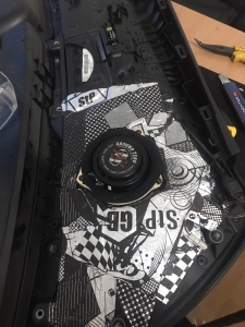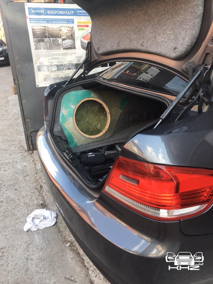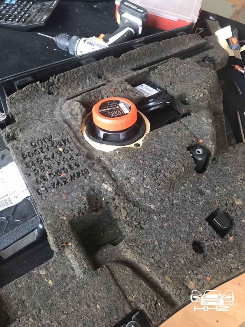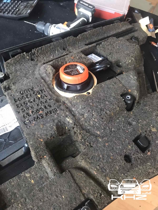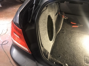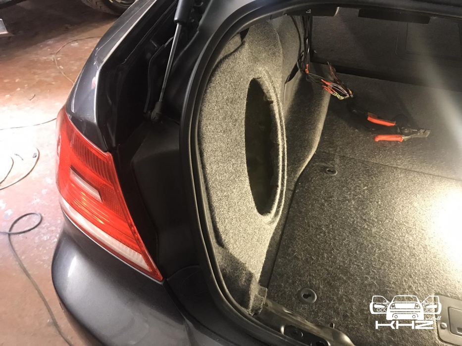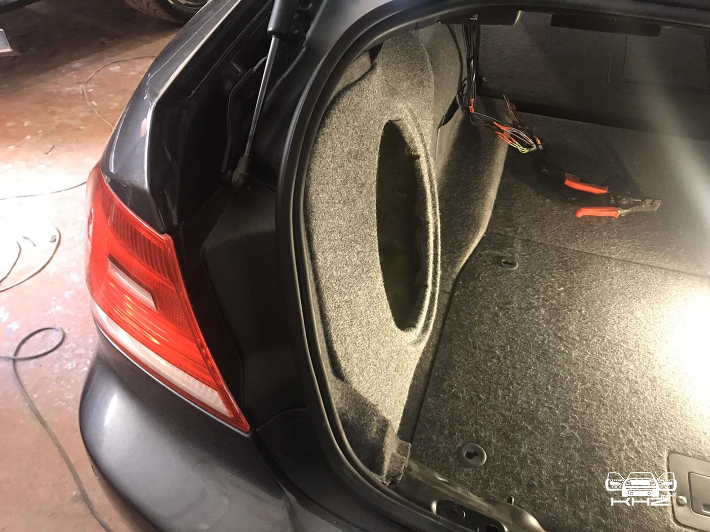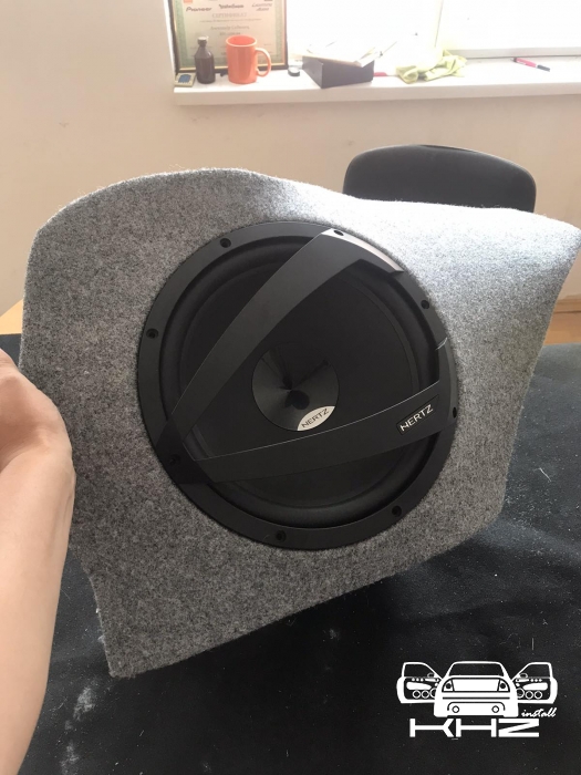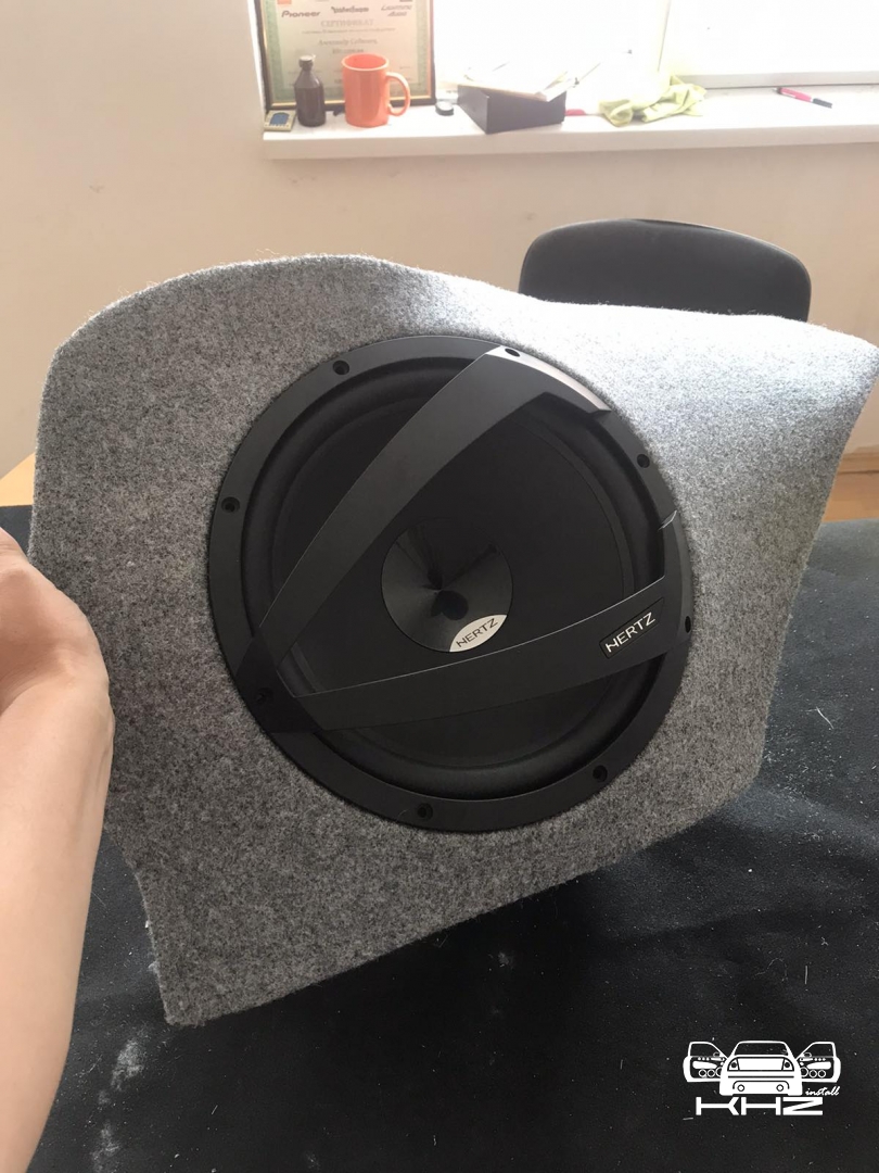 Фінальний етап по установці сабвуфера в BMW 3 E92, це закріплення самого сабвуфера, його ми обирали за бюджетом і він повинен бути з максимальною чутливістю, так як наш підсилювач звуку був без великого запасу потужності. І для цього завдання ідеально підійшов Hertz Dieci 30-ти сантиметровий сабвуфер із захисним грилем у комплекті. Він був випробуваний не раз і хоч він не дуже дорогої лінійки - але на свої гроші він нас не підводив. Що сталося і цього разу - навіть за умови хорошої блокади звуку задніми сидіннями його було чути добре в салоні, щоправда ми прибрали заглушку в підлокітнику саме для цього. Сабвуфер стелс у BMW E92 вийшов ось такий і має чудовий вигляд у багажнику - і весь багажник у вашому розпорядженні!