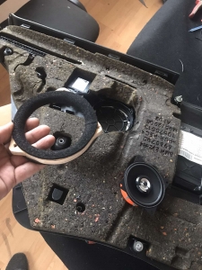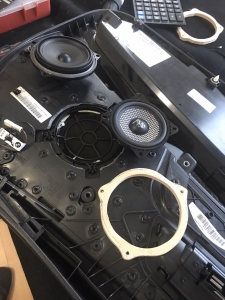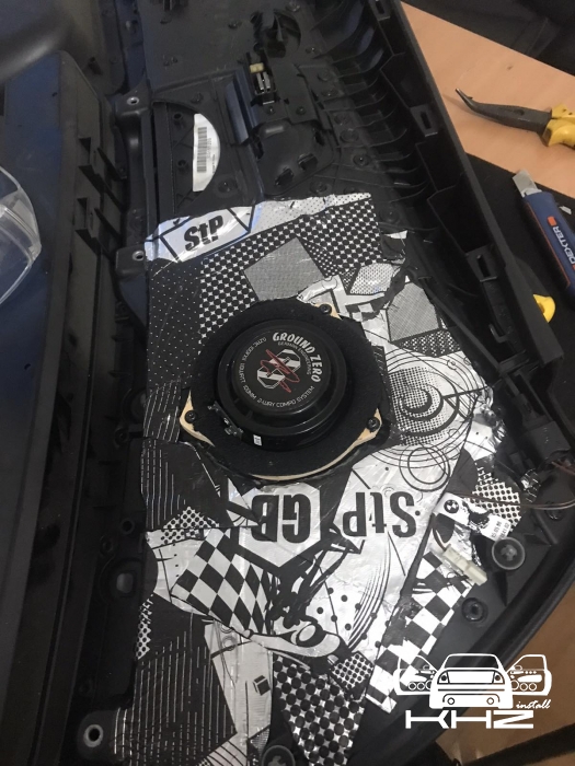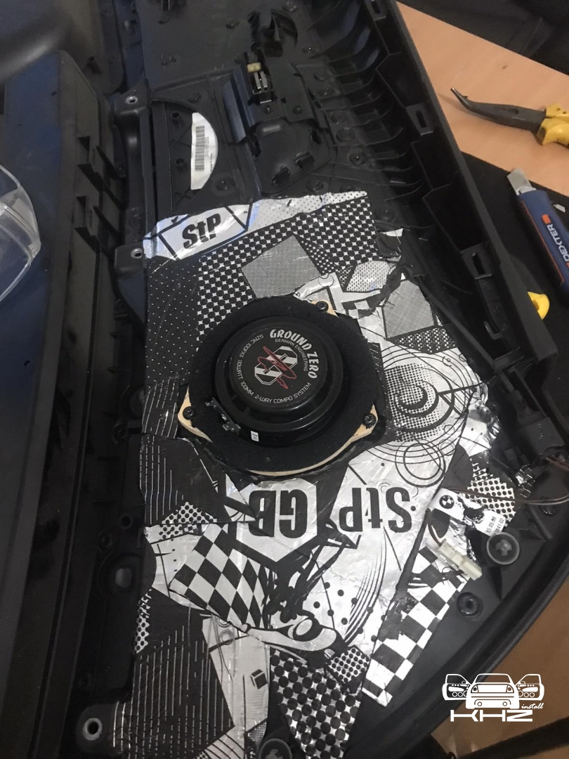 З фронтальною акустикою ми закінчили і переходимо до задньої акустики, вона стоїть у задніх обшивках, ми їх демонтуємо, знімаємо заводські динаміки та за тією самою технологією через проставочні кільця встановлюємо і тилову акустику, вона коаксіального типу з вмонтованим твітером бренда Hertz Dieci, розміром 10 см, вона слугуватиме підзвучуванням фронтальній системі, для об'ємності звучання.