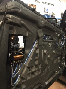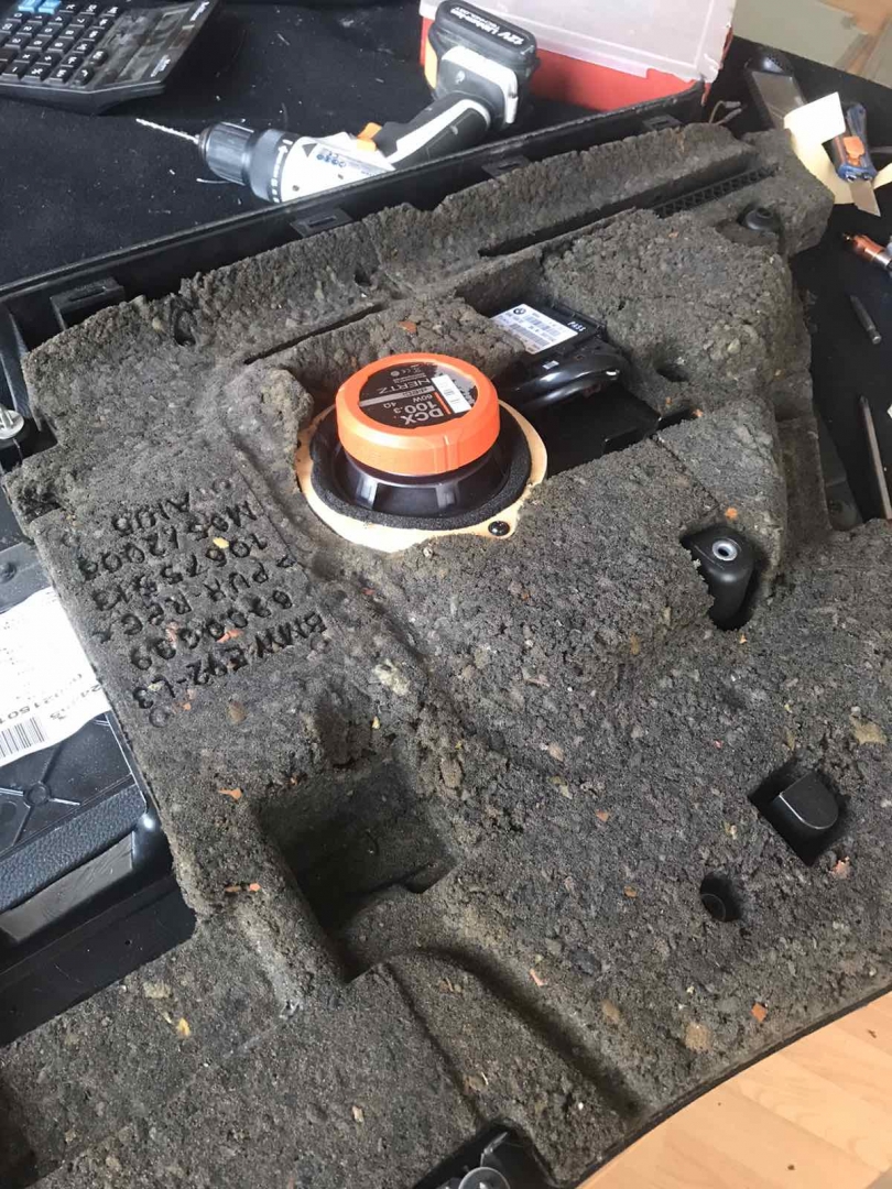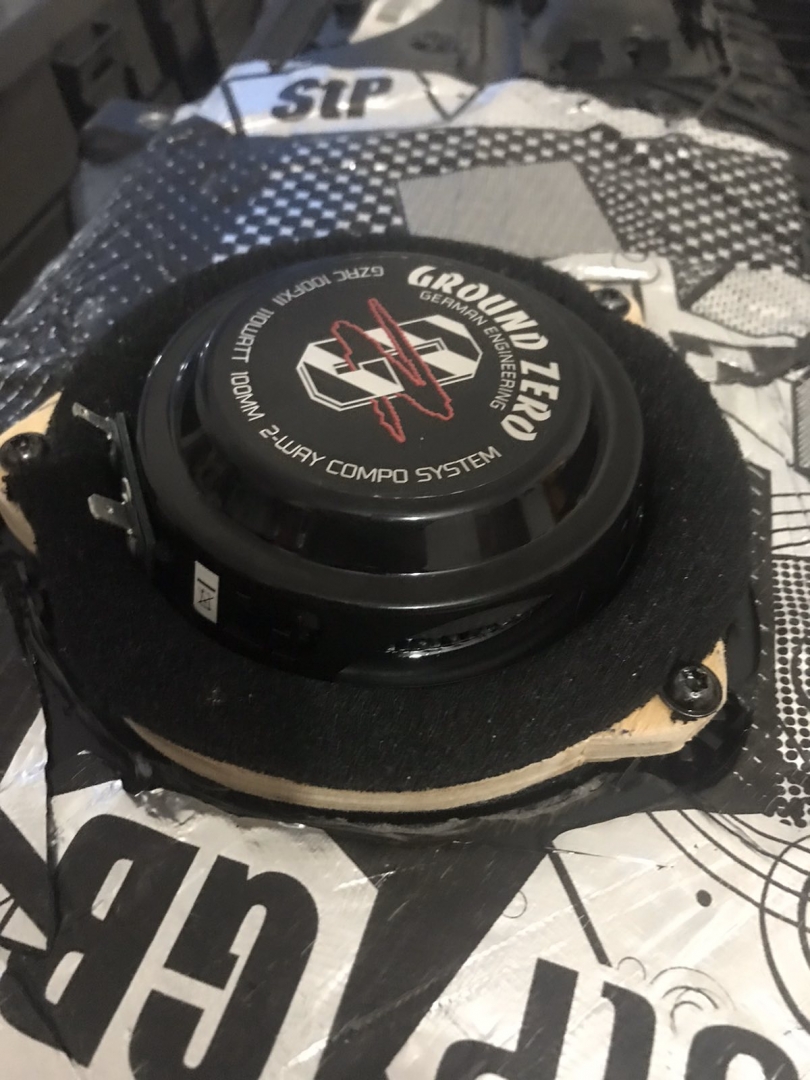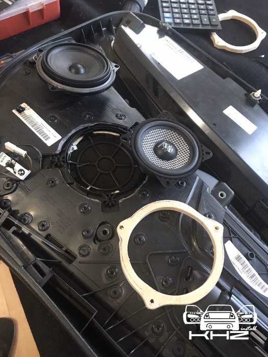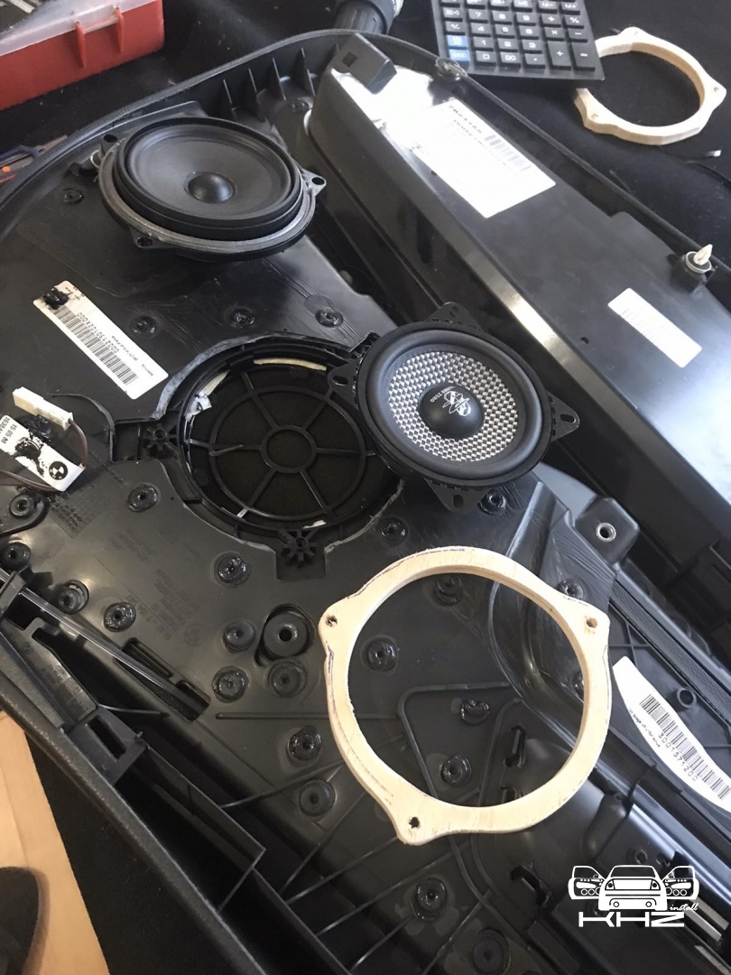 Почнемо з установки фронтальної акустики, у всіх моделях з 2005 року BMW встановлює динаміки в дверях розміром 10 см, і ставить плоскі так звані підсидушники, низькочастотники розміром 16,5 або 20 см в плоскому виконанні. І звісно, якщо комплектація не LOGIK 7, то там нічого не грає і про якість звуку говорити немає сенсу. Для нашого завдання ми підібрали не спеціальні динаміки для BMW E92, а універсальні компонентні динаміки фірми GroundZero лінійки Radioactive розміром 10 см, мідбаси ми встановили через проставочні кільця, які ми виготовили з кріпленнями під заводські, закріпили сам динамік до проставки, а проставку до пластикової карти. Так само ми карту обклеїли віброізоляцією для того, щоб прибрати резонанс з карти від роботи динаміка, він потужніший за рідний. Виглядає це так: