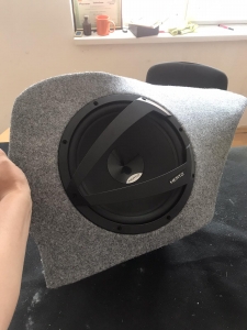 Сабвуфер стелс вже зашпакльований і відшліфований, і готовий до встановлення і перетяжки, карпет ми підібрали під колір обшивки багажника максимально схожий, і ми отримали ось такий виріб, який закріпили в крилі прямо до кузова.