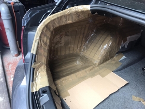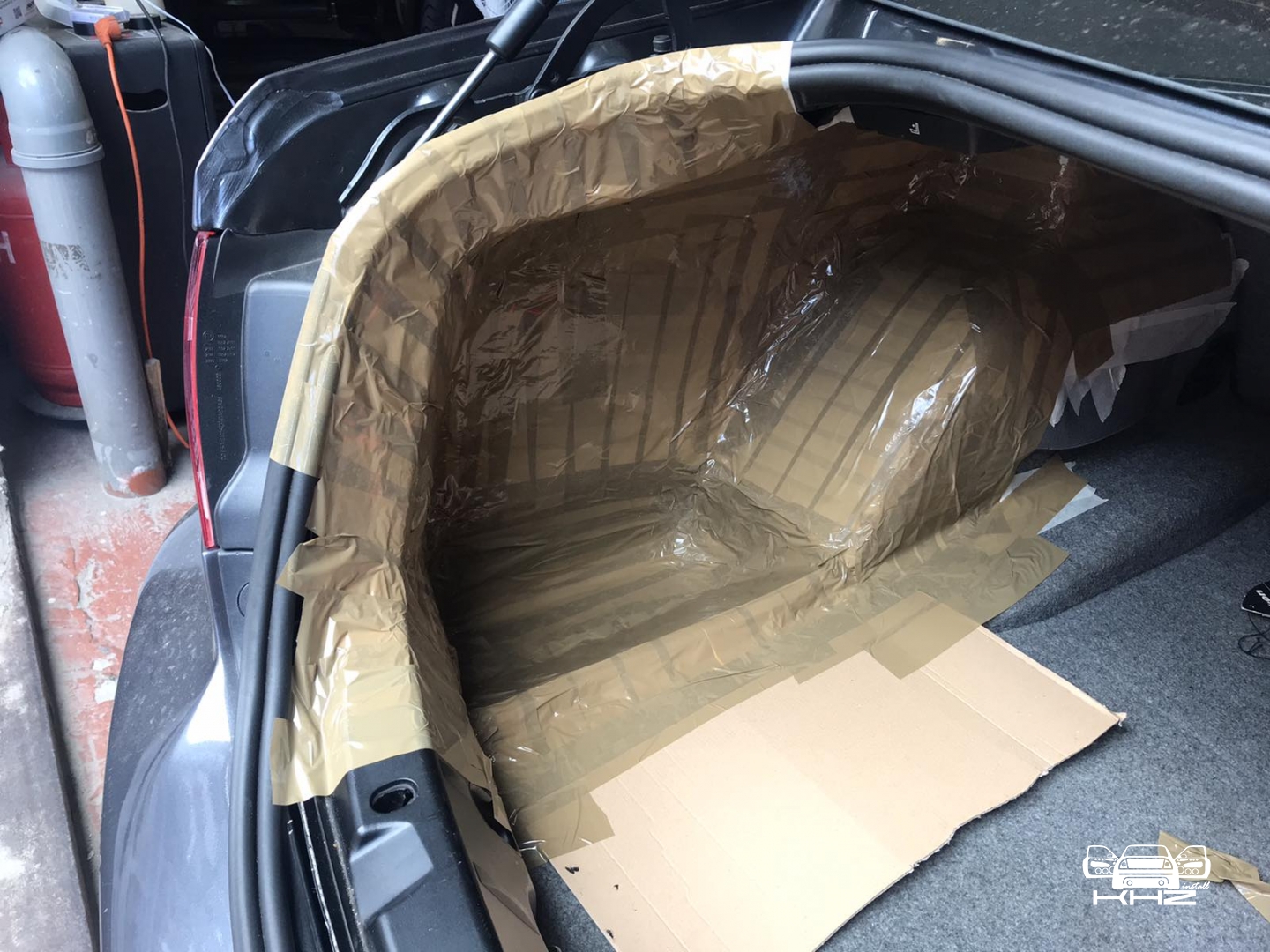 Далі покажемо вам, як ми виготовляємо анатомічні стелс сабвуфери в крилі, ми готуємо крило до обклеювання за допомогою двох скотчів, а потім наносимо смолу і скломат для формування матриці, потім чекаємо кілька годин, поки підсохне, і знімаємо готовий зліпок.