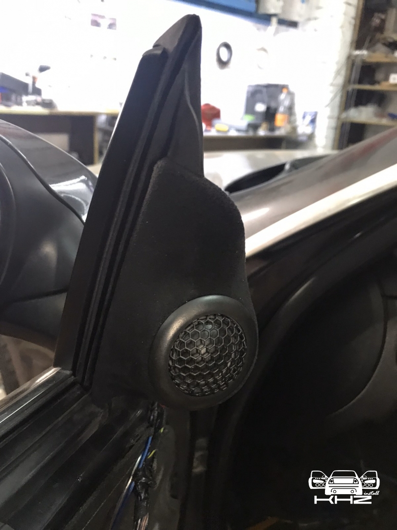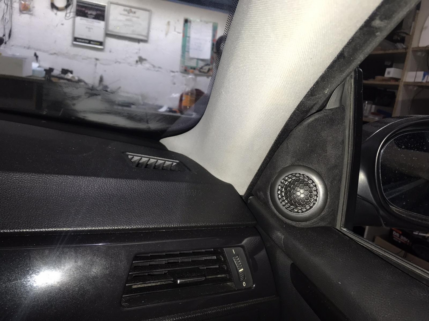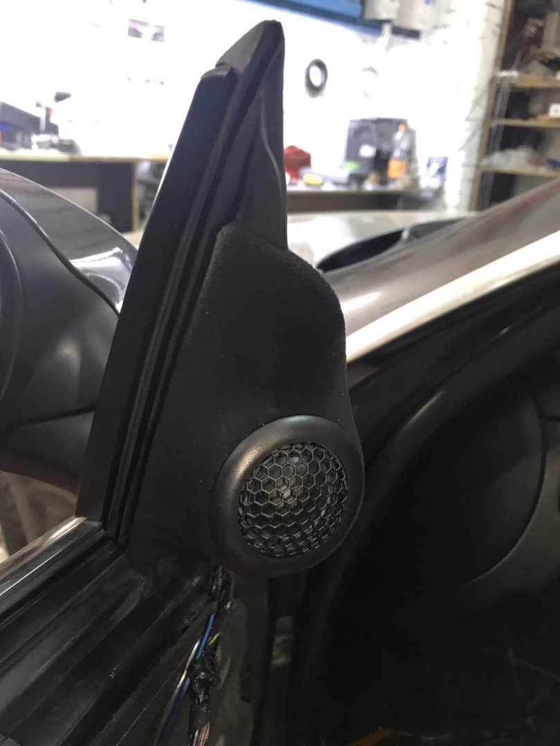Наступний етап - це встановлення твітерів, нагадаю, що їх не було взагалі, і для їхньої інсталяції ми робитимемо куточки на замовлення, зі смоли та скломату, ми використаємо штатні куточки, у них ми розміщуємо твітера під правильним кутом, і робимо наш виріб, наприкінці ми наносимо шпаклівку і виводимо їх під перетяжку алькантарою. Після всіх процедур куточки з твітерами мають такий вигляд, вони закріплені в штатних місцях. Таким чином ми зробили правильну акустичну сцену.
