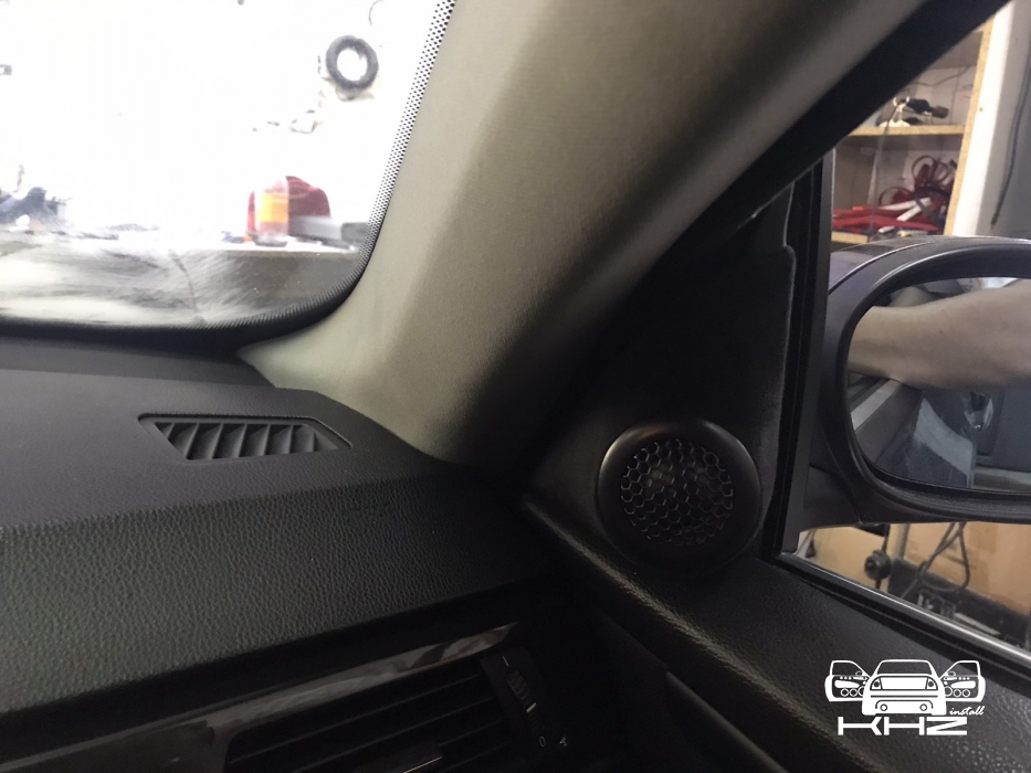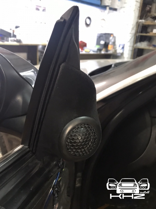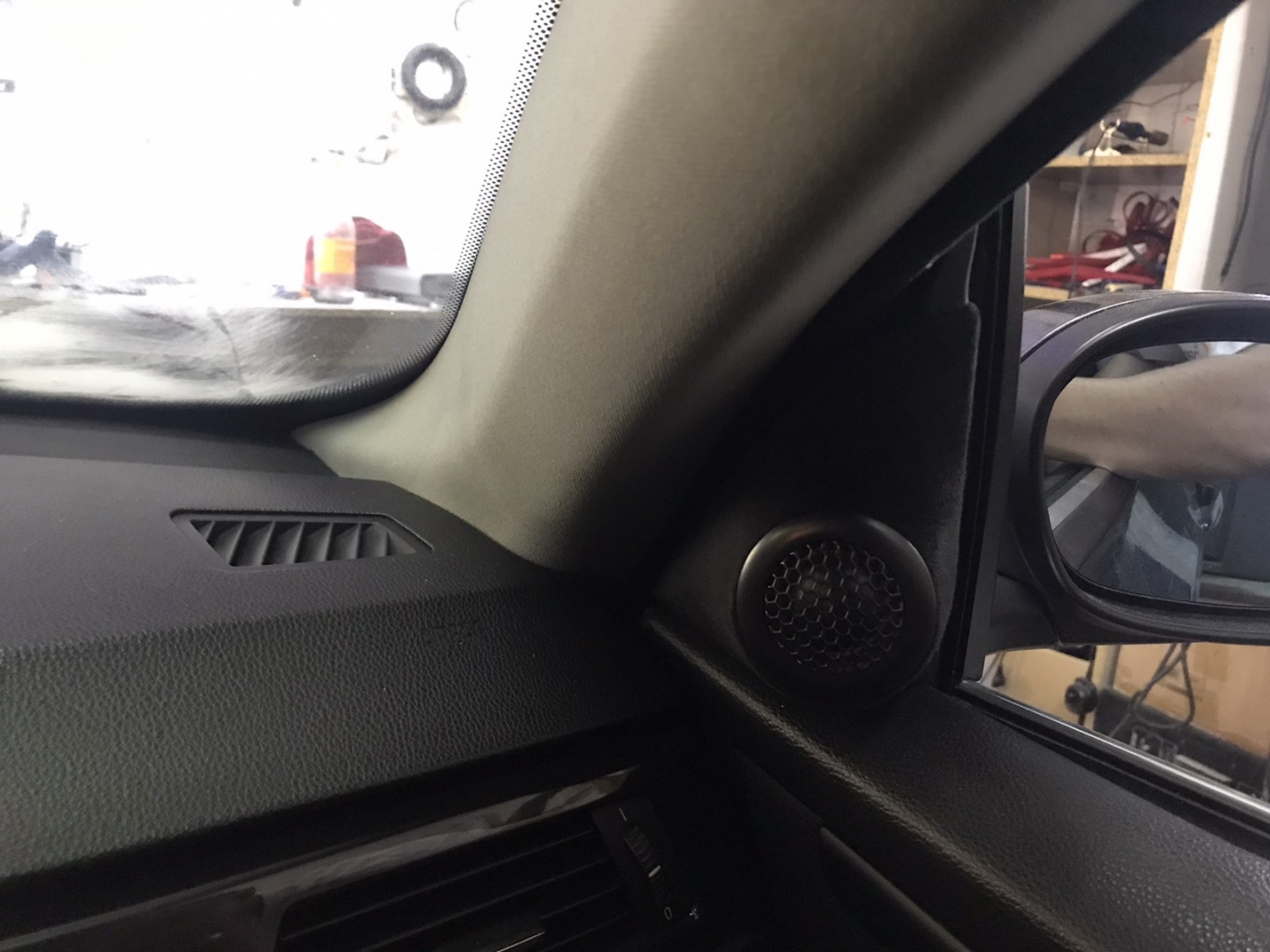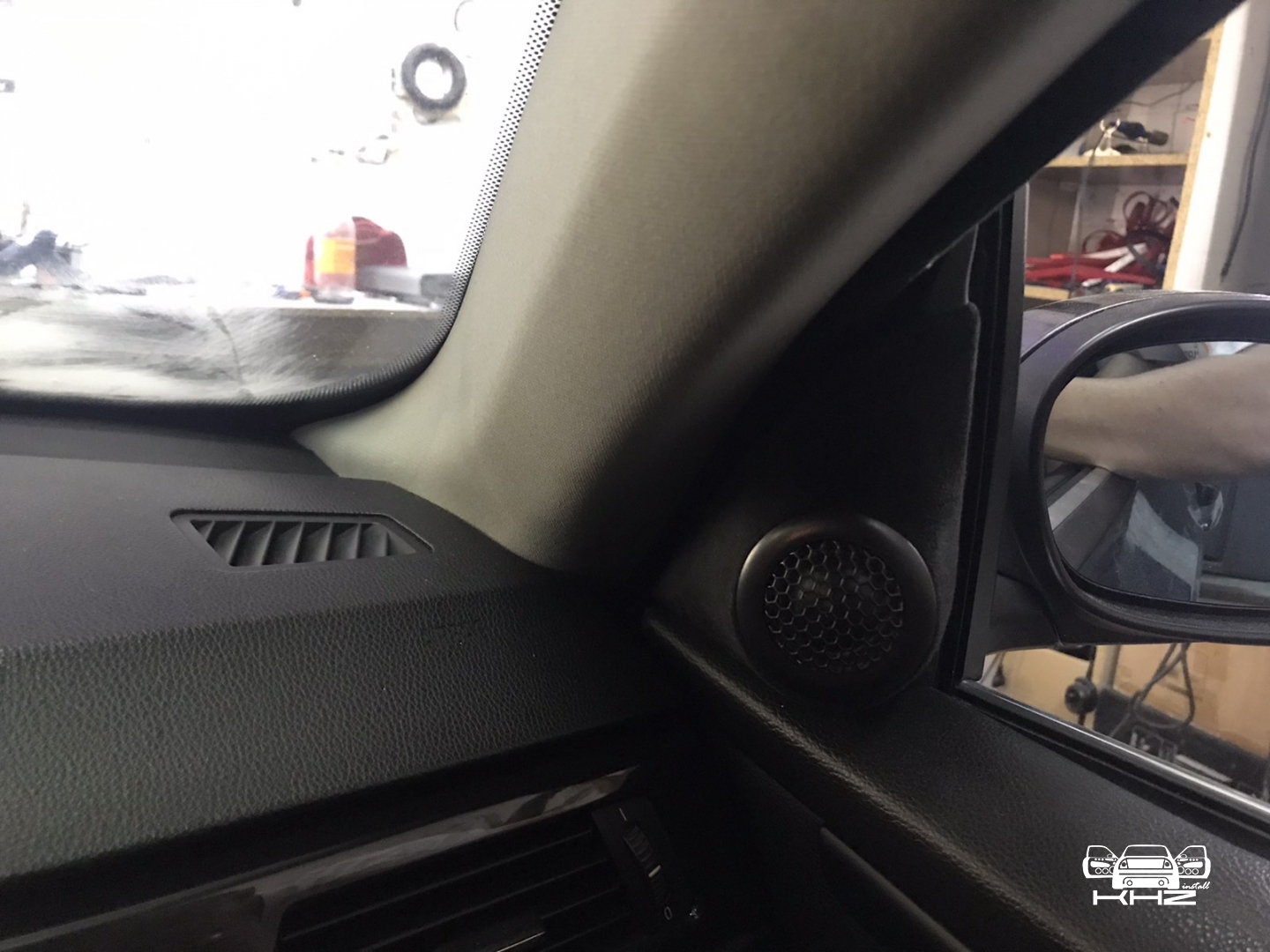 Наступний етап - це встановлення твітерів, нагадаю, що їх не було взагалі, і для їхньої інсталяції ми робитимемо куточки на замовлення, зі смоли та скломату, ми використаємо штатні куточки, у них ми розміщуємо твітера під правильним кутом, і робимо наш виріб, наприкінці ми наносимо шпаклівку і виводимо їх під перетяжку алькантарою. Після всіх процедур куточки з твітерами мають такий вигляд, вони закріплені в штатних місцях. Таким чином ми зробили правильну акустичну сцену.