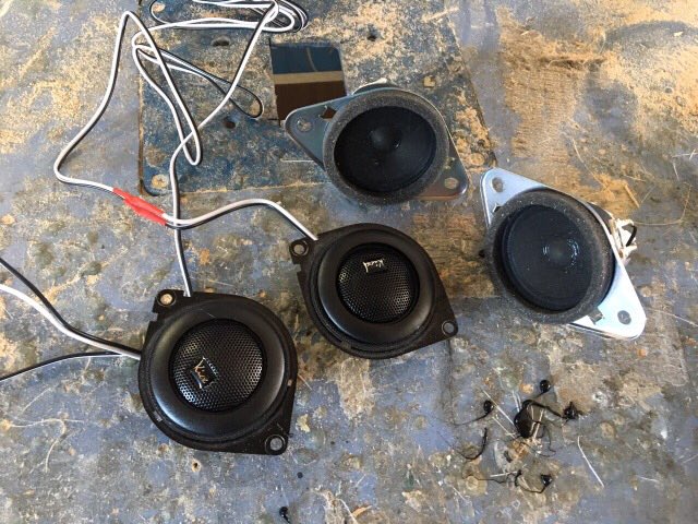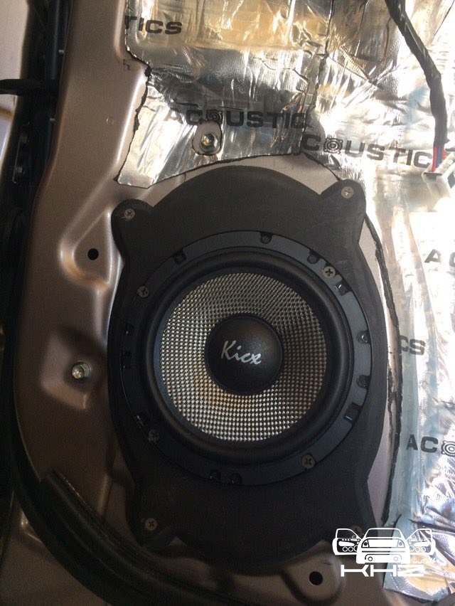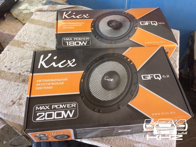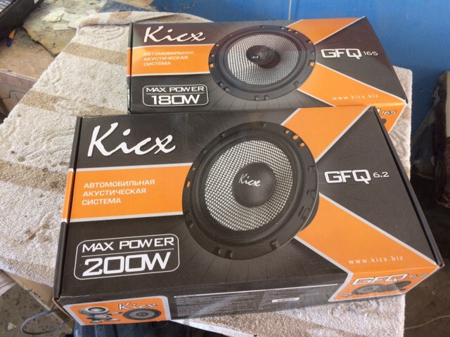 Після зняття штатної акустики ми її порівняли з акустикою, яку запропонували ми, це передтопова лінійка акустики Kicx, акустика Kicx GFQ, розмірами 165 мм. Виявилося, що в передніх дверях стоять овали, тому потрібно буде робити проставки з фанери незвичайної форми, щоб перейти на розмір 16,5 см. А зараз порівняйте акустику, я думаю питань не виникне, що і як буде грати: