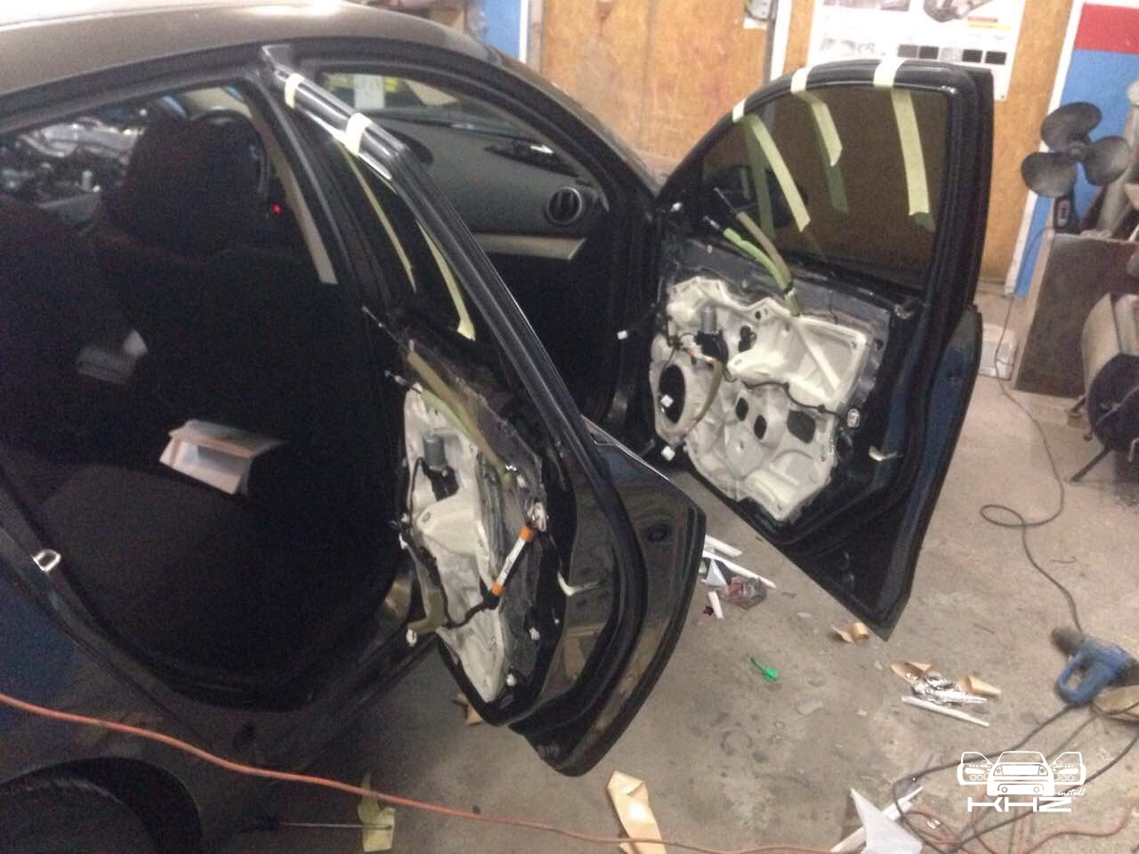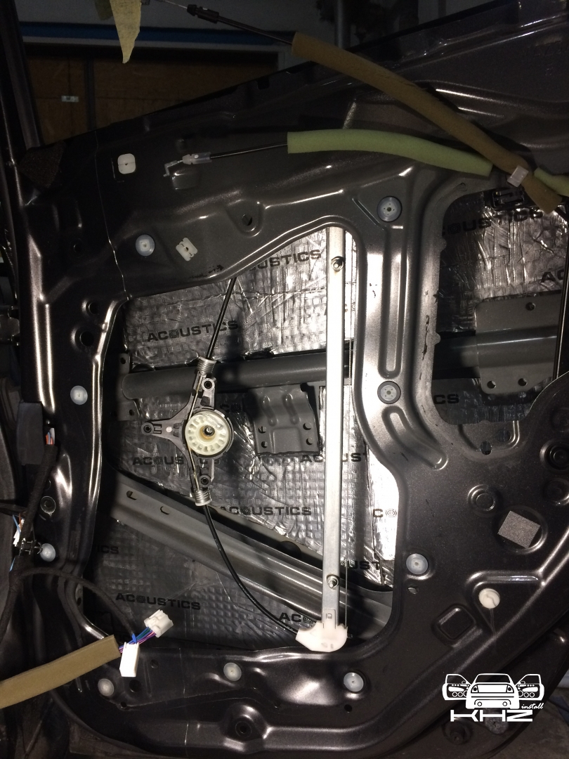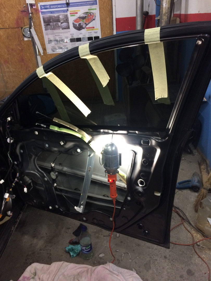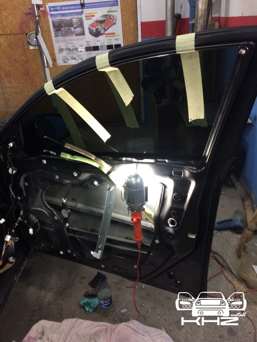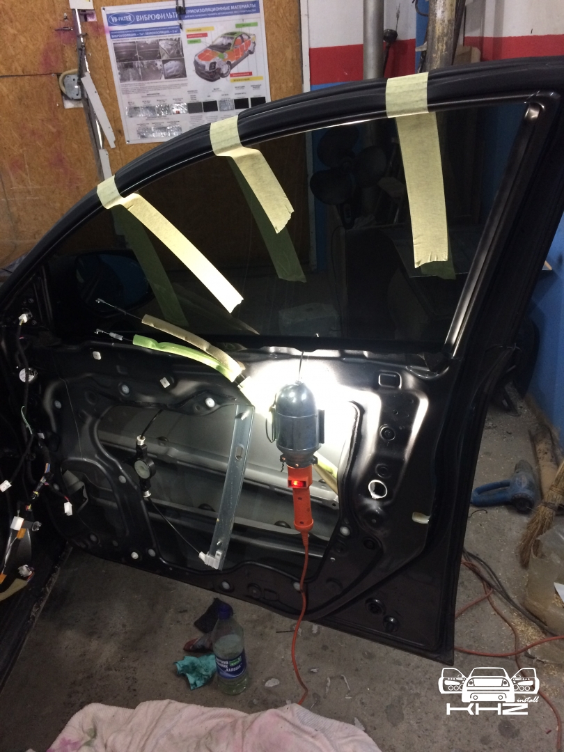 Ми робили тест за вагою, вирішили зважити акустику штатну і ту, що будемо ставити, і так цифри: штатний динамік важить 300 грамів, і це разом із подіумом, Герц важить 1100 грамів, Фокал - 1 кг, я думаю, різниця буде відчутною. І так тепер перейдемо до шумо-віброізоляції, це один з основних чинників у побудові правильної системи. Нам потрібно було знешумити 4 двері і ляду багажника. Чому вона потрібна? По-перше, за умови правильної шумоізоляції дверей вони перетворюються на закритий простір, так званий короб під акустику, і вона починає грати гарно та басово. І по-друге, прибирає зайві звуки поза автомобілем і додає комфорту в автомобілі, тим самим підвищуючи гучність і якість акустики. І почнемо з того, що двері ми розбираємо, знімаємо пластикову заглушку, відкручуємо напрямні склопідіймача і фіксуємо скло про всяк випадок.