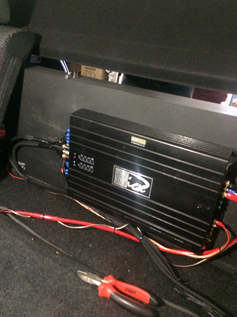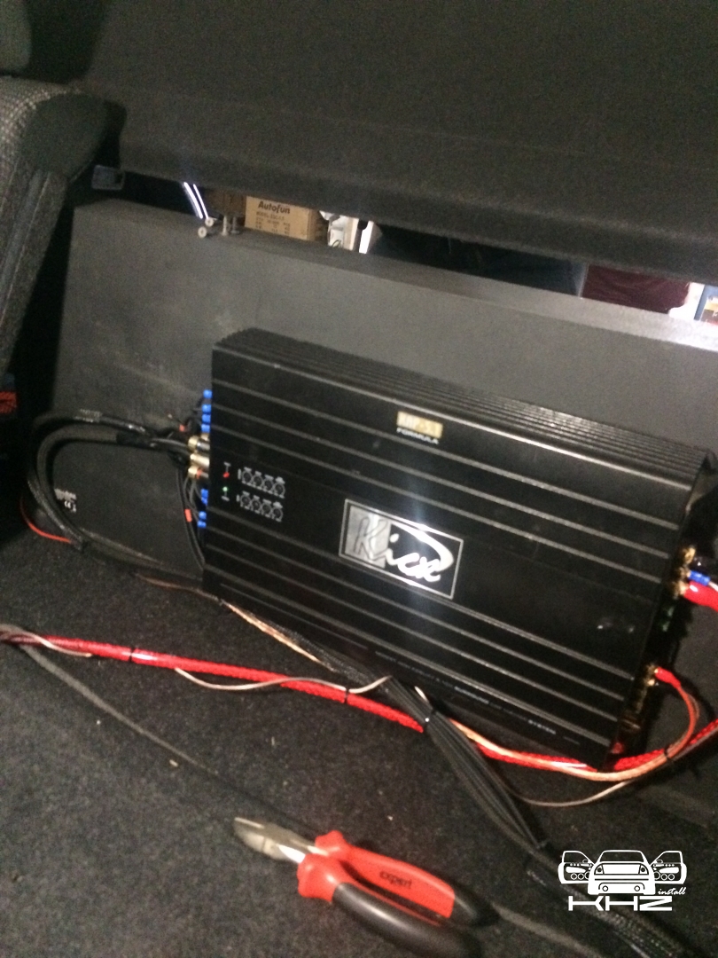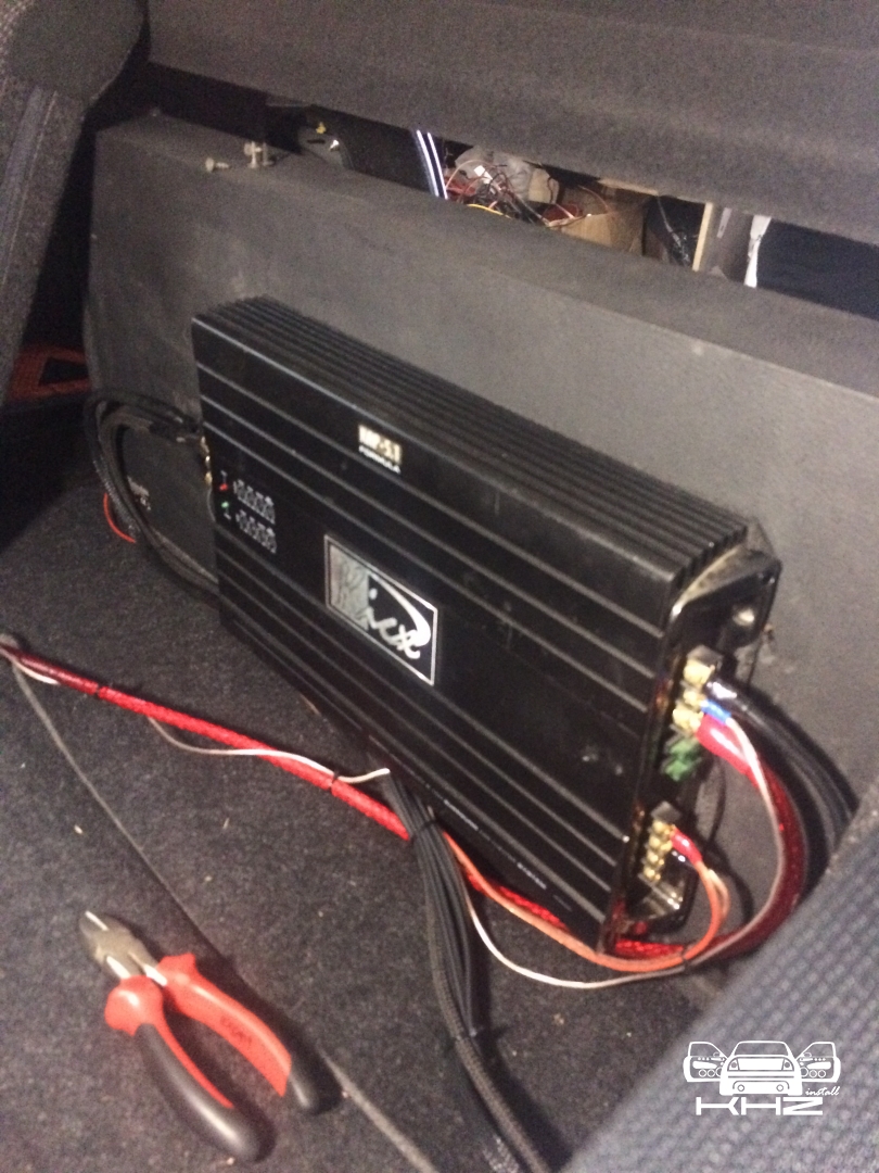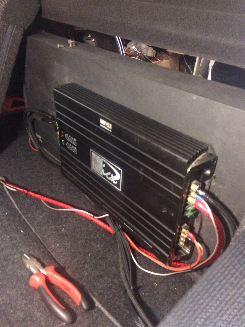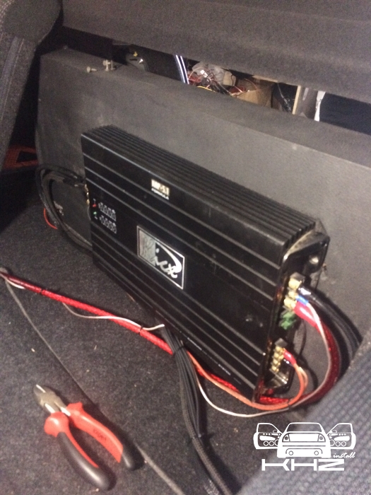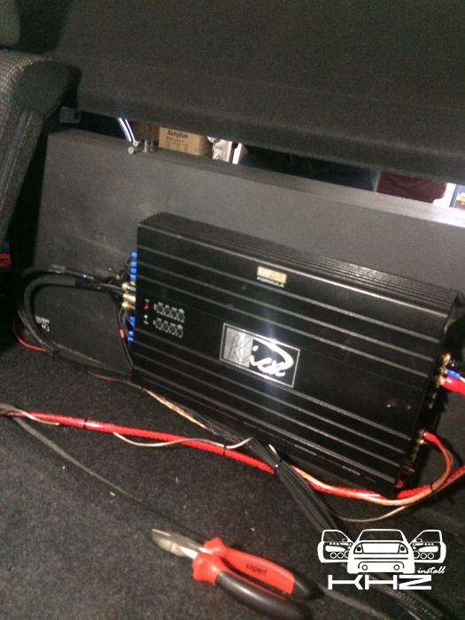 Проводимо акустичну проводку до підсилювача потужності і розводимо від кросовера до динаміків. Підсилювач потужності ми за бажанням замовника закріпили до корпусу сабвуфера, який розміщувався в багажнику, і ось проміжне фото розміщення і підключення підсилювача звуку.