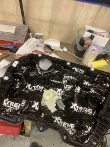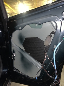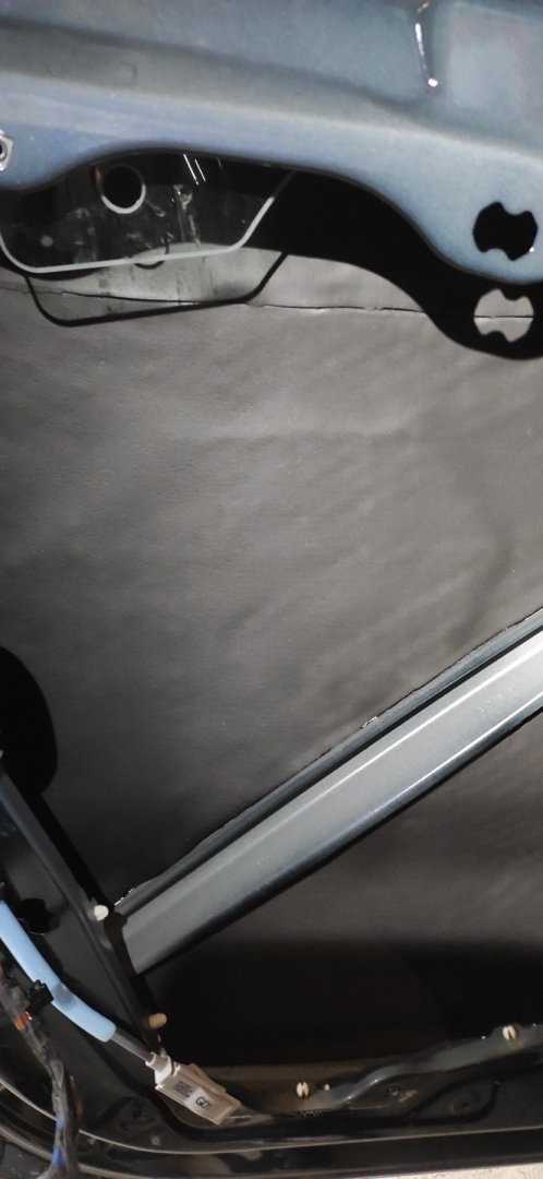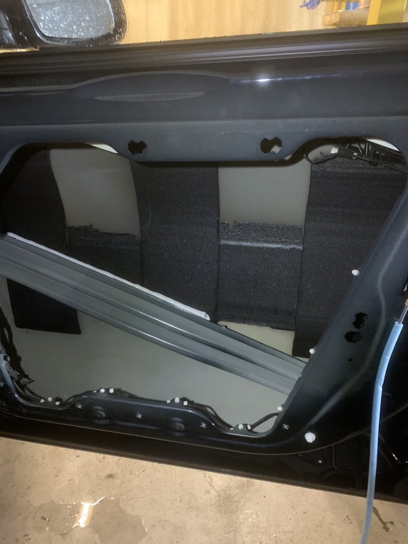 Ми обклеюємо полегшеними та якісними матеріалами бренду Acoustics, високої лінійки – до речі подивіться як все-таки непогано обезшумлені двері – багато штатного герметика нанесено і на щиті ще є ватин, який допомагає гасити шум, але ми доопрацюємо на 100 процентний результат. Обклеюємо перший шар віброізоляції, клеїмо в нахлест щоб були ребра жорсткості. Другим шаром шумоізоляції дверей BMW X3 G01 наносимо тепло-шумоізолятор SOft 6, він сендвічем гасить шум і працює як тепло-шумоізолятор: