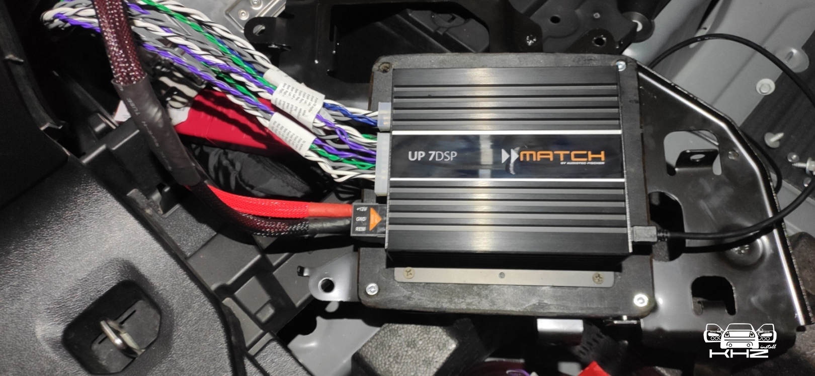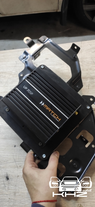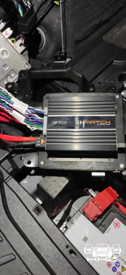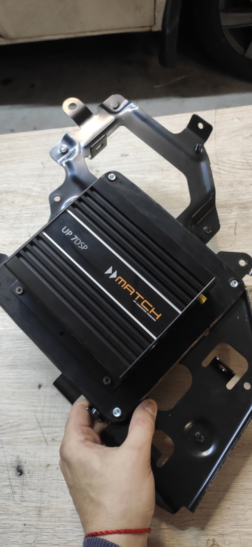 Ідемо далі, наступний етап - це серце нашої нової аудіосистеми в BMW X3 G01 - процесорний 7 канальний підсилювач MATCH UP 7 DSP, це якісний процесор і підсилювач 2 в 1 так би мовити, він і обробляє звук і налаштовує і посилює, що потужніше ніж штатний відсотків 50. Але ми не демонтуємо заводський підсилювач, оскільки без нього магнітола не видаватиме звук, вони як цільне, тому ми просто дублюємо сигнал і пускаємо його через новий підсилювач, процесорний підсилювач BMW X3 G01 встановлюємо поруч зі штатним, який стоїть у лівому крилі, і ми ставимо з внутрішньої сторони, через виготовлений подіум. Виглядає так:
