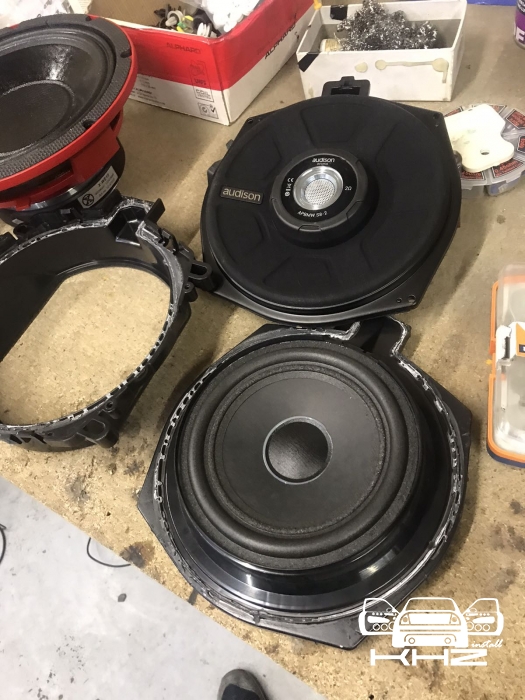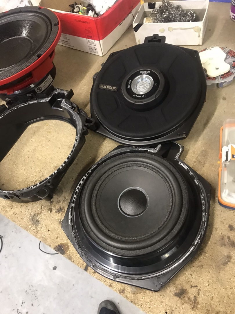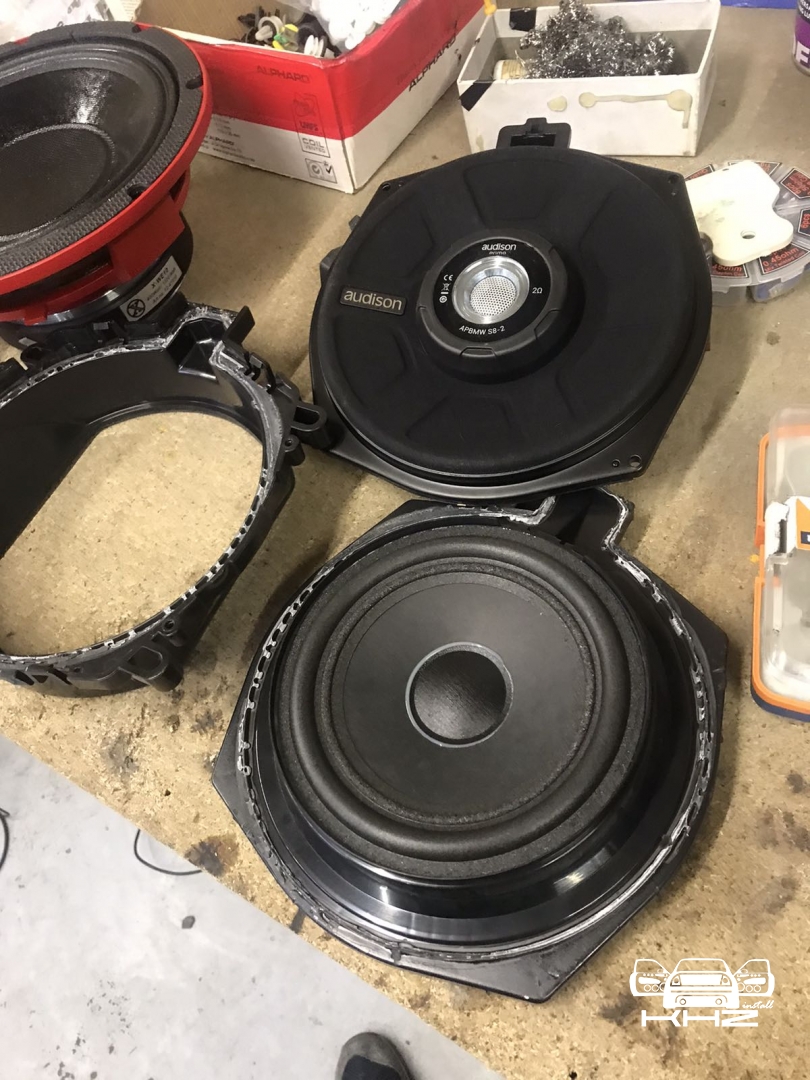 Акустику під сидінням вирішили міняти на Audison APBMW S8-2 - ці динаміки більші за рідні (8 дюймів) і мають опір 2 Ома, тим самим потужності з підсилювача зайде в них побільше. Динаміки такого типу треба переставляти в рідні пластикові проставки, перед цим їх бажано посилити віброізоляцією.
