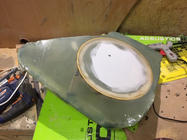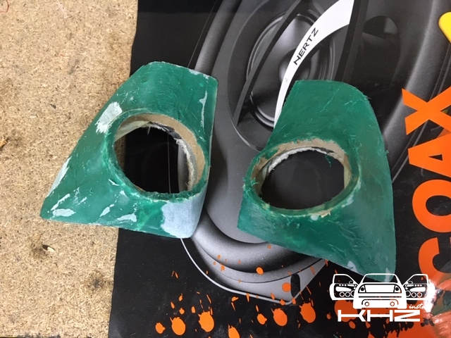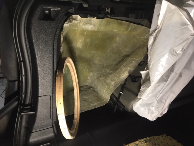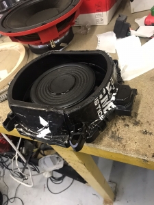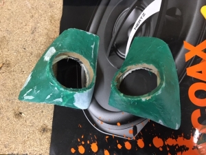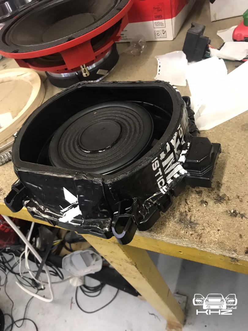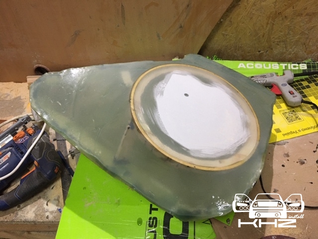 Далі накладаємо "мільйон" шарів :) щоб домогтися потрібної товщини стінки (це приблизно 7 мм), шпаклюємо і вирівнюємо лицьову частину. Далі закріплюємо на болти сабвуфер до кузова і встановлюємо динамік. Начебто все швидко, але в реальному житті ця процедура займає до тижня...