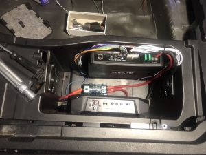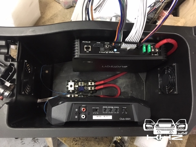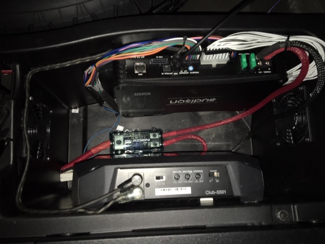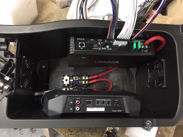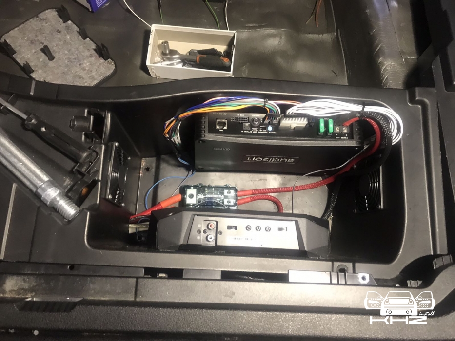 Для розташування підсилювачів знайшли зручну нішу під кришкою підлоги. У цьому ящику для інструменту якраз достатньо місця для двох невеликих підсилювачів. До речі, був би процесор окремим пристроєм, уже б напевно не вліз, тож величезний плюс у такому ноу-хау саме компактність. Ну і оскільки ящик досить тісний, то примусове охолодження тут необхідність. У нішу встановили високопродуктивний кулер для охолодження апаратури.