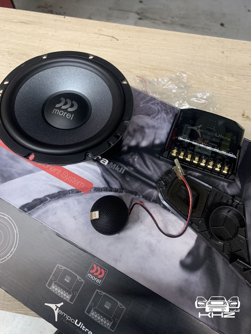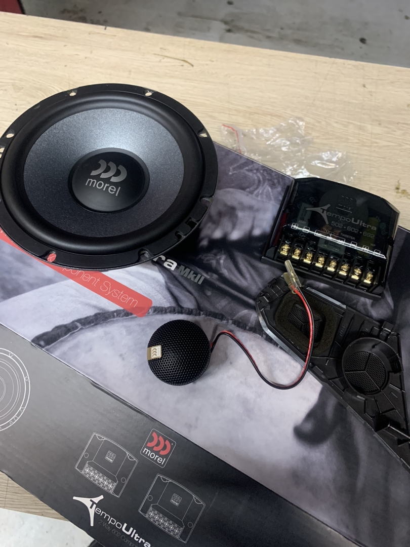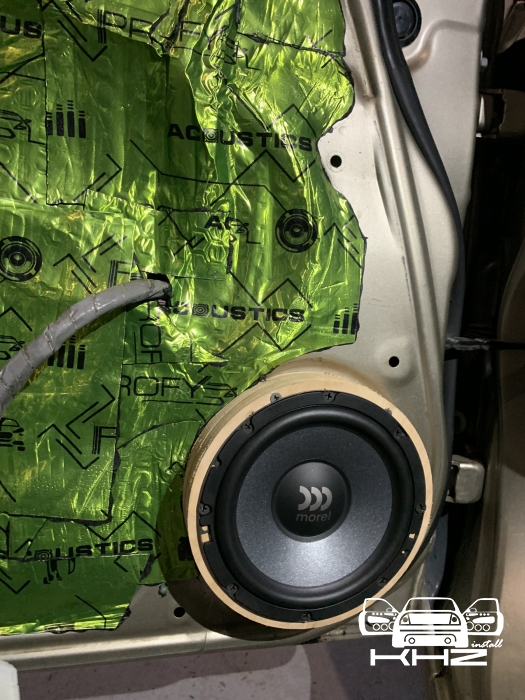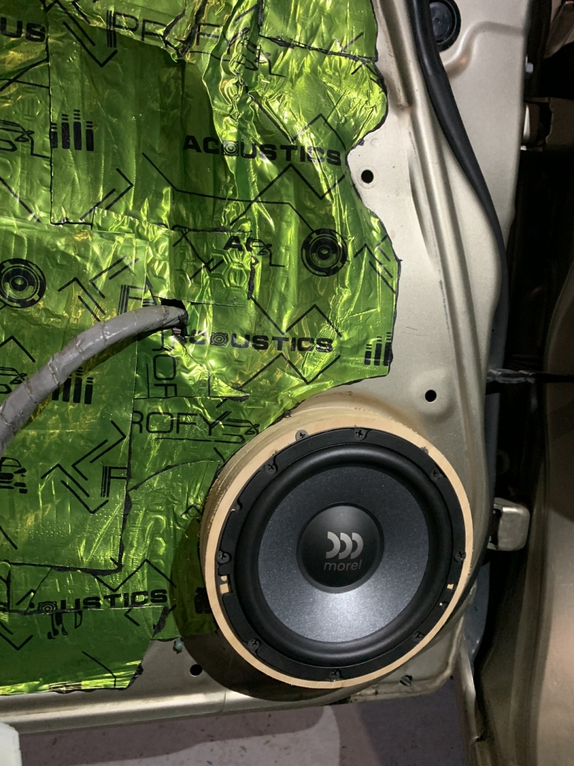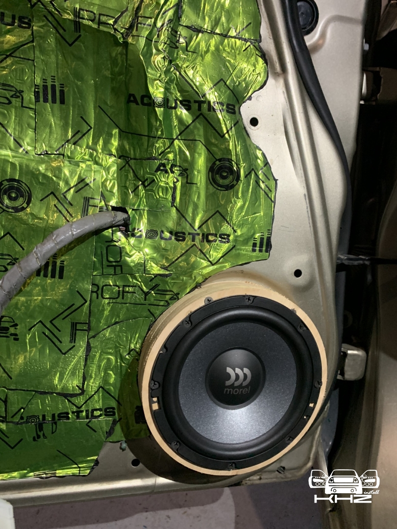 Далі йде установка акустики Honda Civic 4D, в даному автомобілі вже була встановлена акустика бренду Alpine - не високої лінійки, але по-перше вона не зрозуміє підсилювач - а по друге спереду стояли коаксіали з вбудованим твітером - і вся сцена була в ногах, а об'ємності звучання взагалі не було. По цьому фронтальну акустику ми мінятимемо - а та що стояла в полиці - залишиться, бо вона буде просто для підзвучки. На фронт ми встановимо хорошу компонентну акустику Morel Tempo Ultra 602 - це акустика високого класу з високою деталізацією звуку. Мідбаси встановлюємо в двері через проставні кільця з фанери, щоб магніт динаміка не заважав склу - так само перед цим ми ще в двері затягуємо нову акустичну проводку, так як потужність буде більше, а перетин кабелю там йде дуже тонкий. Виглядає так: