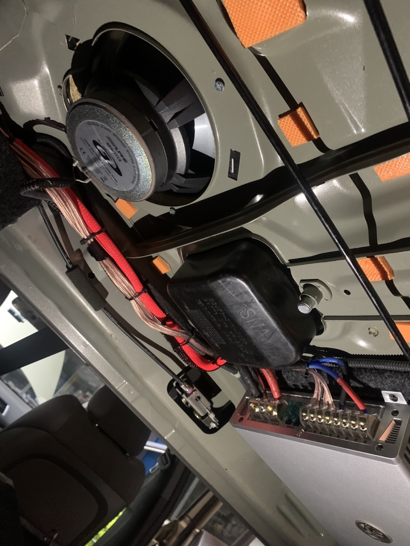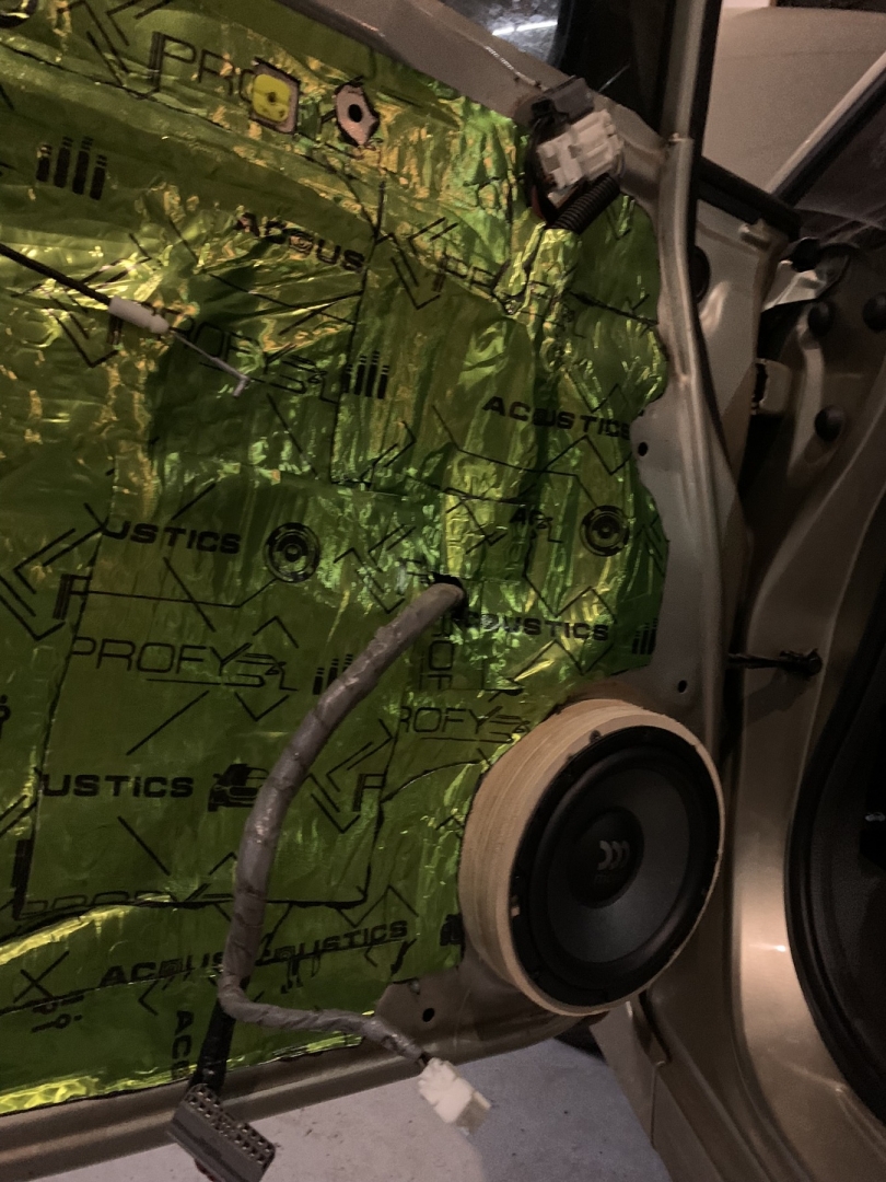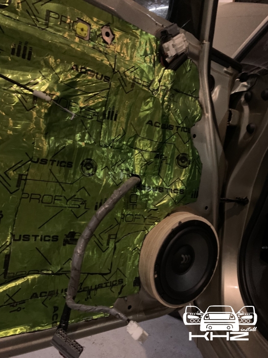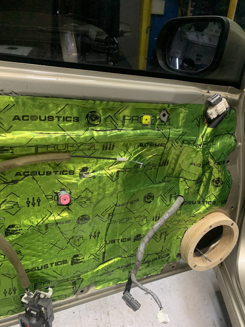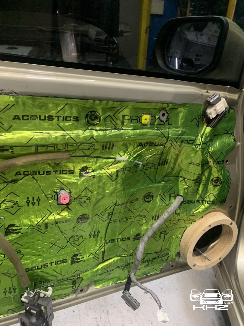 Почнемо, з того, що в даній комплектації навіть не було твітерів – які мають стояти під лобовим склом – дивно та огидно. Почнемо з легкої знешумки - замовник вибрав, так би мовити, легке аудіооформлення дверей, що це означає? Це не повна шумоізоляція – а лише зашивка віброізоляцією тієї частини дверей, де стоїть динамік, таким чином ми закриваємо двері та робимо об'єм для мідбасу – і він починає грати більш нижчим та збалансованішим, ніж з відкритими отворами. А також ми прибираємо резонанс від роботи потужнішого динаміка. Також ми підкочуємо віброізоляцією карту пластикову і затягуємо її м'яким матеріалом, щоб прибрати скрипи і погасити шум.