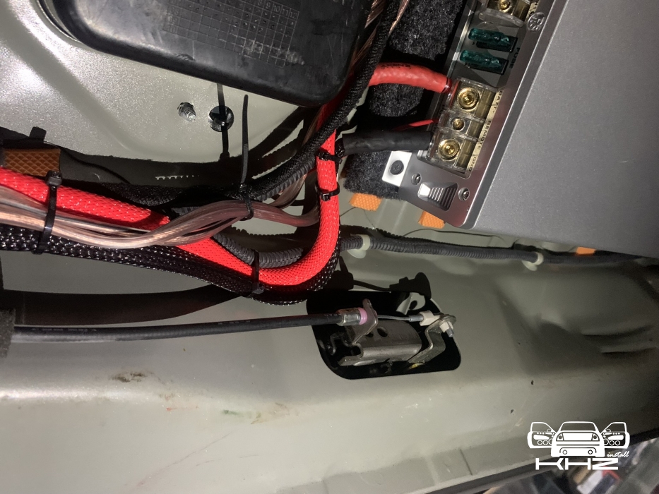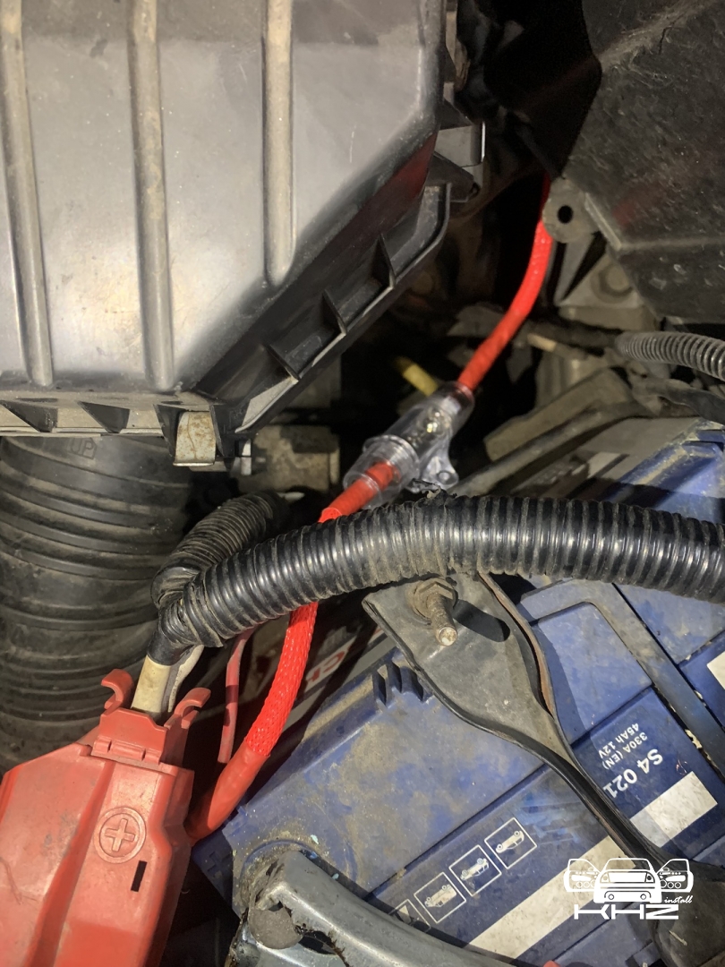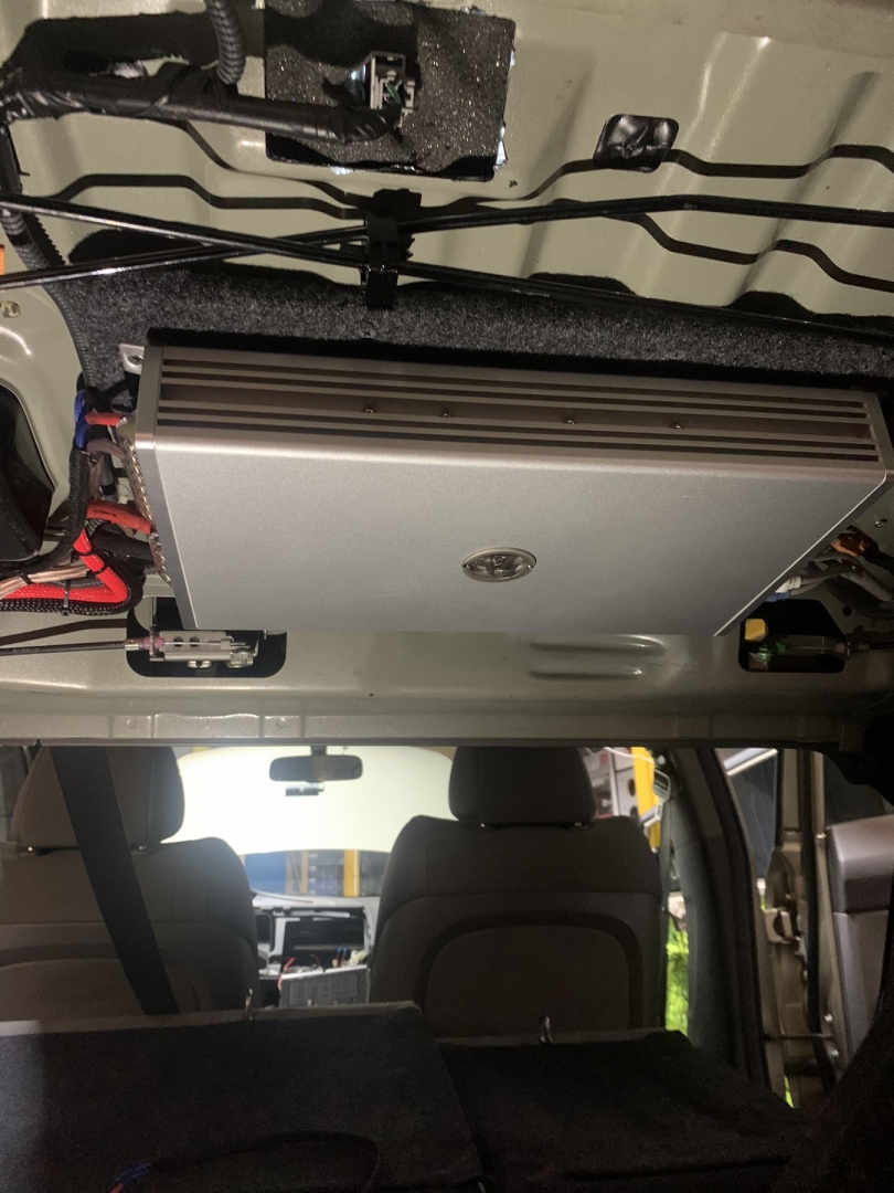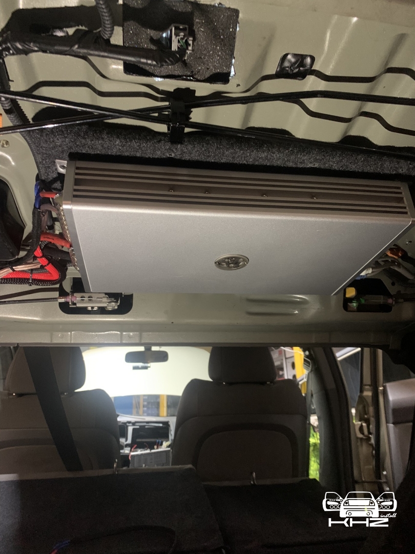 Далі у нас установка підсилювача звуку, для даної системи ми підібрали 3-х канальний підсилювач звуку DLS RM30 - в чому його плюс - це хороша ціна - друге сучасний вигляд - третє це характеристики відповідні тому за що платиш гроші. Це два підсилювача в одному - і хороший 2-х канальник і повноцінний моноблоб - підсилювач на сабвуфер - наше завдання прокачати фронт і сабвуфер, а тил буде грати від магнітоли - ми часто практикуємо дану схему, так як вона вона дозволяємо економити бюджет - і фантастичної різниці для водія немає, а найчастіше музику замовляють саме власники себе – вони знаходяться спереду. Для підключення підсилювача звуку в Honda Civic 4D ми простягли нові мідні дроти, як силові - так і акустичні, силові захистили в зміїну оплетку - щоб не перетерлися, так само проклали кабелі, що управляють, від магнітоли до підсилювача - все це добре уклали. Підсилювач звуку розмістили в багажнику під полицею - зробили подіум закріпили до кузова - а на нього вже підсилювач і дроти, виглядає так: