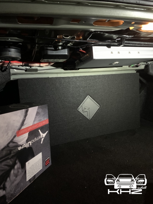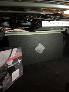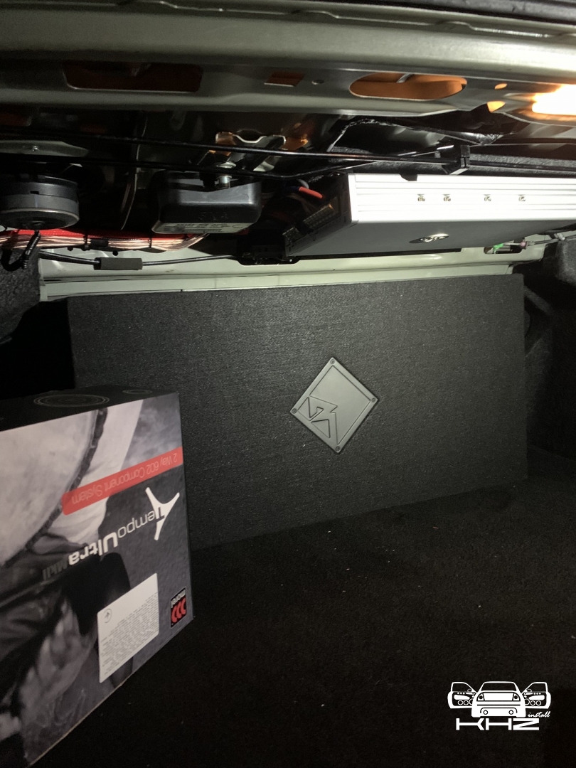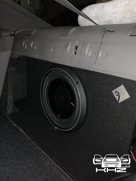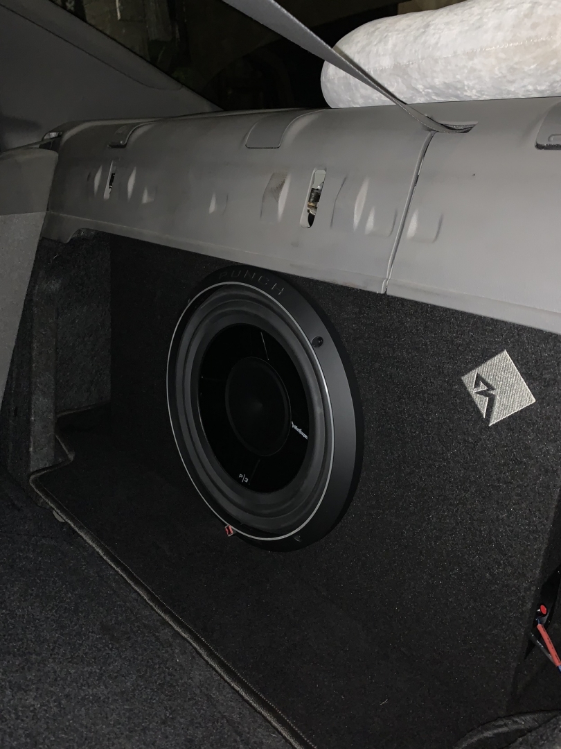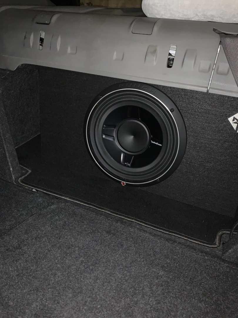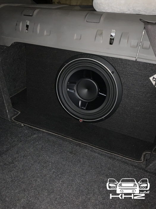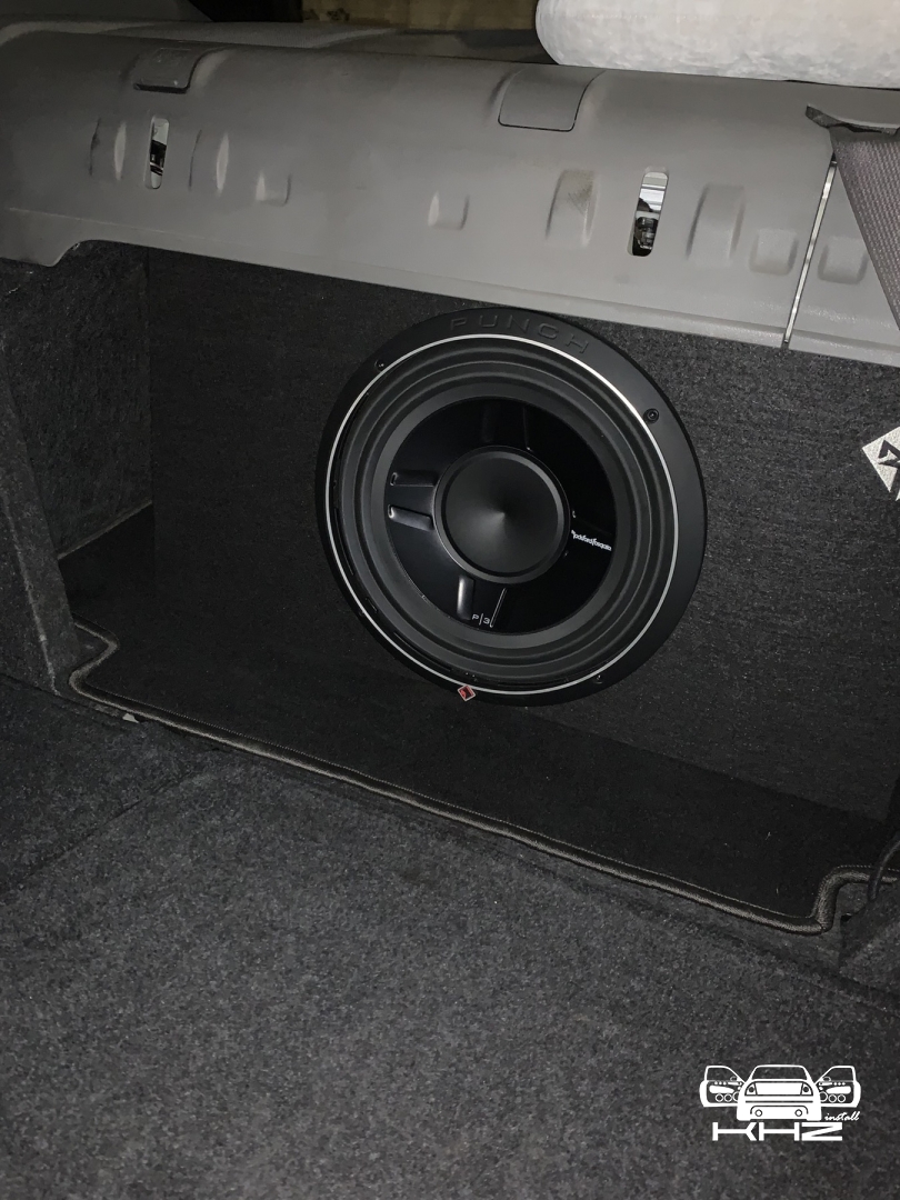 Сабвуфер у Honda Civic 4D був обраний не простою а плоскою конструкцією, тому що в багажнику лежала запаска - місця реально не було, ми запропонували плоску і перевірену модель від бренду Rockford Fosgate - крута модель і всього лише 15 см по підлозі глибина - причому це не впливає на його потужність і роботу, він продуманий із заводу так. Його підключили якісним мідним кабелем до підсилювача і набили на нього липучки, щоб він не літав багажником, а стояв приклеєний до підлоги. Сабвуфер у Хонду обраний розміром 12 дюймів – це 30см – не маленький, але він чітко став у багажнику під задніми сидінками – і самим сабвуфером ми його розгорнули у салон, а задня стінка дивиться у багажник – і так нічого її не зашкодить.