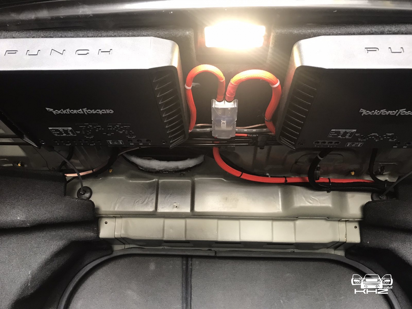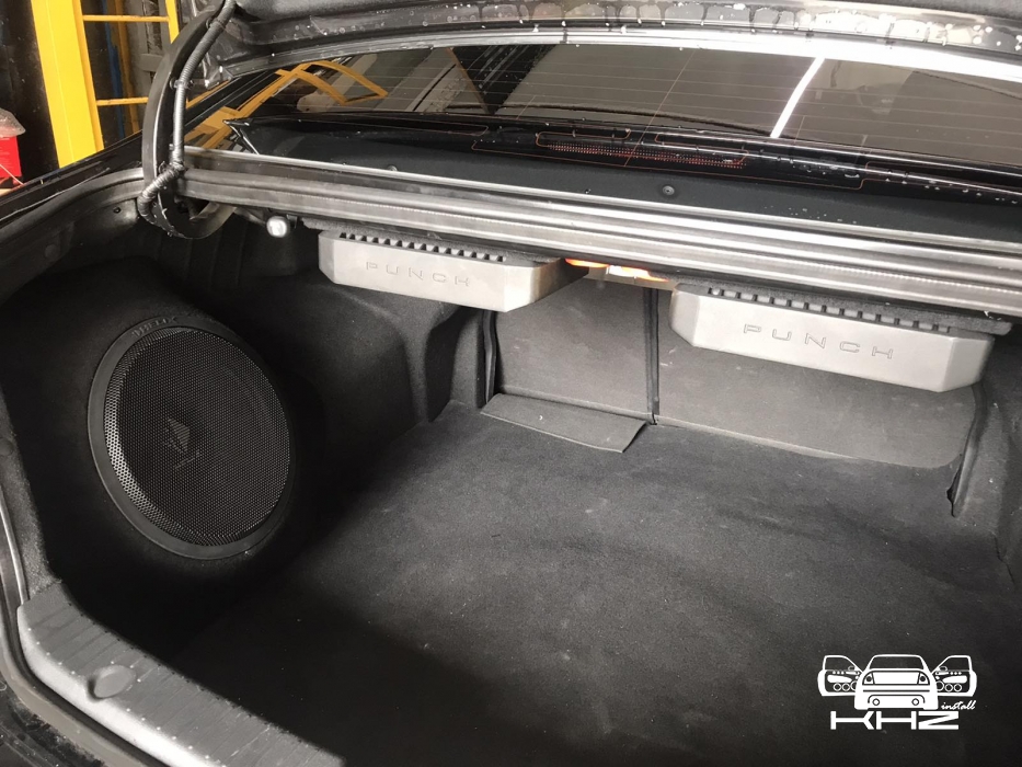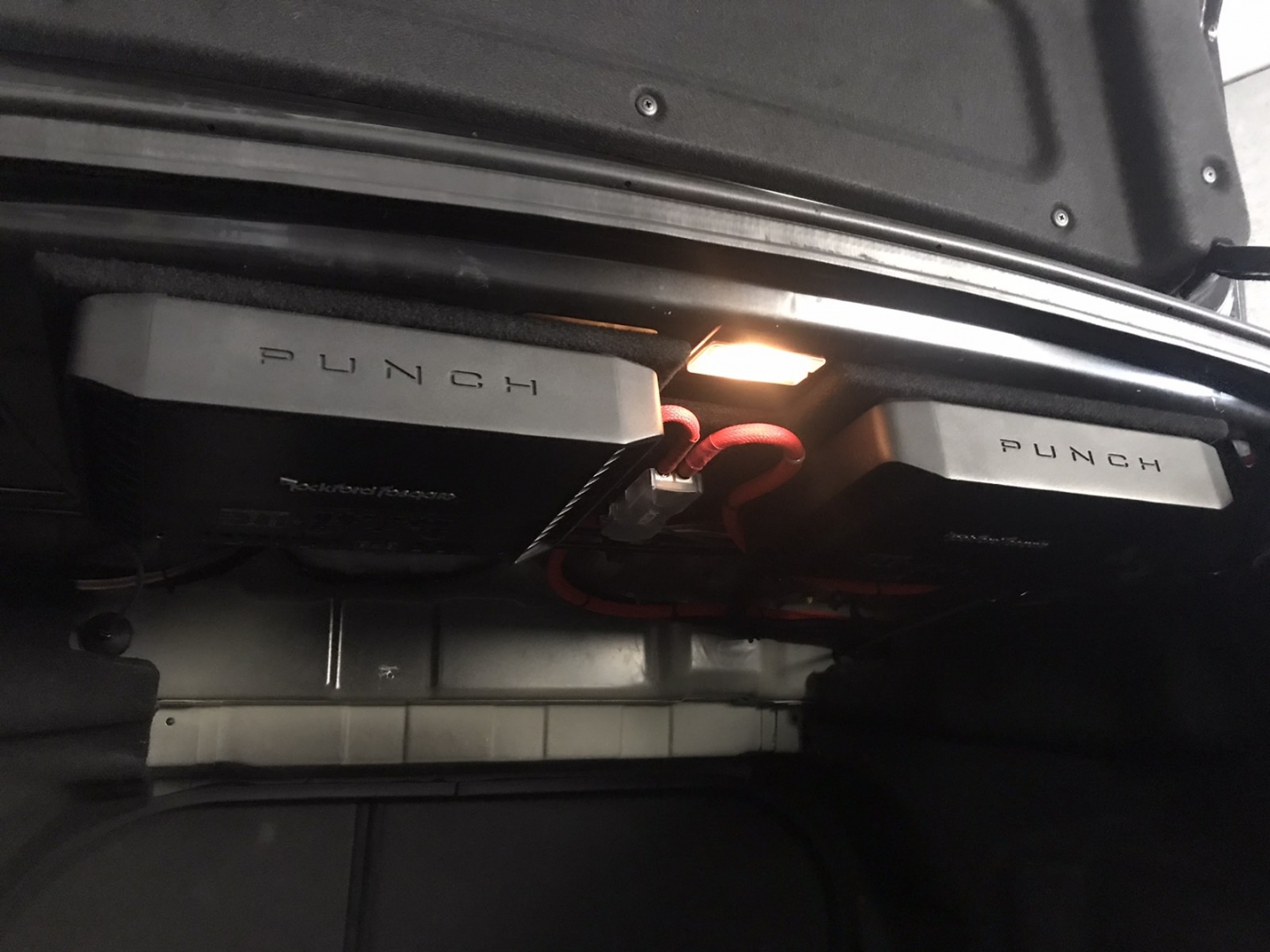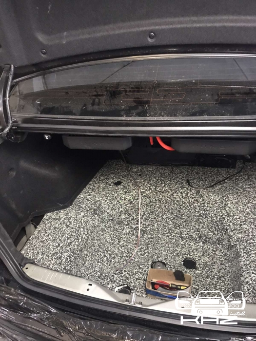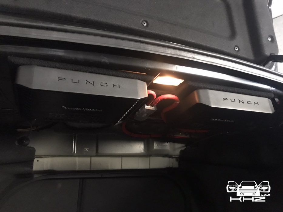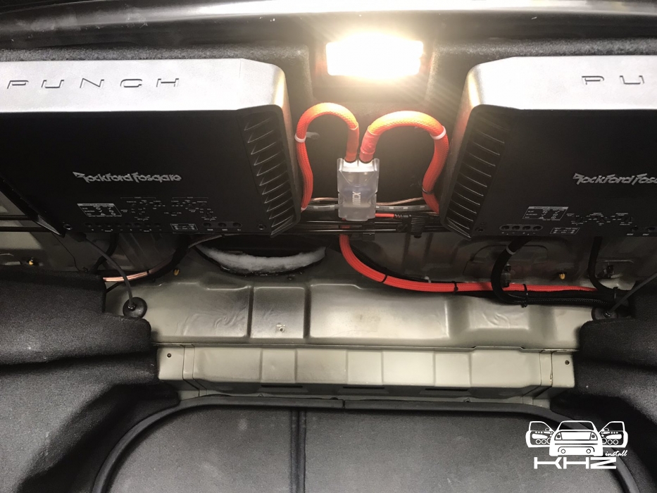 Встановлення підсилювачів звуку, ми кілька разів підбирали компонування і в підсумку прийшли до монобренду Rockford Fosgate PUNCH. Один підсилювач звуку в Hyundai Sonata YF - це 4-х канальний підсилювач і моноблок одноканальний - ці два підсилювачі однакові і в одному стилі, для їх встановлення ми виготовили подіум з фанери і перетягнули карпетом, закріпили його під полицею і до нього закріпили два підсилювачі звуку та розподільник живлення, гарно розвели проводку силову, акустичну і міжблочну. Підключили фронт і тил акустику через підсилювач і сабвуфер через моноблок, підсилювачі тут із запасом потужності.