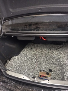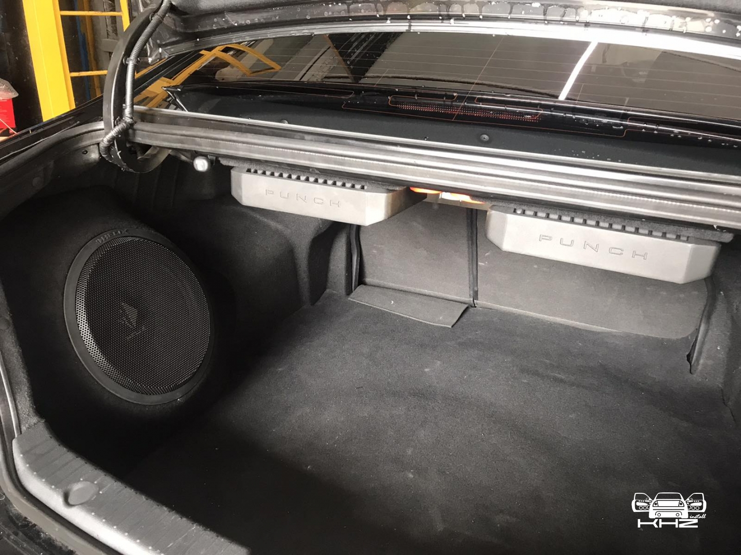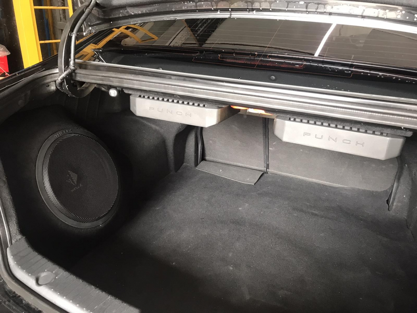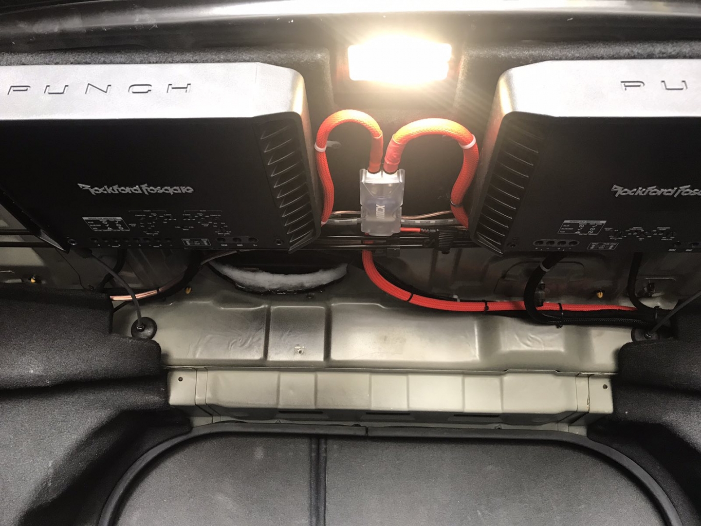 Встановлення підсилювачів звуку, ми кілька разів підбирали компонування і в підсумку прийшли до монобренду Rockford Fosgate PUNCH. Один підсилювач звуку в Hyundai Sonata YF - це 4-х канальний підсилювач і моноблок одноканальний - ці два підсилювачі однакові і в одному стилі, для їх встановлення ми виготовили подіум з фанери і перетягнули карпетом, закріпили його під полицею і до нього закріпили два підсилювачі звуку та розподільник живлення, гарно розвели проводку силову, акустичну і міжблочну. Підключили фронт і тил акустику через підсилювач і сабвуфер через моноблок, підсилювачі тут із запасом потужності.
