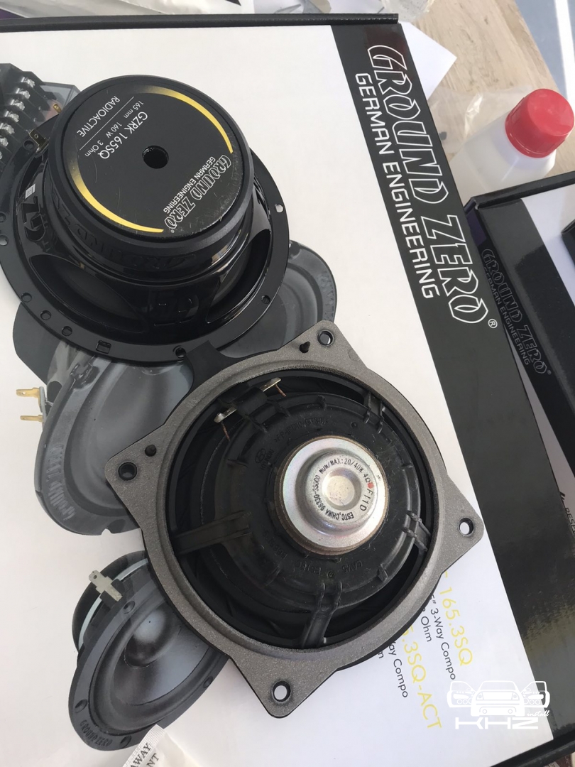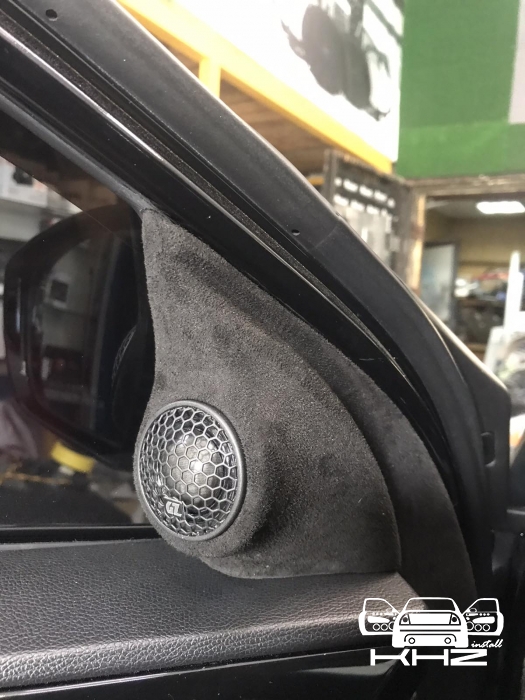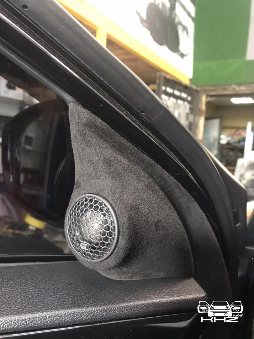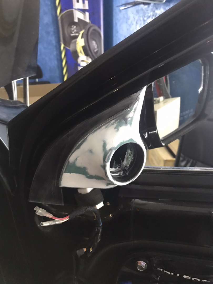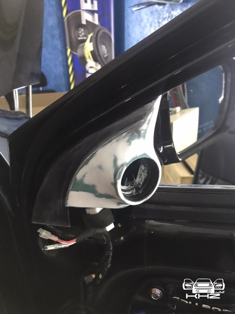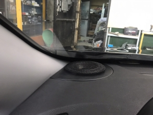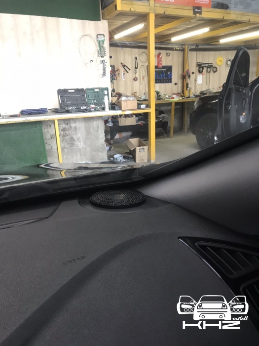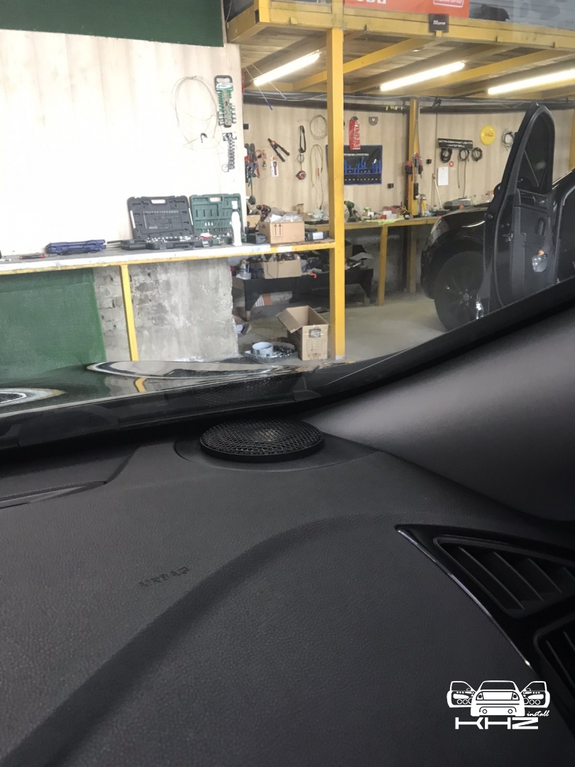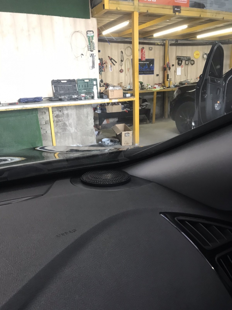 Стартуємо із заміною фронтальної акустики, в штатні місця можна встановити тільки 2-смугову систему, мідбас в двері і твітер в торпедо, але так вийде провал по середині, а ми зацікавлені цього не допустити - провал в АЧХ не найкраще що може бути. Тому ми будемо ставити 3-х компонентну акустику бренду Ground Zero GZRC 165.3SQ, мідбас встановлюємо через проставочне кільце, яке було виготовлено раніше у двері, та закріплене в штатні кріплення. Для всіх компонентів ми протягнули нову проводку до кросовера і від нього, це мідний кабель різного перетину. Оскільки в Hyundai Sonata YF у торпеді стоять не зовсім твітера, а щось середнє між сч і вч - ми туди хочемо встановити повноцінний середньочастотник, який під лобовим склом розкриє чудову сцену. Але в штатне місце він не влізе, тому що там мало місця - і в такому разі ми встановлюємо, а вірніше врізаємо його в захисну сітку від штатного динаміка, щоб зберегти місце розташування динаміка. І закриваємо його штатною сіткою від нового динаміка, виглядає це так: