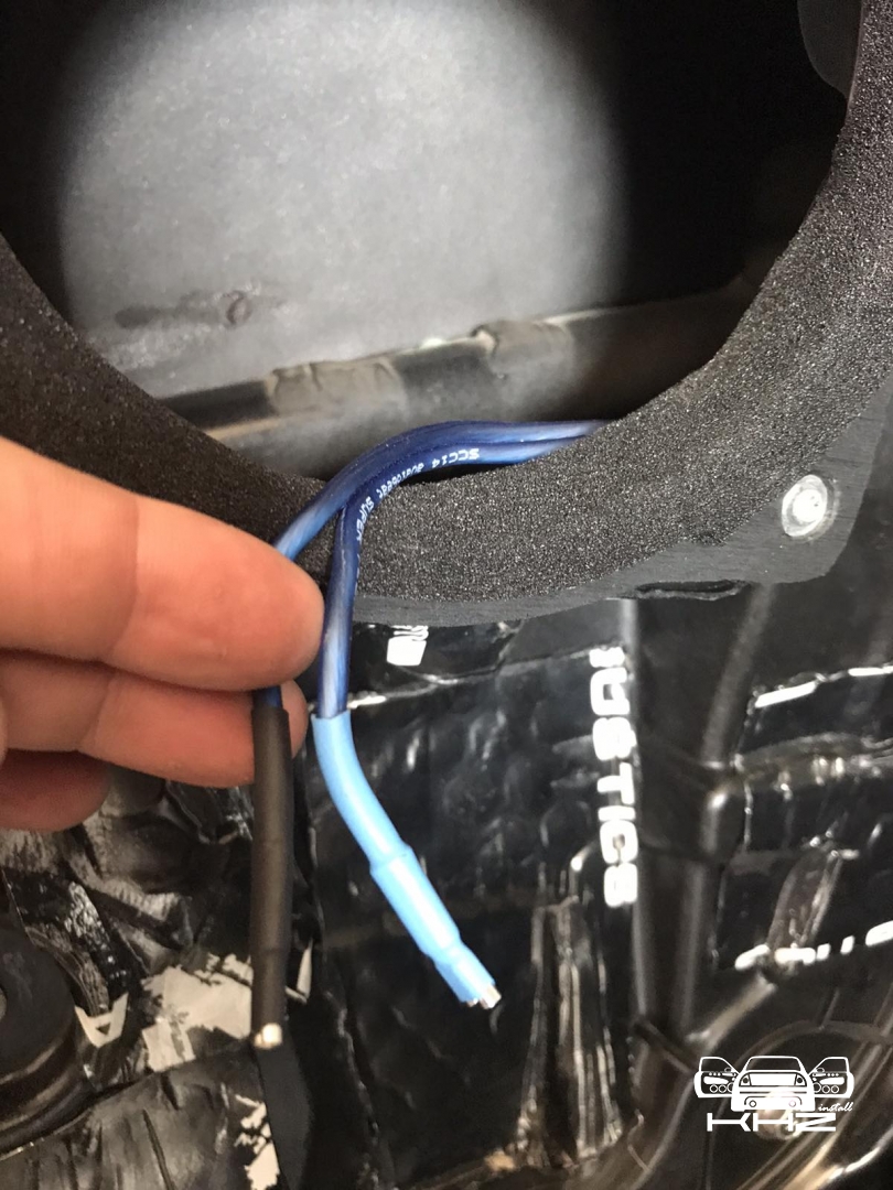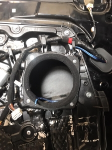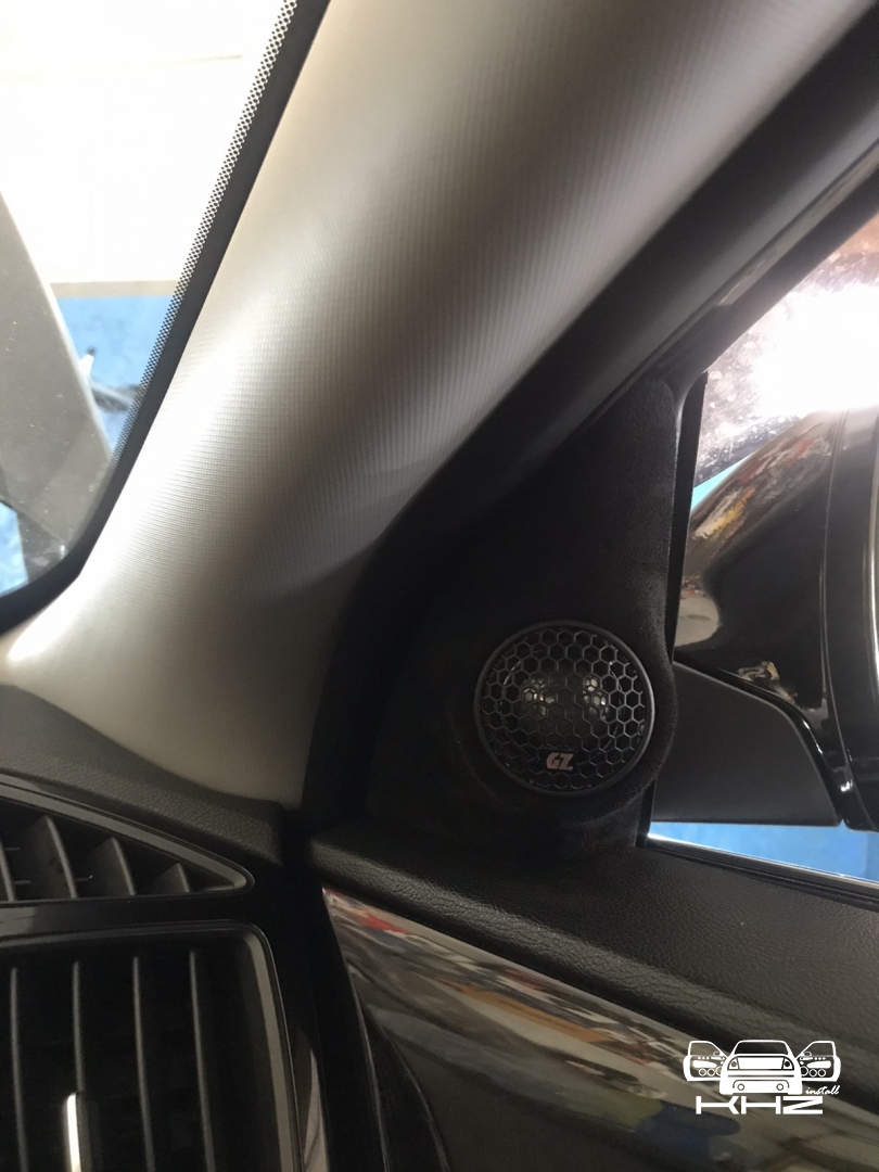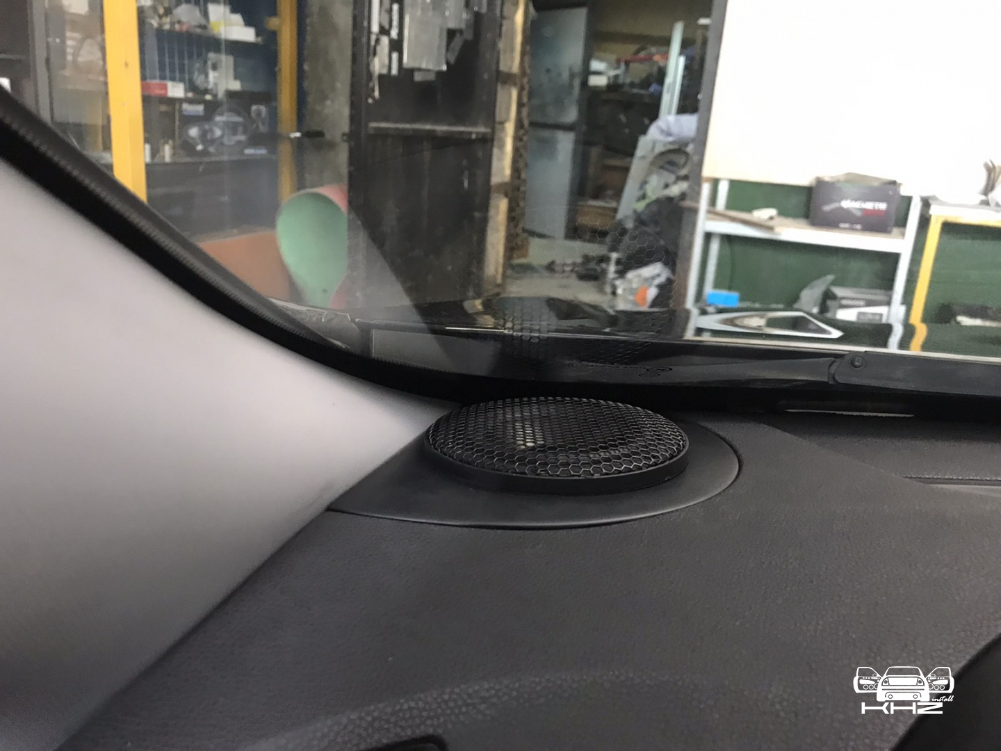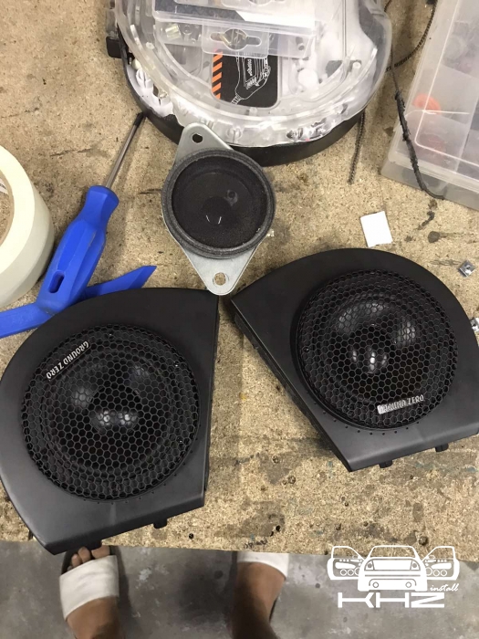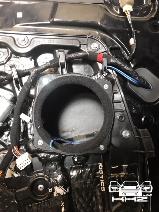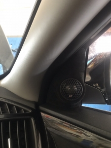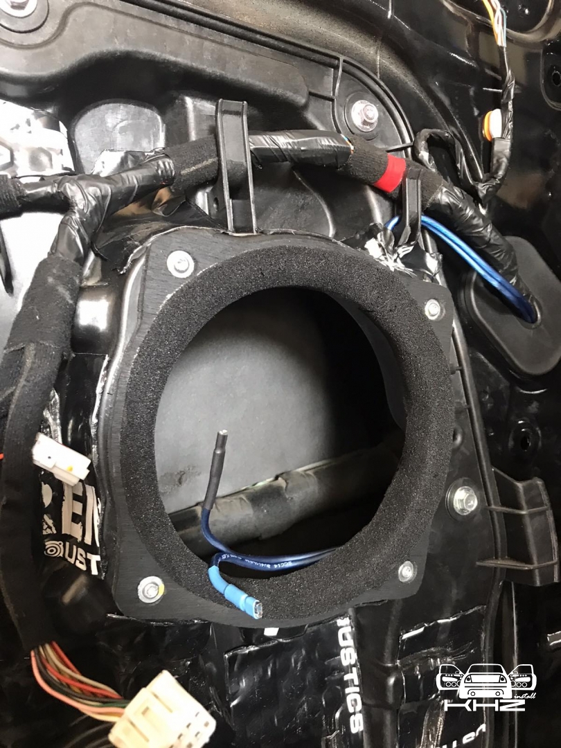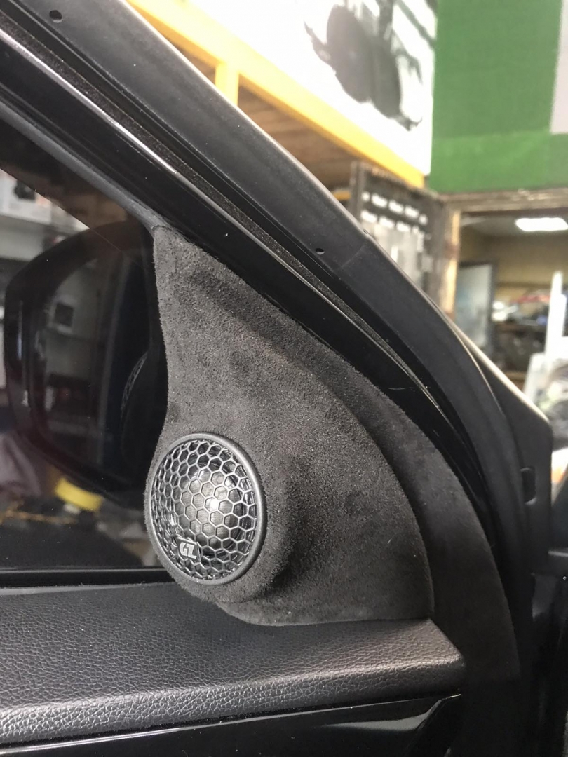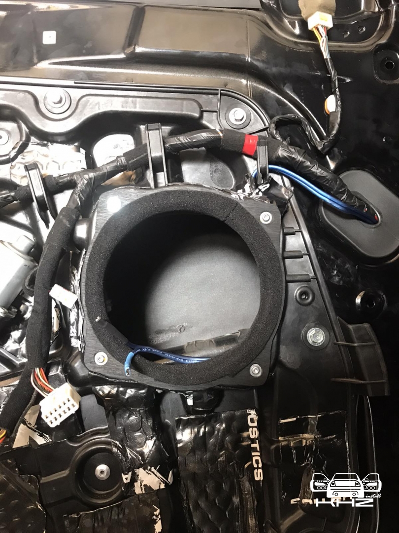 Стартуємо із заміною фронтальної акустики, в штатні місця можна встановити тільки 2-смугову систему, мідбас в двері і твітер в торпедо, але так вийде провал по середині, а ми зацікавлені цього не допустити - провал в АЧХ не найкраще що може бути. Тому ми будемо ставити 3-х компонентну акустику бренду Ground Zero GZRC 165.3SQ, мідбас встановлюємо через проставочне кільце, яке було виготовлено раніше у двері, та закріплене в штатні кріплення. Для всіх компонентів ми протягнули нову проводку до кросовера і від нього, це мідний кабель різного перетину. Оскільки в Hyundai Sonata YF у торпеді стоять не зовсім твітера, а щось середнє між сч і вч - ми туди хочемо встановити повноцінний середньочастотник, який під лобовим склом розкриє чудову сцену. Але в штатне місце він не влізе, тому що там мало місця - і в такому разі ми встановлюємо, а вірніше врізаємо його в захисну сітку від штатного динаміка, щоб зберегти місце розташування динаміка. І закриваємо його штатною сіткою від нового динаміка, виглядає це так: