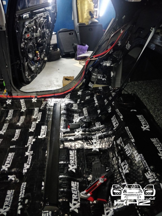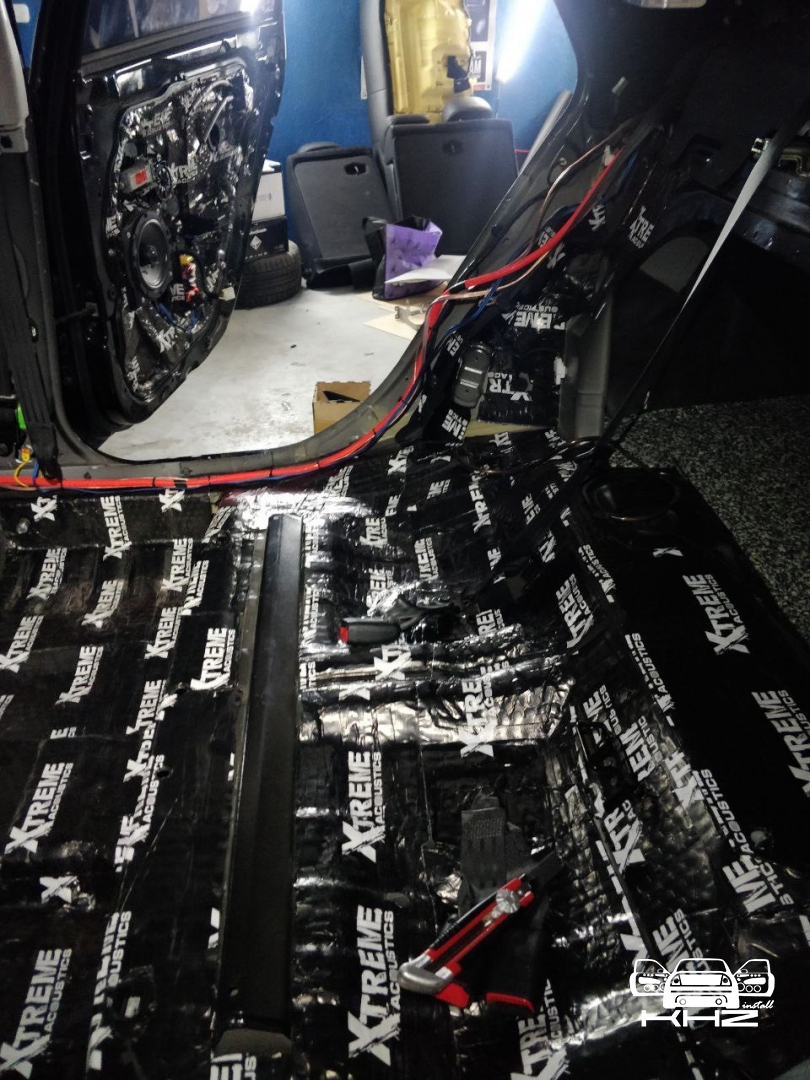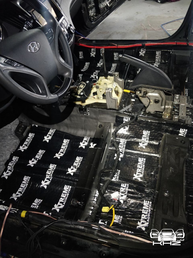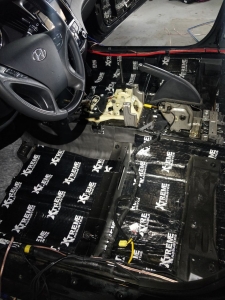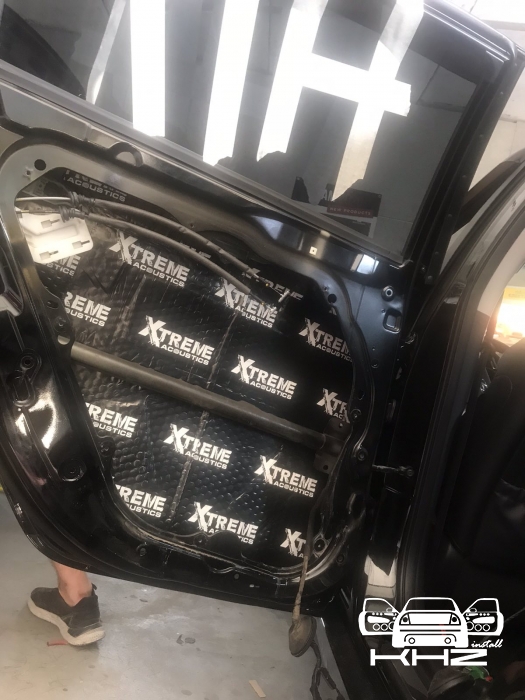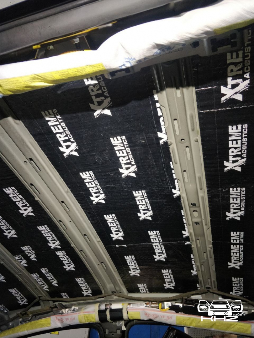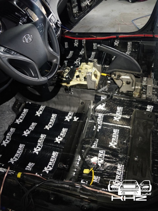 Стартуємо, перед побудовою аудіосистеми покажемо як ми зробили шумоізоляцію автомобіля, ми зробили автомобіль полегшеними матеріалами бренду Acoustics XTREME, всі елементи оброблені саме цією віброізоляцією та оброблені антискрипом і тепло-шумоізолятором. Двері зроблені в 4 шари, перший шар поклали на зовнішню частину дверей зсередини, матеріал товщиною 2.2 мм і добре укочений, на нього нанесли матеріал тепло-шумоізолятор Софт 6, який працює як термос взимку і влітку зберігає прохолоду довше. Третій шар шумоізоляції дверей Hyundai Sonata YF полягає в укладанні матеріалу на щит в дверях, він дуже рифлений, але це не завадило зміцнити його ще більше, і захистити від проникаючи звуку. І останній етап це підготовка дверної карти, вона армується шматками віброізоляції і потім затягується м'яким матеріалом пористим, щоб прибрати всі скрипи і тертя карти об елементи дверей.
