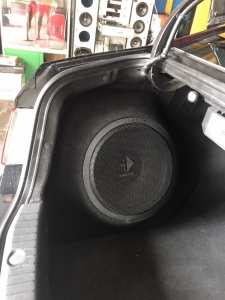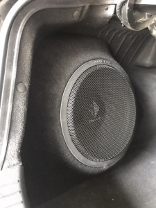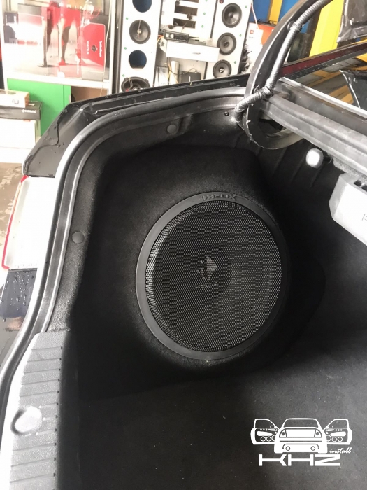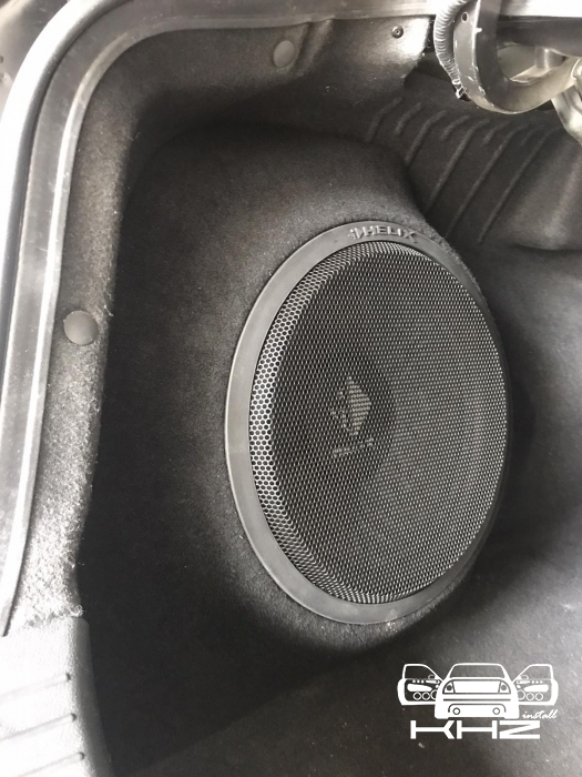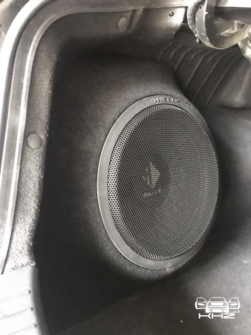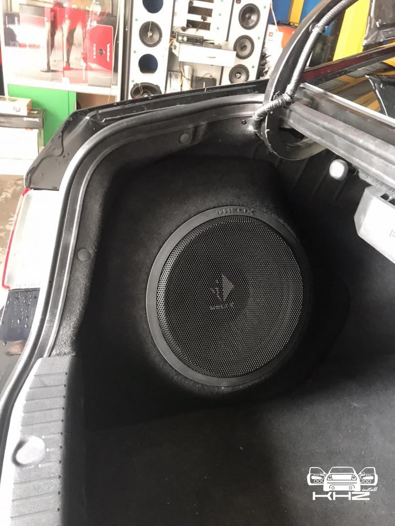 Так само у нас стояло завдання виготовити короб для сабвуфера вHyundai Sonata YF, такк щоб ергономічно в багажнику і так само був хороший бас, вирішили зробити сабвуфер стелс в лівому крилі під 30 см сабвуфер бренду HELIX, в чому перевага даного сабвуфера, він вимагає мінімальний обсяг в 23 літри, що дуже добре в обмежених інсталяціях, і так само йде захисна сітка в комплекті. Обклеїли крило скотчами і підготували до нанесення смоли і скломату, виготовили матрицю - потім обрізали гарно по краях, і виставили посадкове кільце з фанери, закріпили і сформували лицьову стінку з тканини, зміцнили її потрібною кількістю склотканини, щоб лицьова стінка короба була максимально жорсткою, як, в принципі, і весь короб сабвуфера. Далі шпаклівка і шліфування та виведення короба під перетяжку. Карпет підібрали максимально схожий за кольором з багажником. Короб закріпили до кузова автомобіля і встановили наш сабвуфер, який вийшов об'ємом 26 літрів.