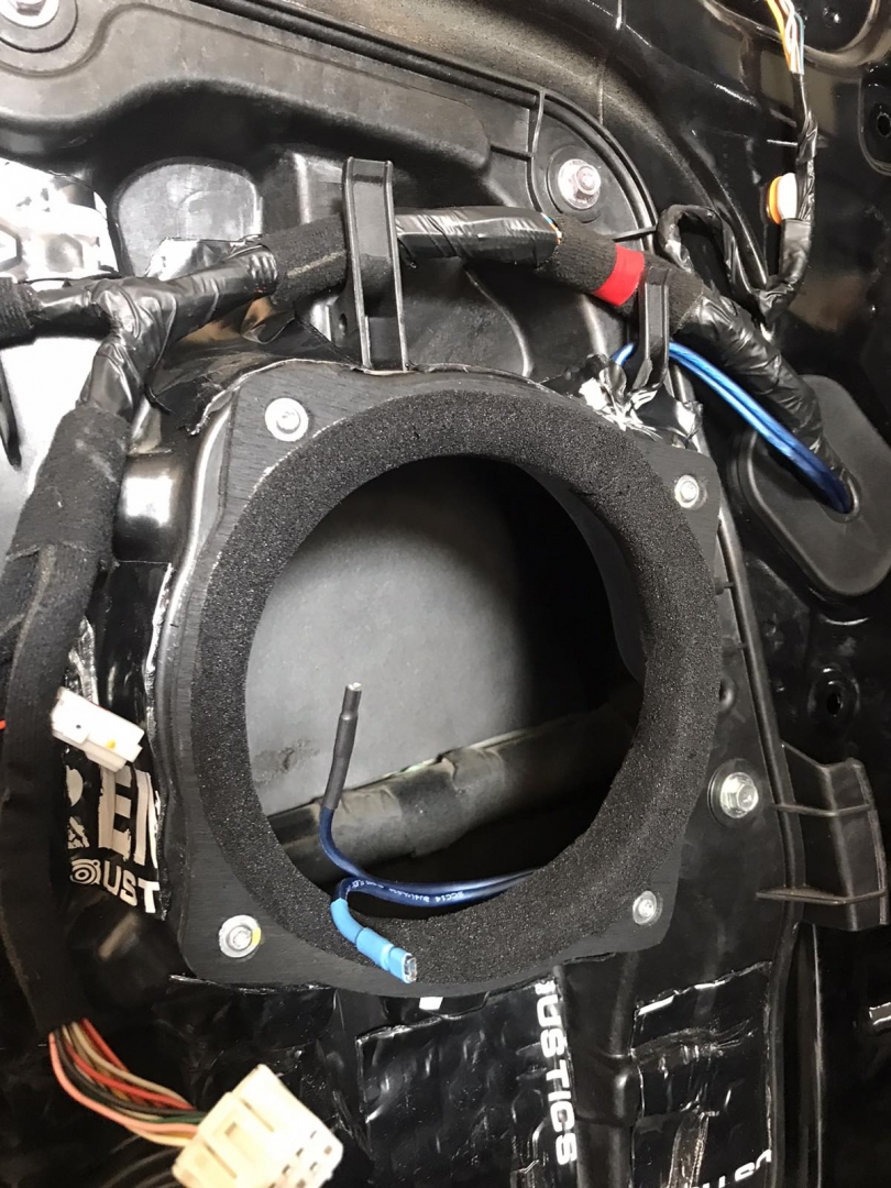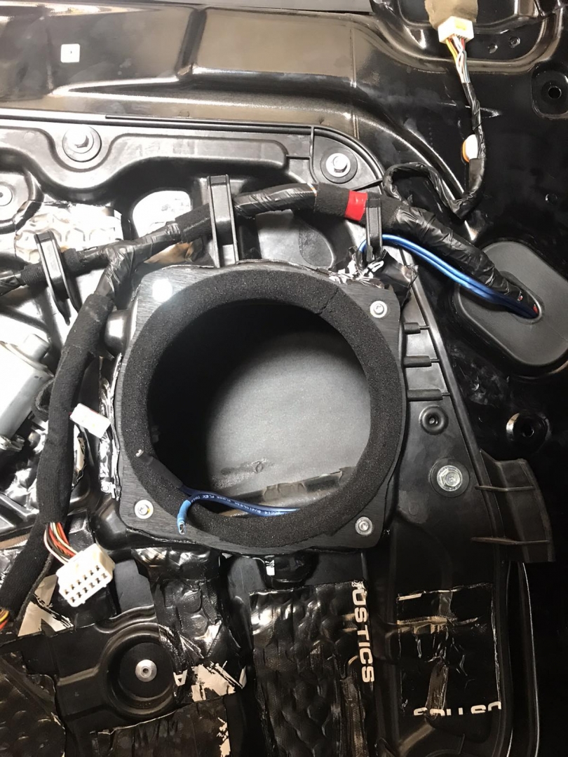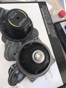 Задню акустику ми встановили коаксіального типу, оскільки динаміки розташовані високо по центру карти і немає місця для виносного твітера, задні динаміки підібрали бренду DLS 426 - це хороші коаксіали з глибоким звуком, динаміки так само встановили через проставки і завели новий кабель у двері. Шкода фото задніх не зберегли, але встановлені вони так само як і фронтальні.