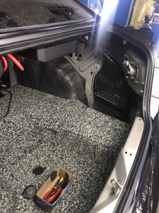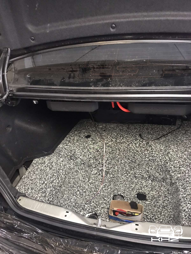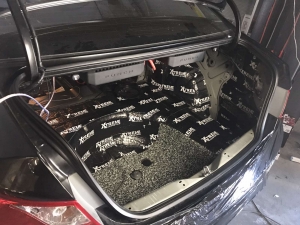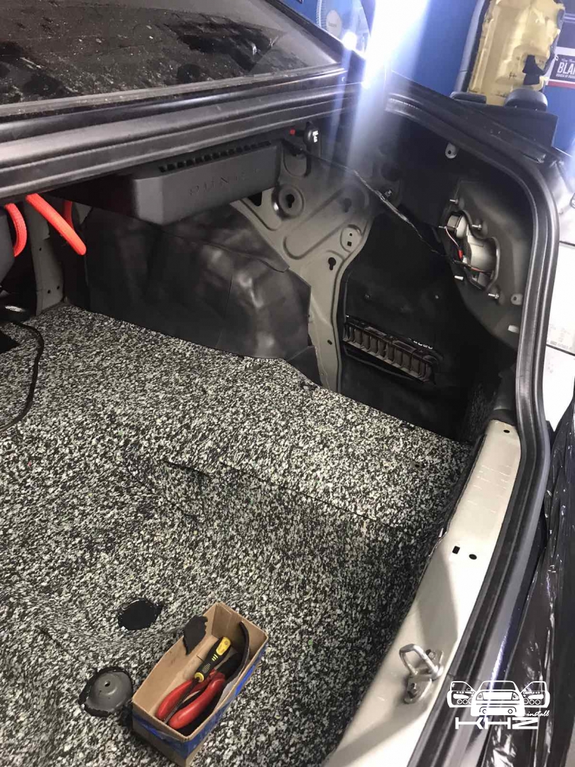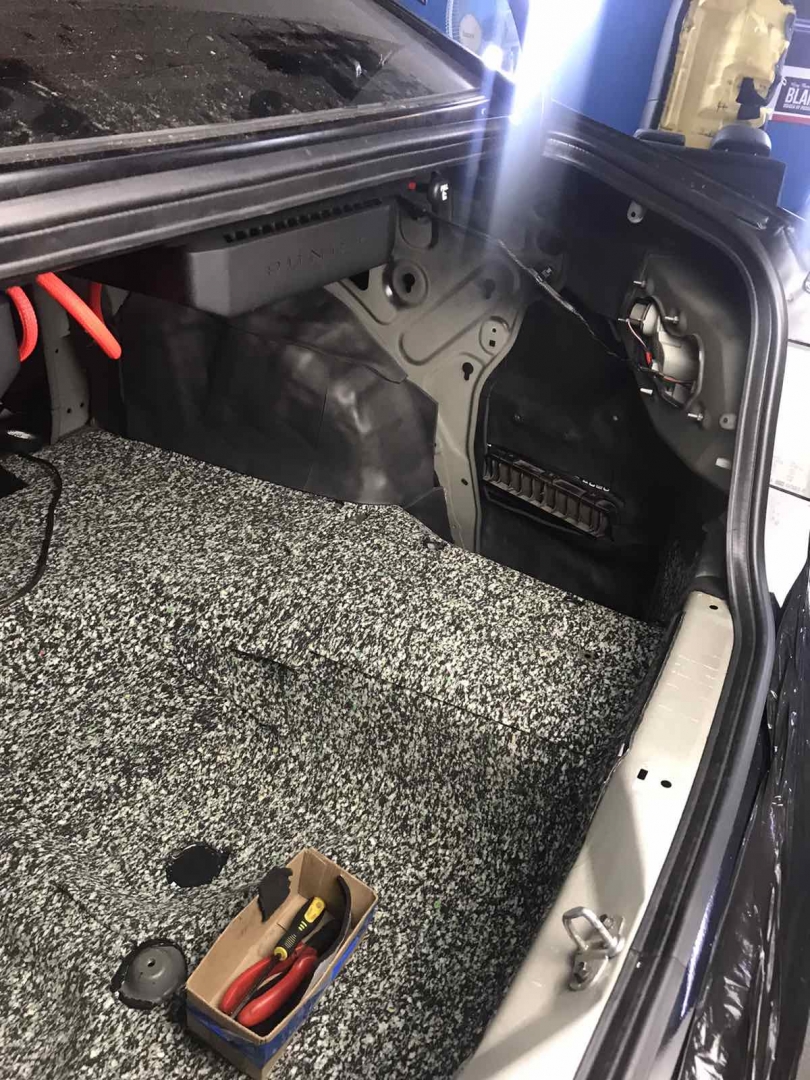 Ще у нас є багажник і кришка багажника, багажник ми так само виклеюємо повністю разом з колісними арками Hyundai Sonata і боковинами, щоб результат був максимальним і в машині не було зон, де шум потрапить всередину автомобіля. Другим шаром укладаємо на підлогу матеріал Фатон, це пресований паралон, оскільки в багажнику багато помилок і підлога, важливо не класти туди товстий матеріал, який під час збирання не дасть зібрати якісно обшивки і все інше, тому на підлогу ми поклали інший матеріал, а не такий, як у всьому авто. А ось на боковини і арки нанесли Софт 6, там де все добре по збірці. Кришка багажника була зроблена за такою самою схемою, як і весь автомобіль, щоб бути на рівні з іншими частинами кузова, і не деренчати від низьких частот, накладка на кришці багажника вся обклеєна м'яким матеріалом - від скрипів.