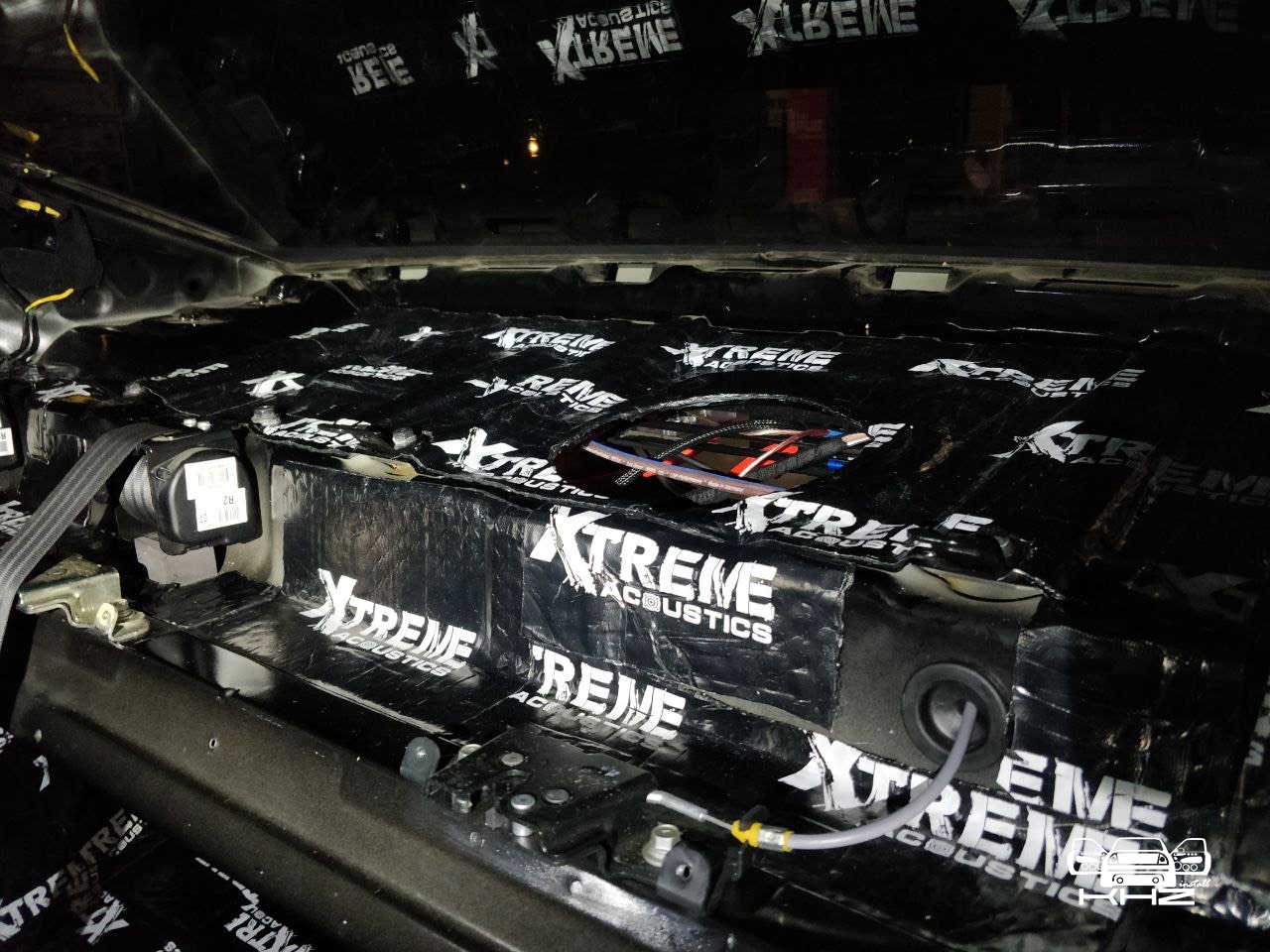 Так само обробили і капот Hyundai Sonata YF, зробили шумоізоляцію, але тільки віброізоляцією, оскільки там був щільний кожух на капоті, який би не став під час укладання нами м'якого матеріалу. До речі капот ми робимо часто - і він реально під час повної шумоізоляції автомобіля допомагає більш комфортно погасити шум мотора.