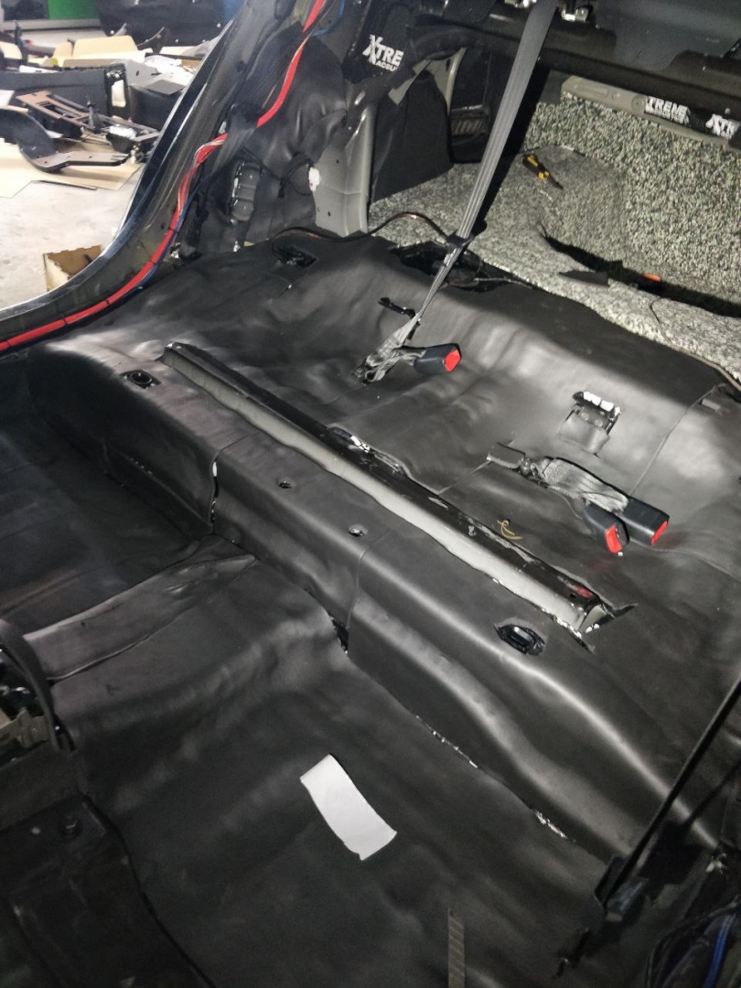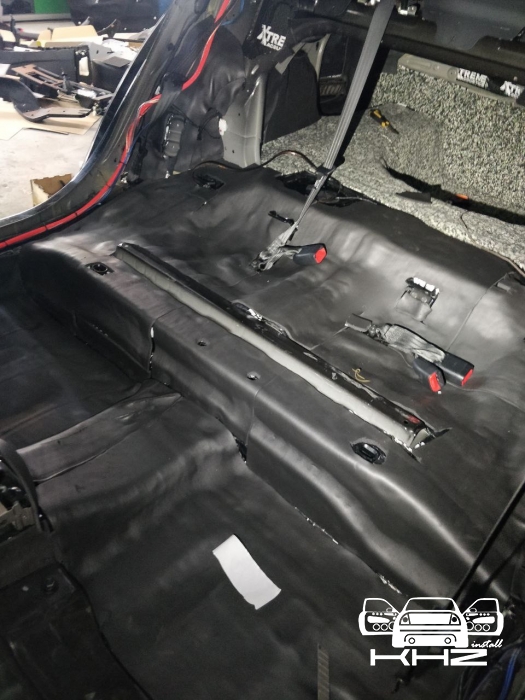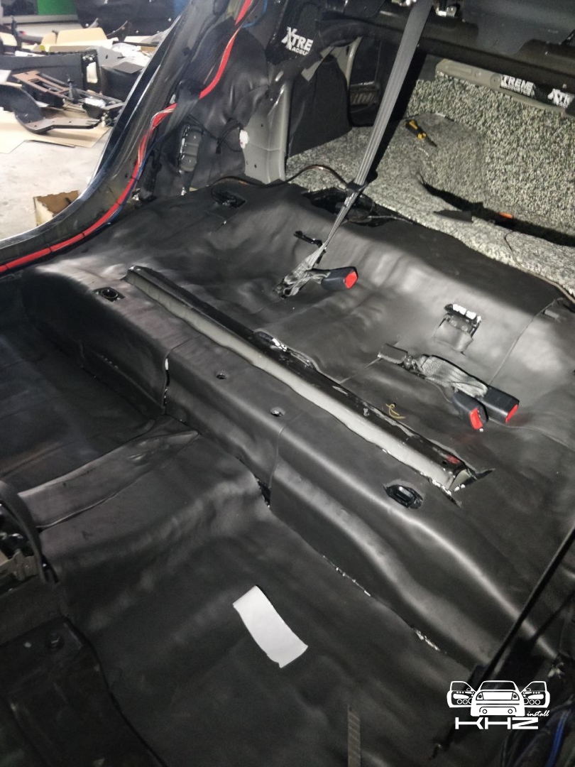 Наступний елемент це підлога салону і полиця, підлога разом з арками пропускає так само багато стороннього шуму, і ми його заглушимо, для підлоги і арок ми використовуємо матеріал більш товстий, щоб отримати максимально допустиме поглинання шуму, викочуємо все дуже ретельно і без пропусків, крім ребер жорсткості, заходячи на передні арки під самі педалі і так само заходячи в багажник і обробкою колісних арок ззаду. І після цього всі зони, де покладена віброізоляція, заклеюємо Софт 6, який використовували на всі інші елементи. Так само в салоні у нас є ще полиця - яка під час встановлення сабвуфера або просто на повністю тихій машині може дати сторонні шуми. Тому не пропускаємо її - і укочуємо віброізоляцією, а потім саму полицю, так само виклеюємо м'яким матеріалом, щоб зробити її тихою і стійкою до вібрацій і ям.