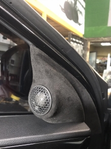 Для встановлення твітерів у нас не залишилося місця, і ми до цього були готові, для встановлення твітерів ми використовуватимемо куточки в дверях Hyundai Sonata, беремо посадкові кільця та виставляємо їх в куточках дверей в потрібному напрямку, що краще їх виставити, то кращий результат за звуком буде. Далі натягуємо тканину і формуємо лицьову частину куточка під твітер, зміцнюємо смолою і шпаклівкою і виводимо наждачним папером до ідеальної поверхні під перетяжку. Примірюємо куточки і відправляємо на перетяжку алькантарою і встановлюємо твітер, має такий вигляд: