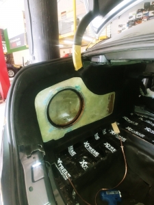 Тепер нашу систему для Мерседес прикрасить анатомічний сабвуфер у крилі за типом стелс, для цього виробу ми вибрали ліве крило, воно чудове за об'ємом, і нічого різати не потрібно. Короб стелс ми робитимемо під 25-сантиметровий сабвуфер бренду Helix, це чудовий сабвуфер, який потребує невеликого об'єму і чудово тримає потужність, а також має свій фірмовий захисний гриль, сітку. Для виготовлення короба зі скловолокна, ми обклеювали крило двома скотчами і готували автомобіль, щоб не забруднити. Виготовили так звану матрицю, це зліпок зі смоли і скломату, з яким далі вже працюватимемо без машини - машина потрібна для примірки тільки і встановлення готового сабвуфера. Далі нарощуємо товщину стінки майбутнього короба сабвуфера, і за допомогою посадкового кілка і спеціальної тканини формуємо лицьову стінку нашого короба, і намазуємо смолою і чекаємо висихання для подальшої роботи з нею. Після цих дій ми нарощуємо лицьову стінку доти, доки вона не стане потрібної товщини. Потім настає етап підгонки короба до обшивки багажника і виведення лицьової стінки до ідеалу, за допомогою шпаклівки. Виводимо і підганяємо ак щоб виріб здавався як штатний і за всіма зазорами був ідеальний до обшивки.