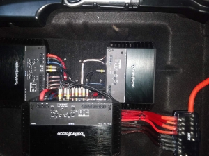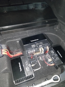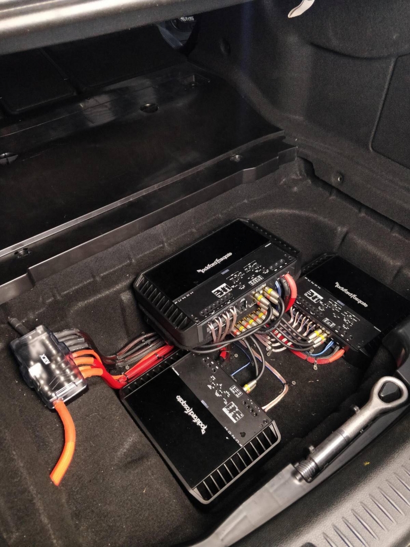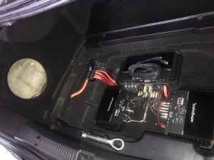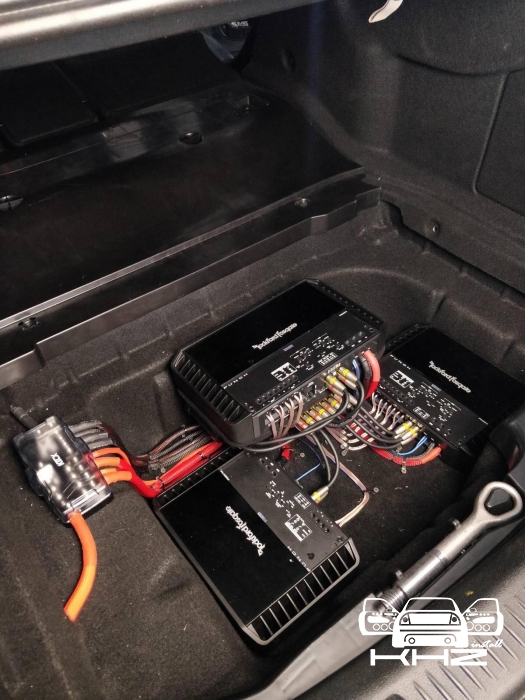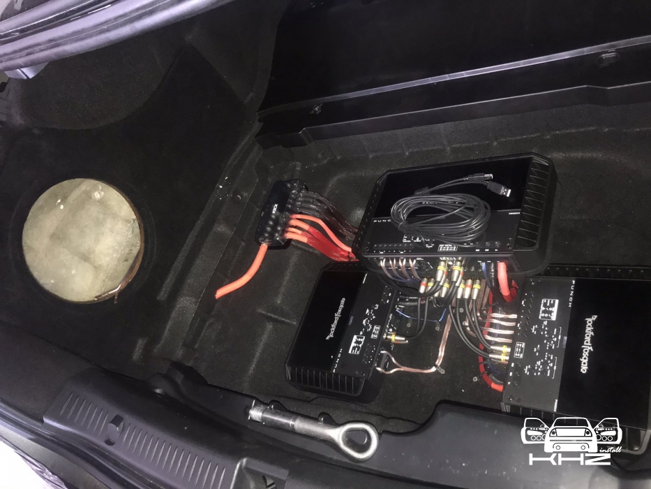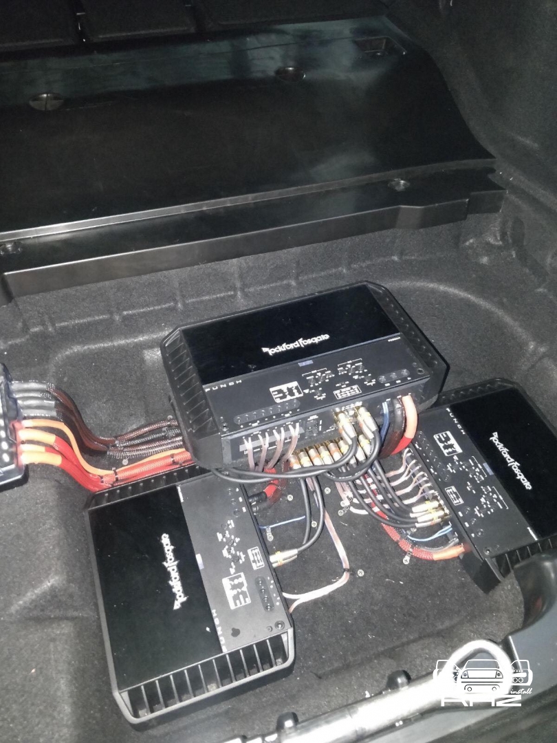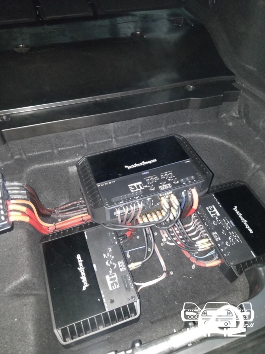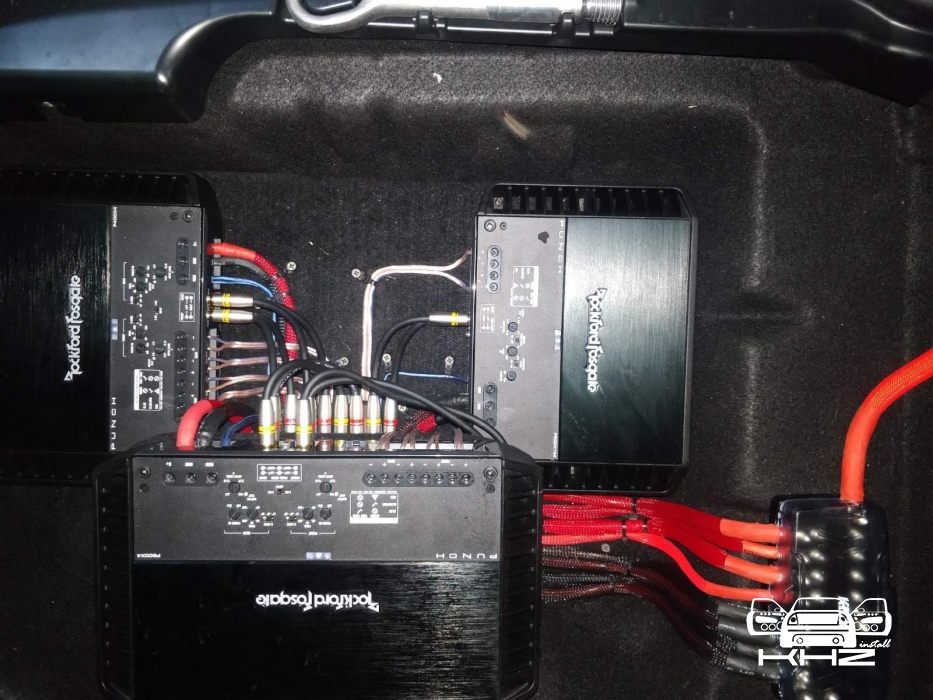 Усю нову проводку красиво укладено як по салону, так і у всіх видимих місцях, і закріплюємо, щоб все було надійно і на ямах нічого не злетіло. Тепер кілька слів про підсилювачі звуку Mercedes E-class, їх три штуки, один для мідбасів і задньої акустики потужніший, другий для передніх середньочастотників і твітерів, третій моноблок для сабвуфера, всі підсилювачі одного бренду і різної потужності, залежно від завдання. Всі підсилювачі звуку підібрані з запасом потужності, і підключені якісною мідною проводкою з двома поставми захисту проводки. Все встановлено в одному місці і легко дістатися до налаштувань в разі підвищення потужності або доп. налаштувань з часом. Бренд підсилювачів обраний перевірений і один з наших улюблених - це Rockford Fosgate Punch серії.