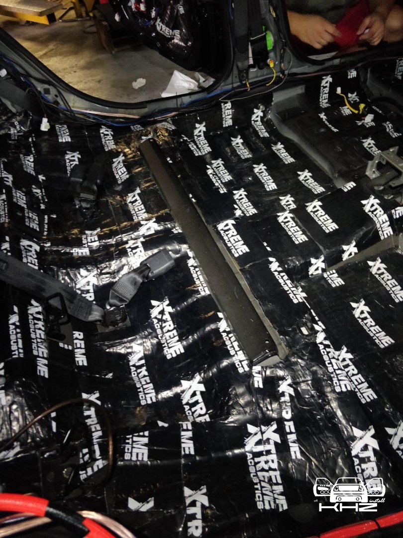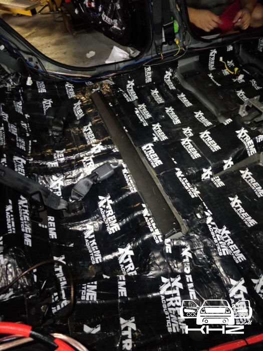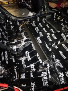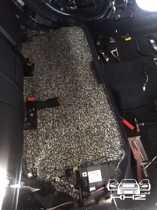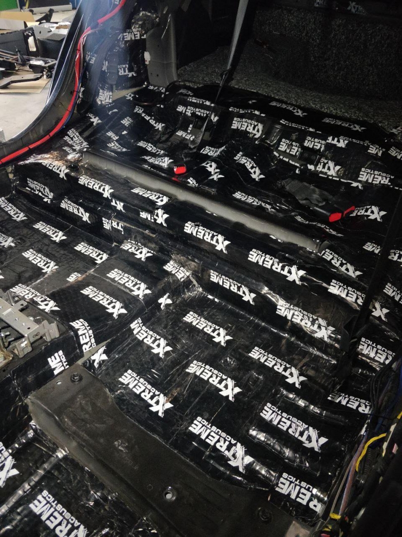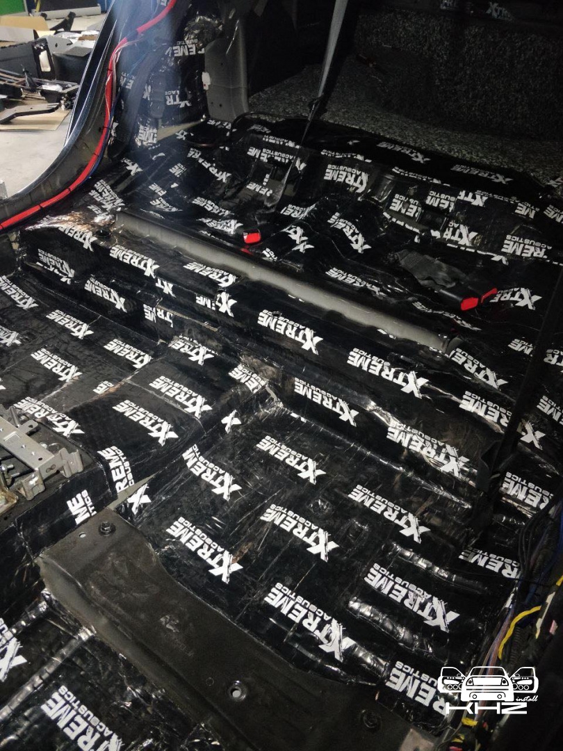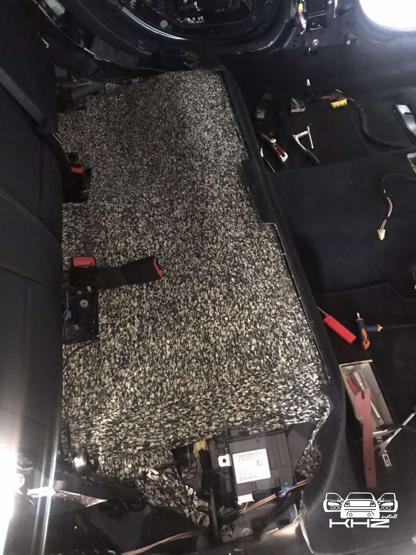 Переходимо до підлоги, підлога - один із найбільших провідників шуму, оскільки передає сильний шум від дороги і коліс, а також вітер, який свистить під час набору швидкості і залітає під днище автомобіля. На підлозі як завжди є трохи штатної віброізоляції, але ці часткові нанесення - не працюють добре, ми це виправимо! Обклеюємо 100 відсотків підлоги, крім ребер жорсткості - і добре викочуємо, щоб матеріал ліг і повністю стикався з кузовом автомобіля, до речі, на підлогу автомобіля ми клеїмо товстішу віброізоляцію, щоб максимально погасити шум і гул. Другим етапом наносимо тепло-шумоізолятор софт, яким до цього обробляли всю машину, в деяких зонах, де дуже тісно або якісь елементи стають впритул, використовуємо пресований паралон, який тонший і там не можна щільніші матеріали використовувати, бо не зберете автомобіль потім якісно. Усе це має такий вигляд: