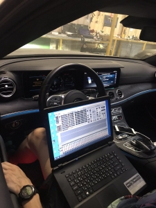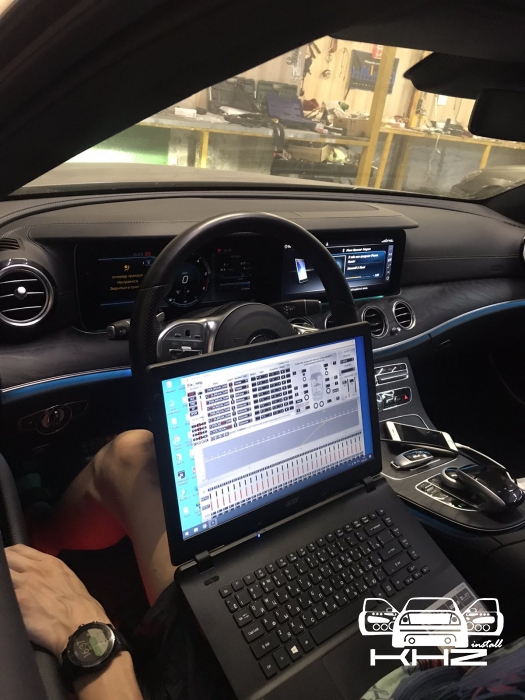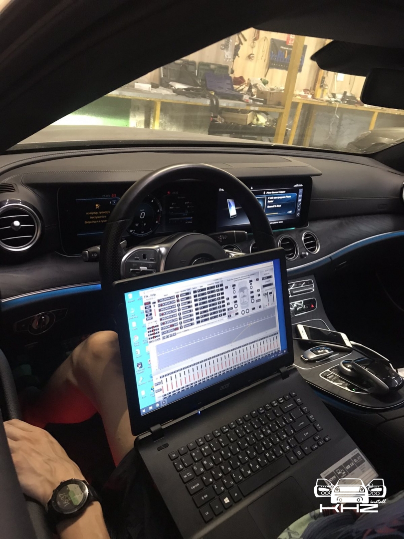 Пару фото було загублено вже готового сабвуфера в багажнику, але виглядало це дуже ергономічно. Наприкінці після того, як система вся під'єднана, ми проводимо пуск і налаштування всієї аудіосистеми в Mercedes E-class за допомогою комп'ютера та спеціальної програми для керування процесором, налаштування у нас може відбуватися як на слух, так і за допомогою професійного мікрофону та програми.