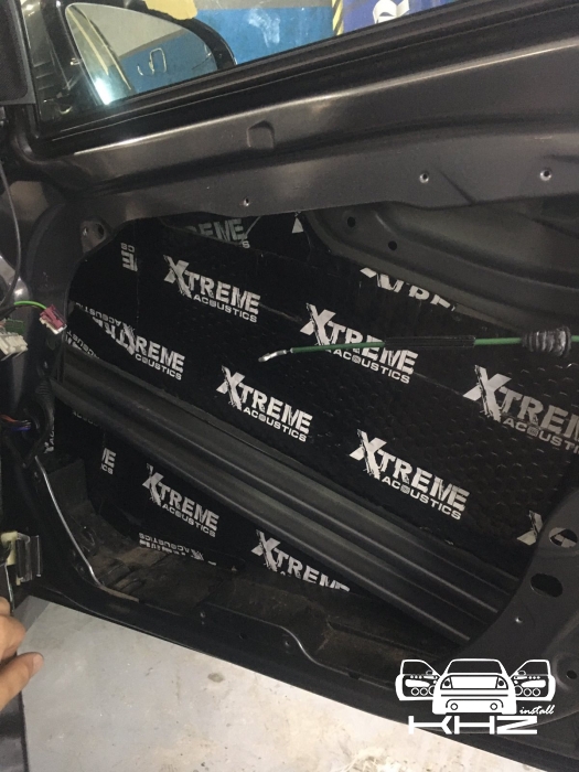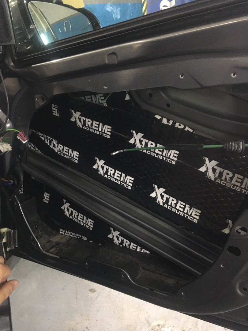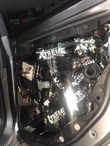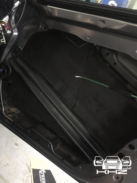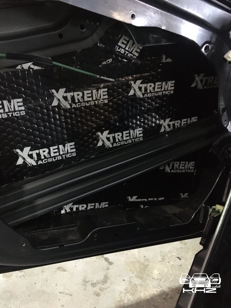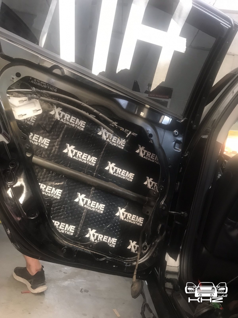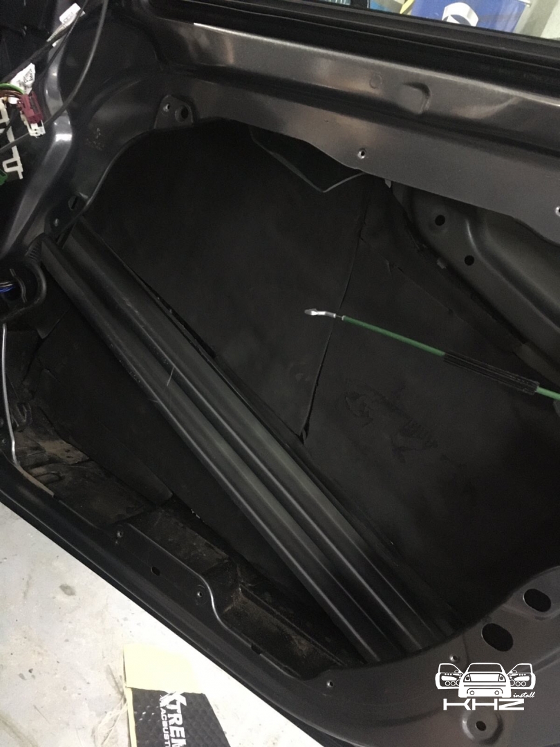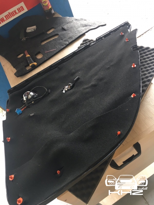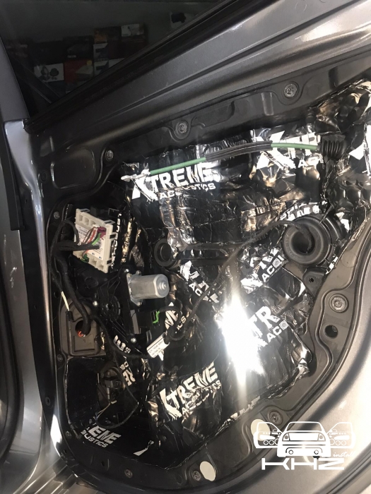 Почнемо з шумоізоляції дверей, в нашій Студії Кілогерц вона робиться в 4 шари - це максимально правильно і надає максимальний комфорт. Двері розкриваються максимально, щоб потрапити всередину і виклеїти там добре, це найважливіший елемент, який ми робимо сендвічем - для того, щоб максимально погасити шум, що йде зовні. У даній шумоізоляції автомобіля ми використовуємо хороші перевірені матеріали бренду Acoustics, хорошої лінійки. Виклеюємо всю поверхню віброізоляцією, залишаючи тільки ребра жорсткості, це надає жорсткості металу і гасить основний шум. Другим шаром ми наносимо м'який матеріал на основі спіненого каучуку, який слугує як тепло-шумоізолятор, що влітку тримає в салоні прохолоду кондиціонера на кілька годин більше. А в зимовий період тепло від грубки зберігається довше. Виглядає це так, і після цієї обробки вже в автомобілі, будуть результати, і збираємо щит дверей назад.