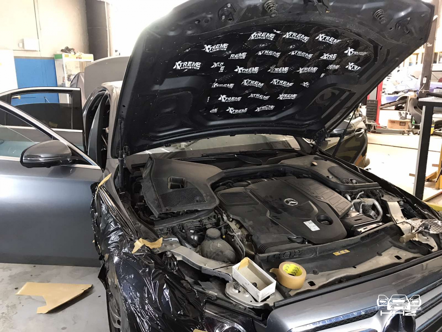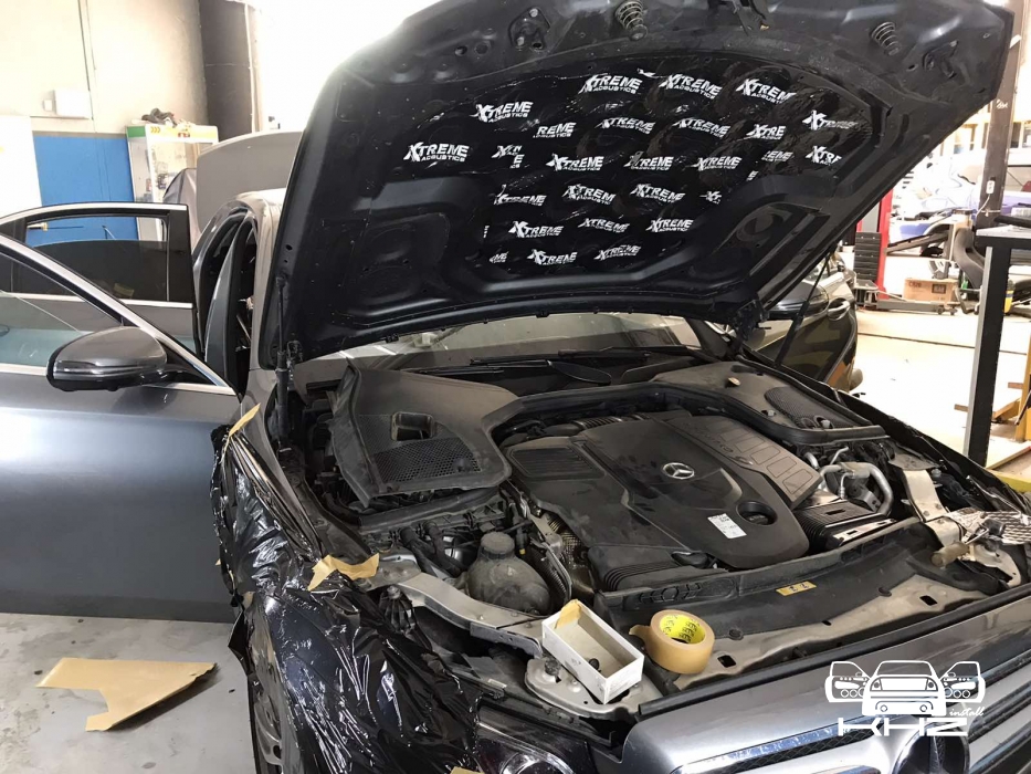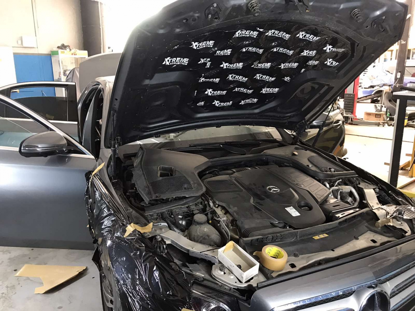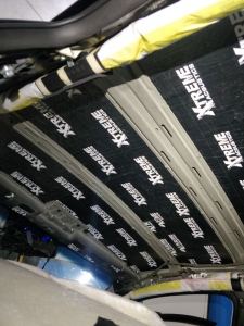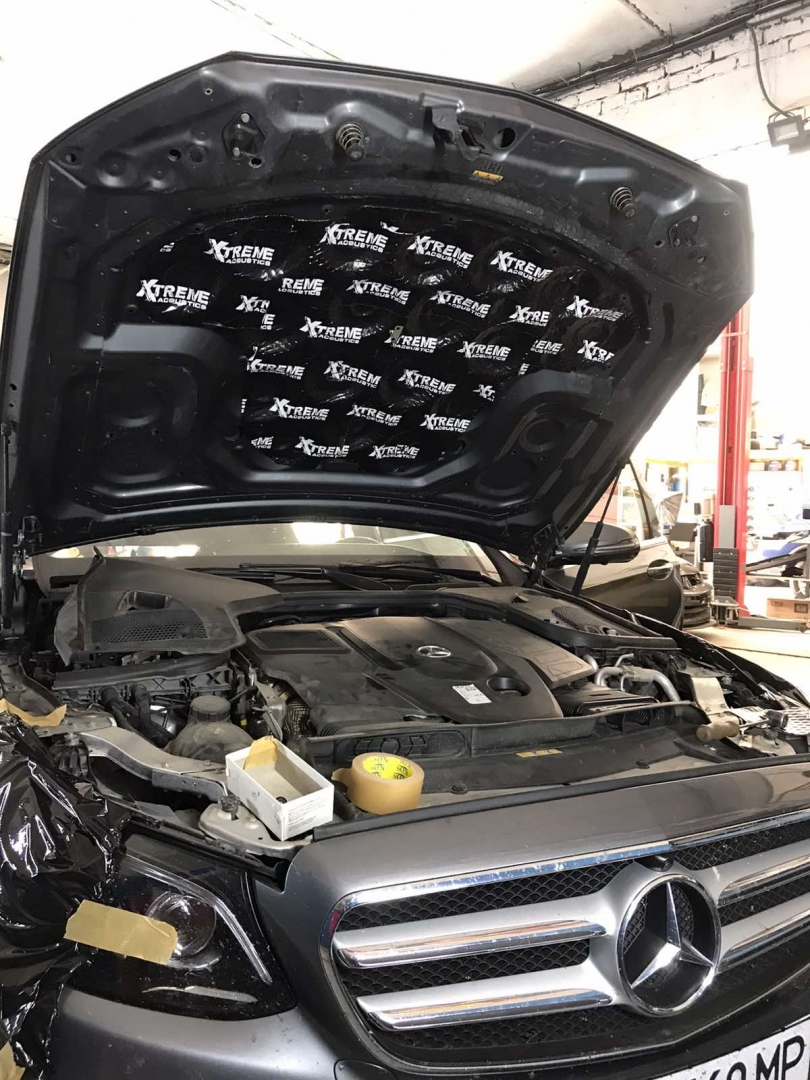 Наступний елемент - це дах автомобіля, саме шумоізоляція даху Mercedes E-class допомагає зробити перебування в автомобілі під час дощу набагато комфортнішим, адже зникає шум потрапляння води на дах, а також дуже відчувається на швидкості понад 90 км на годину, коли вітер обволікає автомобіль. Дах ми клеїмо так само в 2 шари - перший віброізоляція і другий тепло-шумоізолятор, який працює як термос в автомобілі, так само виробляємо антискрип проводки, щоб не деренчали дроти і не зіпсували загальне відчуття після шумоізоляції Mercedes E.