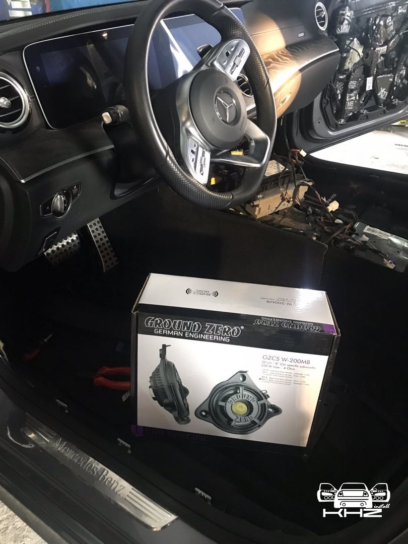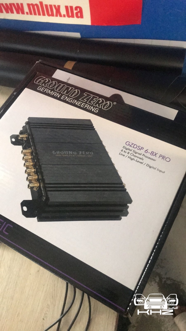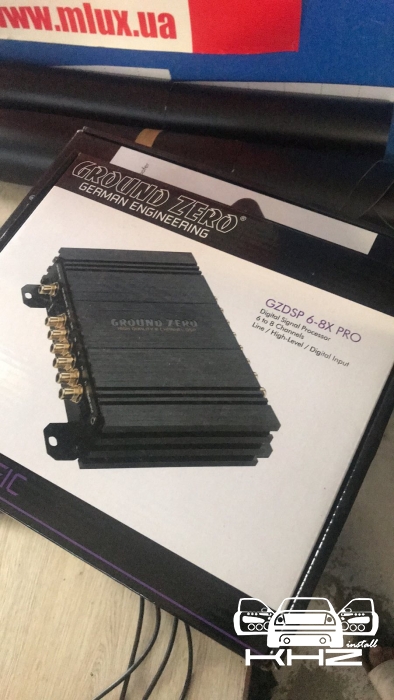 Всі знають, що звук на штатних магнітолах не дуже, і це, якщо не виправити, на виході ми отримаємо огидну якість звуку, незважаючи на всі хороші компоненти. З цим нам допоможе впоратися звуковий процесор, він знімає сигнал зі штатної магнітоли, потім очищає його та обробляє, виводячи максимально чистий сигнал, який йде далі на підсилювачі звуку та посилюється, так само за допомогою процесора та спеціального софту наприкінці ми налаштовуємо усю систему, це дуже цікавий та довготривалий процес, тому що це вибудовується сцена вже саме під клієнта. Для встановлення всіх компонентів ми побудували подіум у багажнику автомобіля і туди розмістили три підсилювачі звуку та звуковий процесор. Процесор звуку в Mercedes E-class вибрали 8-ми канальний Ground Zero з виносним пультом. Для встановлення підсилювачів звуку і процесора звуку, ми провели нову проводку силову і розвели її через дистриб'ютор живлення і маси, так само всю проводку силову захистили спеціальним обплетенням зміїна шкіра.