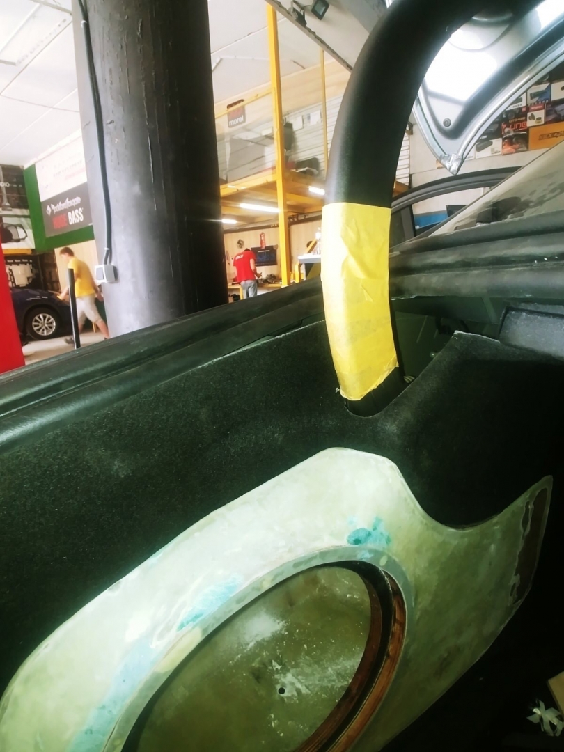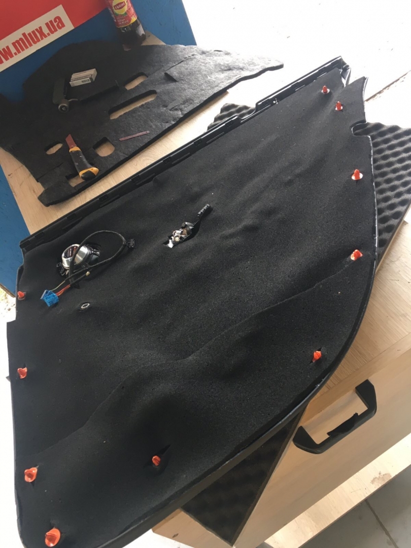 Наступний елемент це полиця, оскільки в нашій системі буде сабвуфер - полиця одна з перших піддається резонансній частоті, і піддається деренчанню, що явно зіпсує всю картину на тлі тихого автомобіля. Тому обклеюємо полицю щільною віброізоляцією в нахлест, щоб зміцнити полицю, а потім обклеюємо саму полицю м'яким матеріалом, щоб прибрати тертя і доторкання полиці до металу.