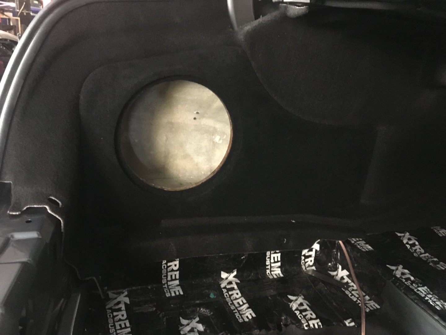 Далі ми придумали кріплення для нашого короба, і зарепілілі відгалуження до кузова автомобіля, перетягуємо короб якісним карпетом схожим за кольором з обшивками багажника, заводимо всередину акустичний кабель і кріпимо наш короб у багажнику Mercedes E-class. Це має такий вигляд: