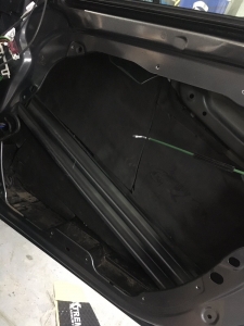 4-й шар це шумоізоляція дверної карти, оскільки карта пластикова і кріпитися на кліпсах, її потрібно добре проклеїти, щоб вона не деренчала, ми армуємо за допомогою віброізоляції карту, щоб вона стала жорсткішою і не такою кволою. Другим етапом ми повністю затягуємо карту м'яким матеріалом, щоб прибрати всі тертя карти об двері і проводку.