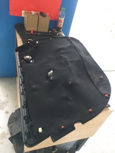 Наступним проходить обробка щита, він стоїть не у всіх автомобілях, а тільки в більшій частині у німецьких автомобілів. Його ми так само готуємо до обклеювання, цей щит дуже важко обклеїти, оскільки він ребристий і дуже вигнутий, але для нас все реально - ми не боїмося труднощів і зробили вже купу схожих робіт. Обклеюємо його віброізоляцією.