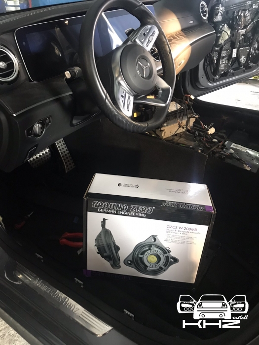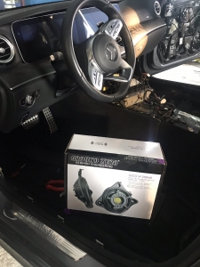Стартуємо, на фронт ми підібрали компонентну акустику іменитого бренду Ground Zero, до того ж вищої лінійки, це 10-ти дюймовий комплект, що складається з твітера та середньочастотника, а також кросовера, але його в даній інсталяції використовувати не буде, адже кожен динамік на фронті буде під'єднано окремо. Ці динаміки зроблені саме для моделей Mercedes E-class і вони підбираються за модельним принципом, і відрізняються кріпленнями. Твітер встановили в штатне місце і середньочастотник так само в карту, на штатні кріплення.