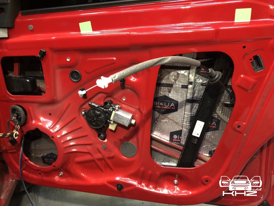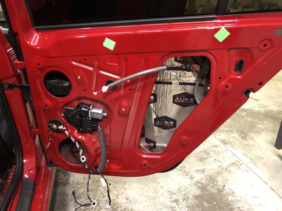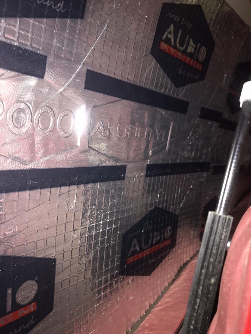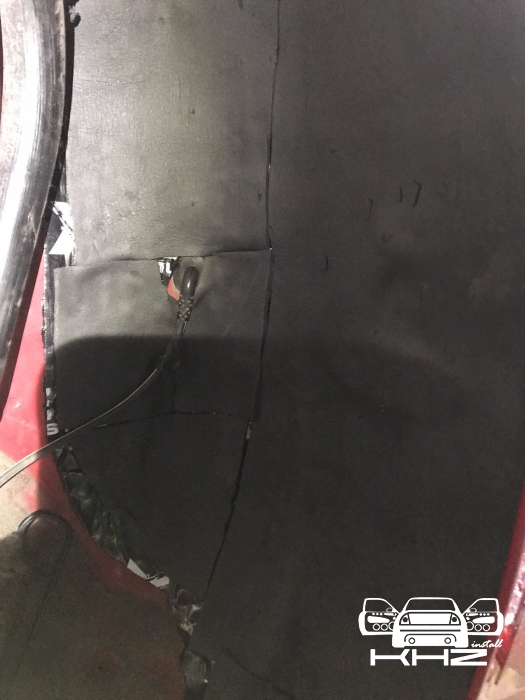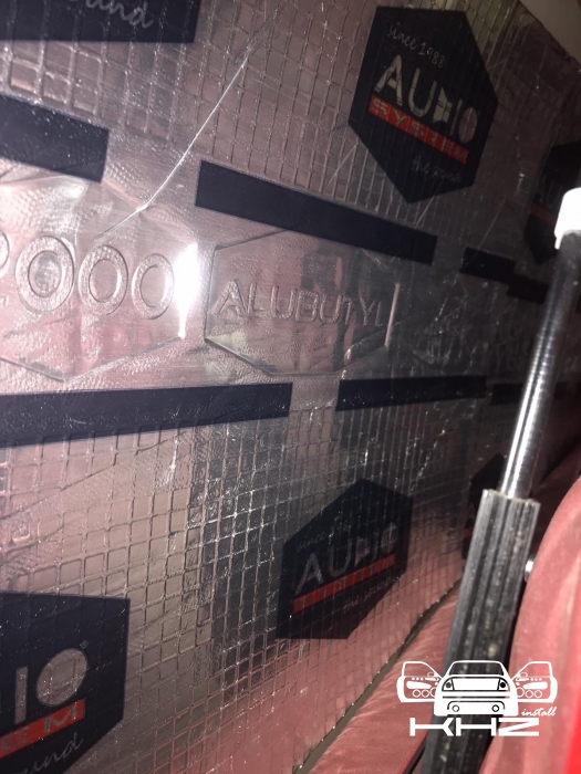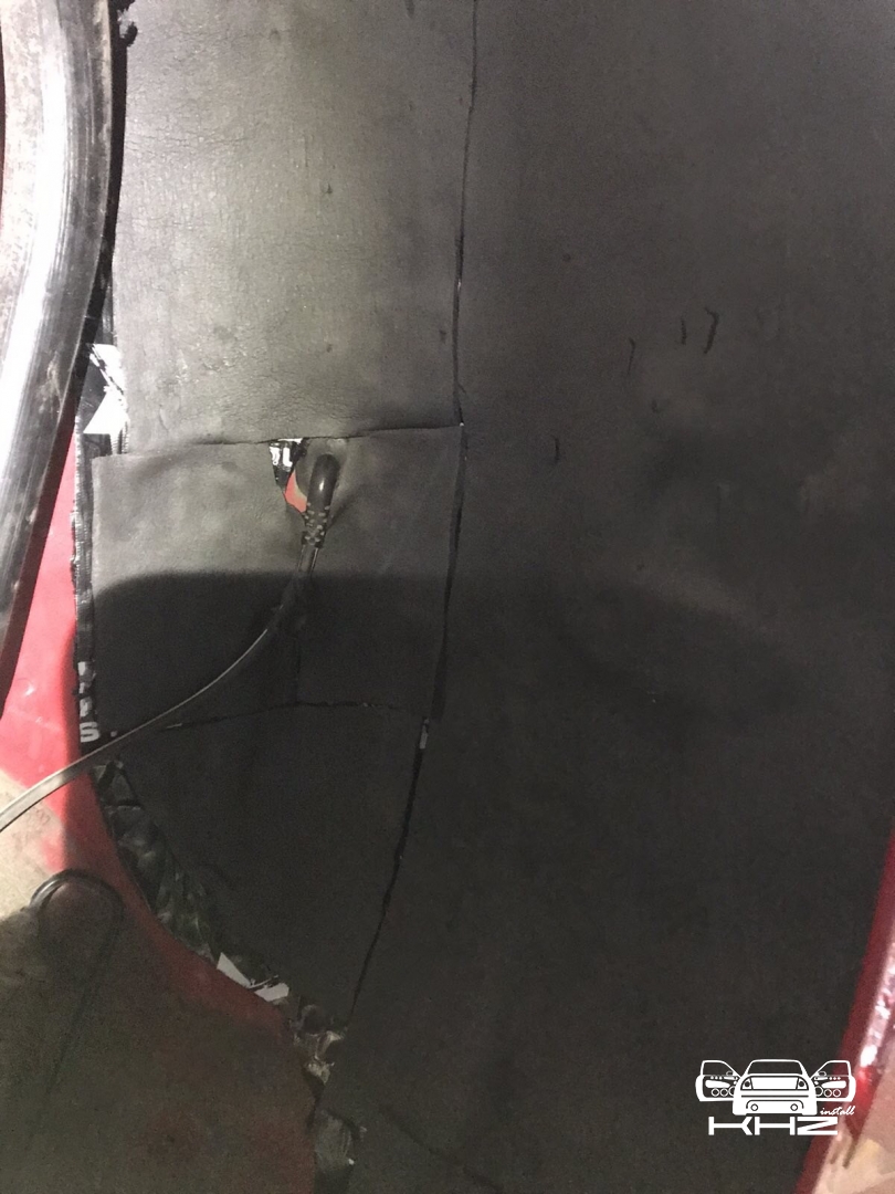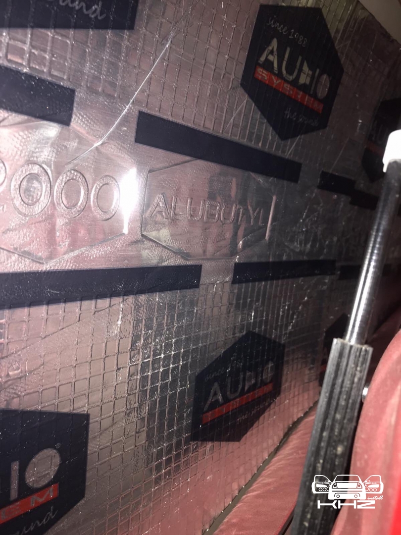 Почнемо як завжди з шумоізоляції дверей, її ми робимо якісно та з дотриманням усіх технологій, поверхні закочуємо та заклеюємо максимально, без пропусків та в нахлест, таким чином формуємо додаткові ребра жорсткості. У нас іде 4 шари, перший шар вклеюємо віброізоляцію на зовнішню частину дверей зсередини, використовуємо віброізоляцію фірми Audiosystem, чудовий варіант у сегменті ціна-якість, добре укочуємо на знежирену поверхню за допомогою валиків. Виглядає це так: