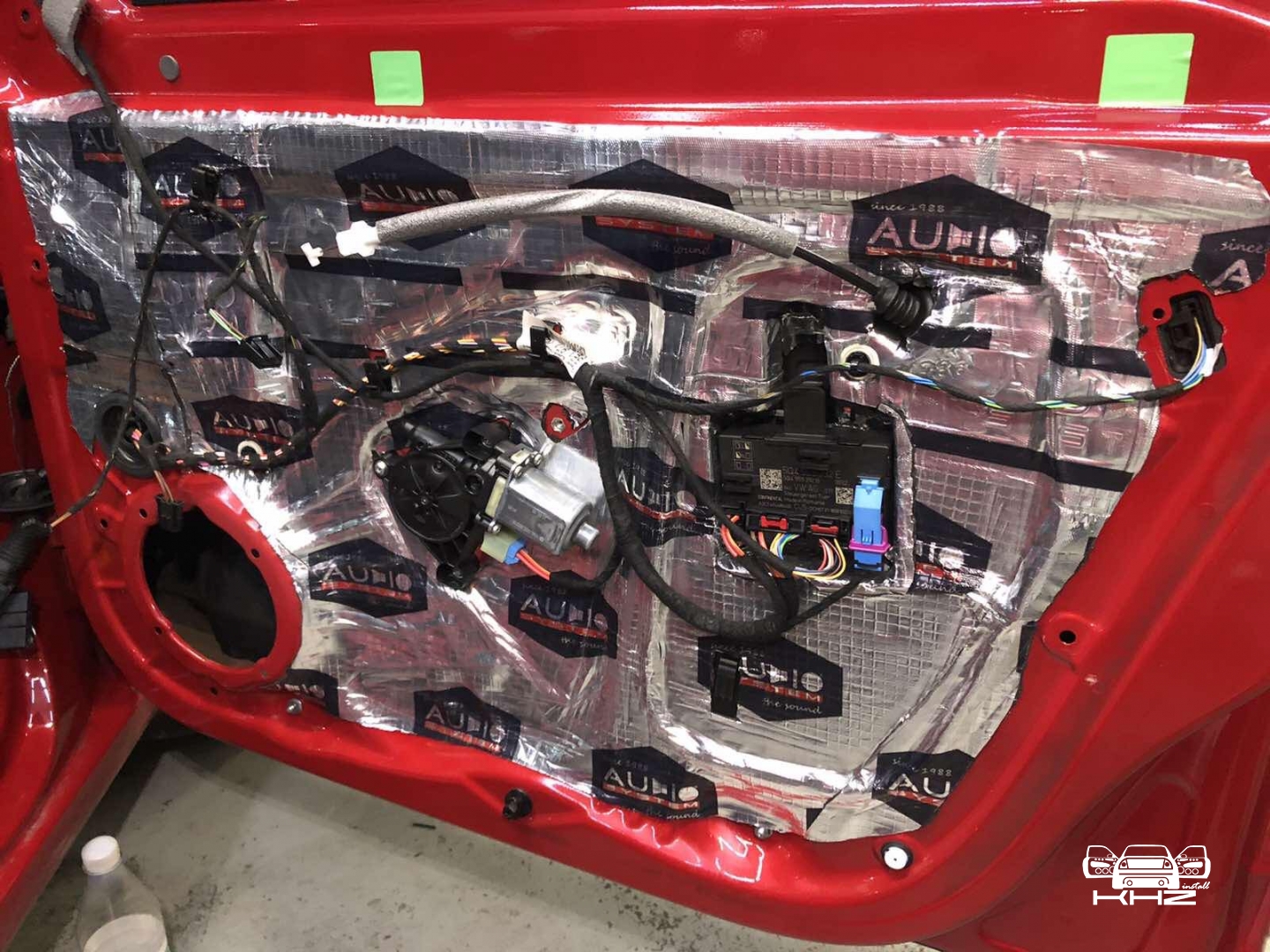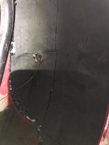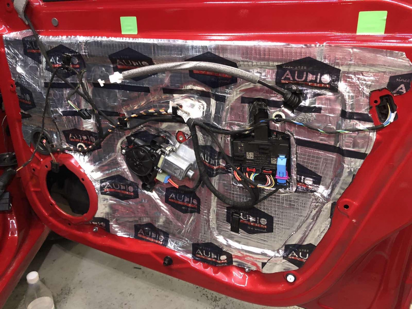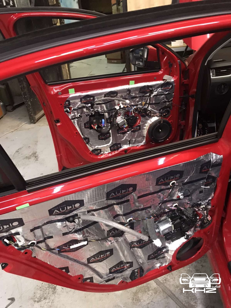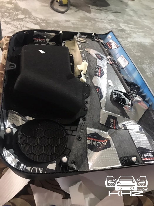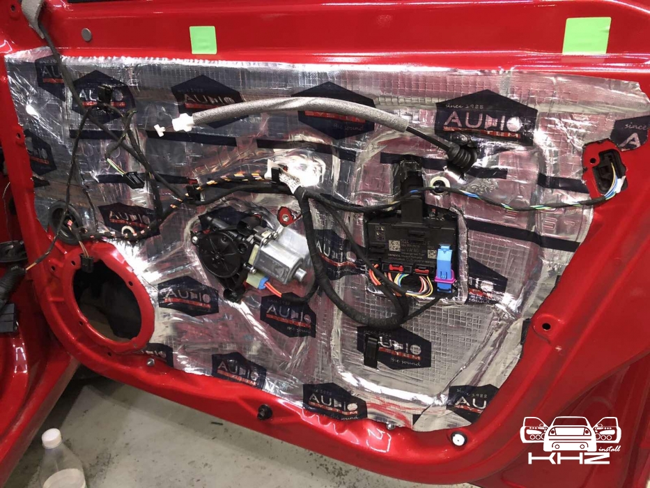Почнемо як завжди з шумоізоляції дверей, її ми робимо якісно та з дотриманням усіх технологій, поверхні закочуємо та заклеюємо максимально, без пропусків та в нахлест, таким чином формуємо додаткові ребра жорсткості. У нас іде 4 шари, перший шар вклеюємо віброізоляцію на зовнішню частину дверей зсередини, використовуємо віброізоляцію фірми Audiosystem, чудовий варіант у сегменті ціна-якість, добре укочуємо на знежирену поверхню за допомогою валиків. Виглядає це так: