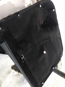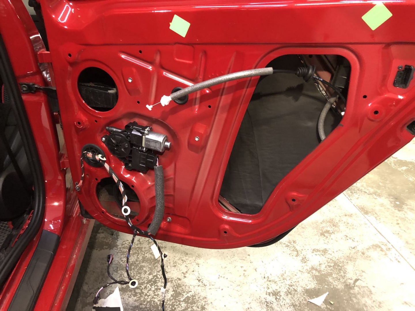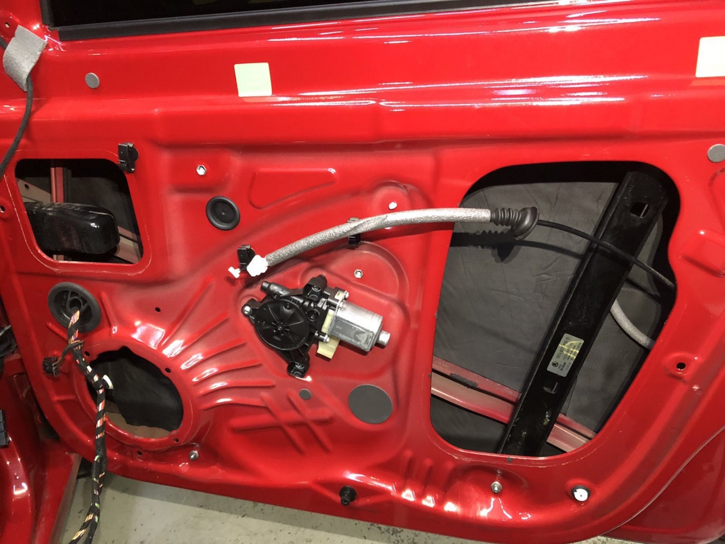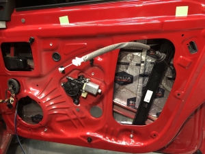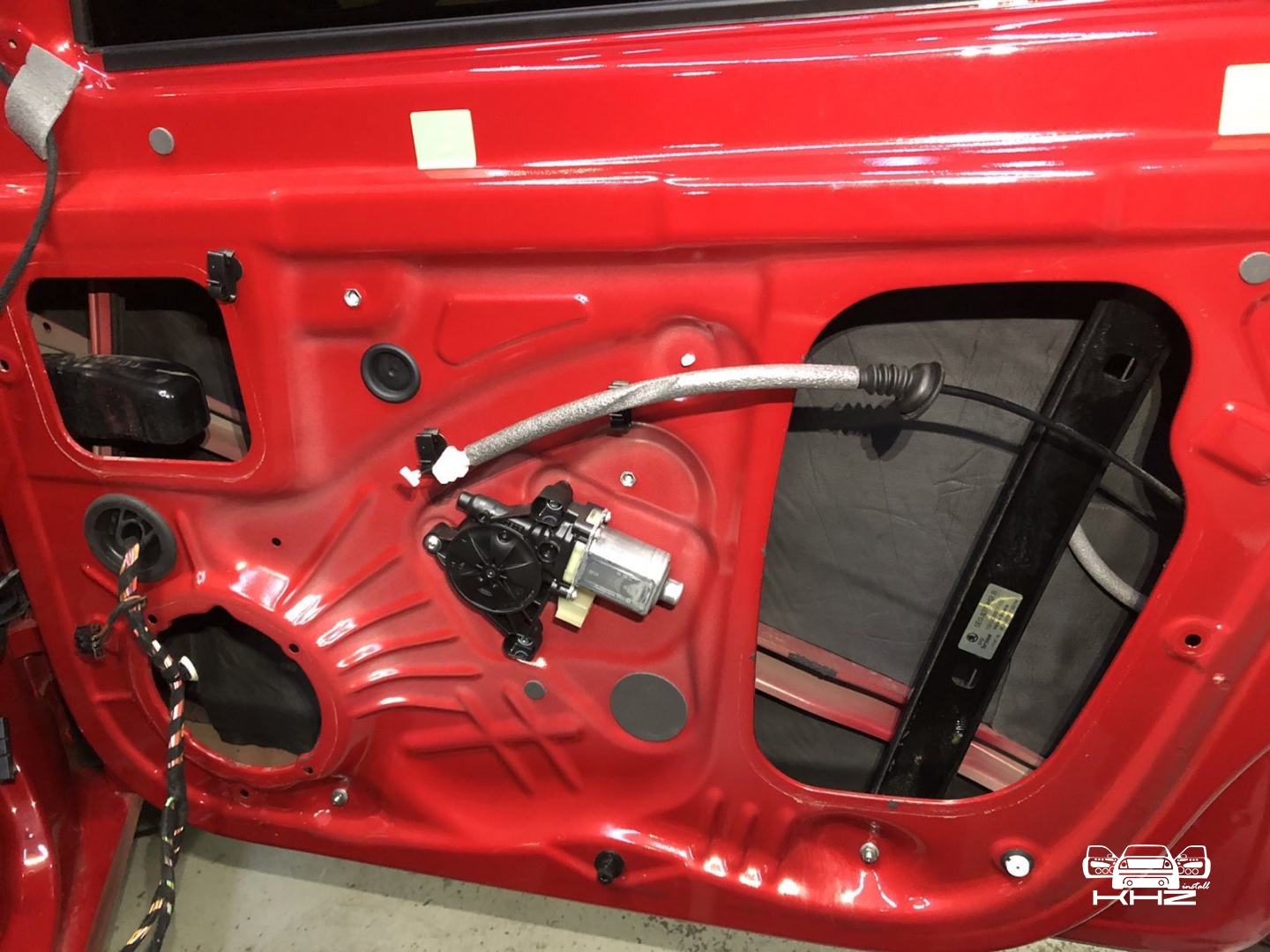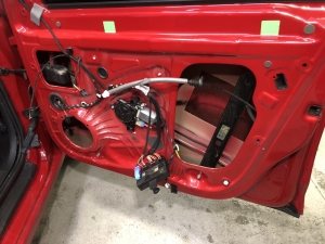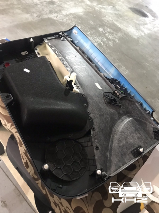Почнемо як завжди з шумоізоляції дверей, її ми робимо якісно та з дотриманням усіх технологій, поверхні закочуємо та заклеюємо максимально, без пропусків та в нахлест, таким чином формуємо додаткові ребра жорсткості. У нас іде 4 шари, перший шар вклеюємо віброізоляцію на зовнішню частину дверей зсередини, використовуємо віброізоляцію фірми Audiosystem, чудовий варіант у сегменті ціна-якість, добре укочуємо на знежирену поверхню за допомогою валиків. Виглядає це так: