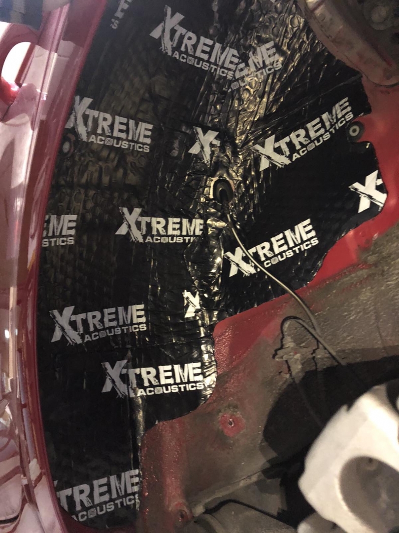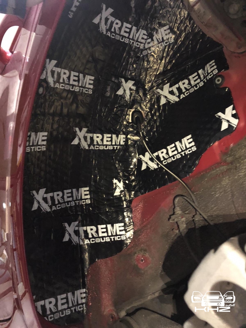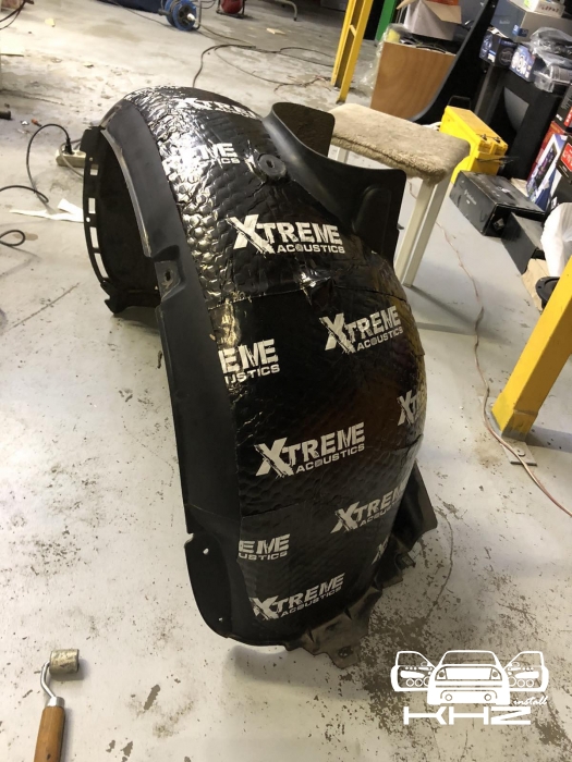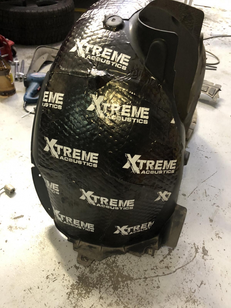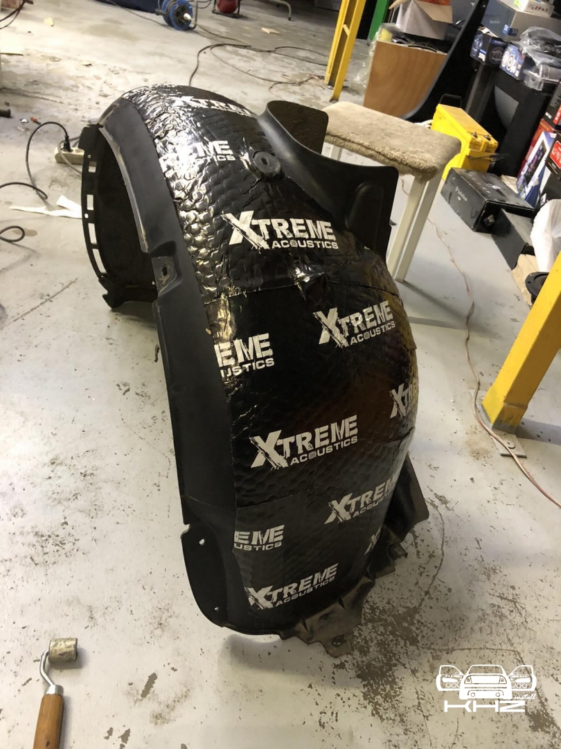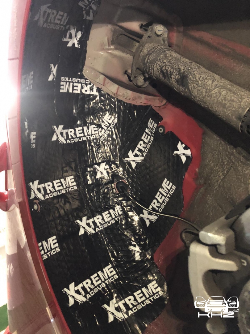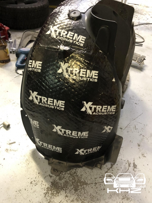 Переходимо ще до шумоізоляції арок, замовник скаржився на великий гул від коліс і звук гуми, ці шуми можна прибрати за допомогою шумоізоляції колісних арок. Спочатку знімаються колеса і підкрилки, потім ми вимиваємо метал, який і є аркою, виробляємо знежирення, і наносимо перший шар віброізоляції товщиною 3-4 мм бренду Acoustics xtreme, віброізоляція даної серії має дуже потужний клейовий шар і витримує перепади температур зовні автомобіля. Далі ми наносимо тепло-шумоізолятор поверх, щоб погасити шум ще глобальніше, і останній етап - це обклеювання віброізоляцією локера, підкрилка, він зроблений із дзвінкого пластику, який передає шум від гравію та води, а також піску, тому ми його підкочуємо, і він стає жорстким, і він не передає шуму далі, має вигляд усе це ось так: