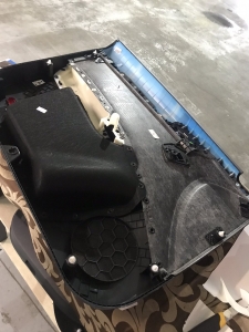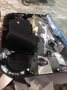 Далі у нас стояло завдання встановити сабвуфер в Skoda Octavia A7, замовник хотів зробити короб стелс в крило - але це не бюджетне рішення, так як той, хто стикався з виготовленням даного короба, знає скільки сил коштує його зробити. Але він знайшов готовий короб стелс у Польщі, фірма робить стелси з пресованого картону, і замовив його, по приїзду він здався навіть нічого, і об'єм є, і в принципі не з тонкого матеріалу, і коштує на 40% більше, ніж робити зі скломату та смоли, - зрозуміло, що він не має такої жорсткості корпусу, але для звичайного завдання піде. Перед установкою сабвуфера ми підкатали крило віброізоляцією і зробили антискрип крила, щоб нічого не деренчало, провели нову мідну проводку для підключення сабвуфера, і завели її в короб, далі можемо підключати сабвуфер. Сабвуфер ми вибрали бренду Audison APS 10 S4S, це 25 см сабвуфер зі зменшеною посадкою і вимогами до не великого об'єму, також великий плюс, що він тримає хорошу потужність, якісно грає, має швидкий панч і захисний гриль у комплекті, дуже красивий. Ми щільно закріплюємо короб до кузова автомобіля і закріплюємо в ньому сам сабвуфер, виглядає це так:
