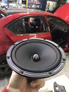 Тепер поговоримо про задню акустику, її ми так само взяли компонентну, тому що є заводське місце для твітера, чому б і ні. Але акустику ми взяли більш простої лінійки Express 165, вона так само 2 ом, але в нашій системі вона буде працювати від магнітоли безпосередньо, оскільки у нас йде упор на фронт і сабвуфер. Встановлюємо акустику в Skoda Octavia A7 так само як і на фронт, через фанерну проставку в штатне місце, тільки не змінюючи кабель, так само розводимо проводку і на твітер, і ставимо кросовер.