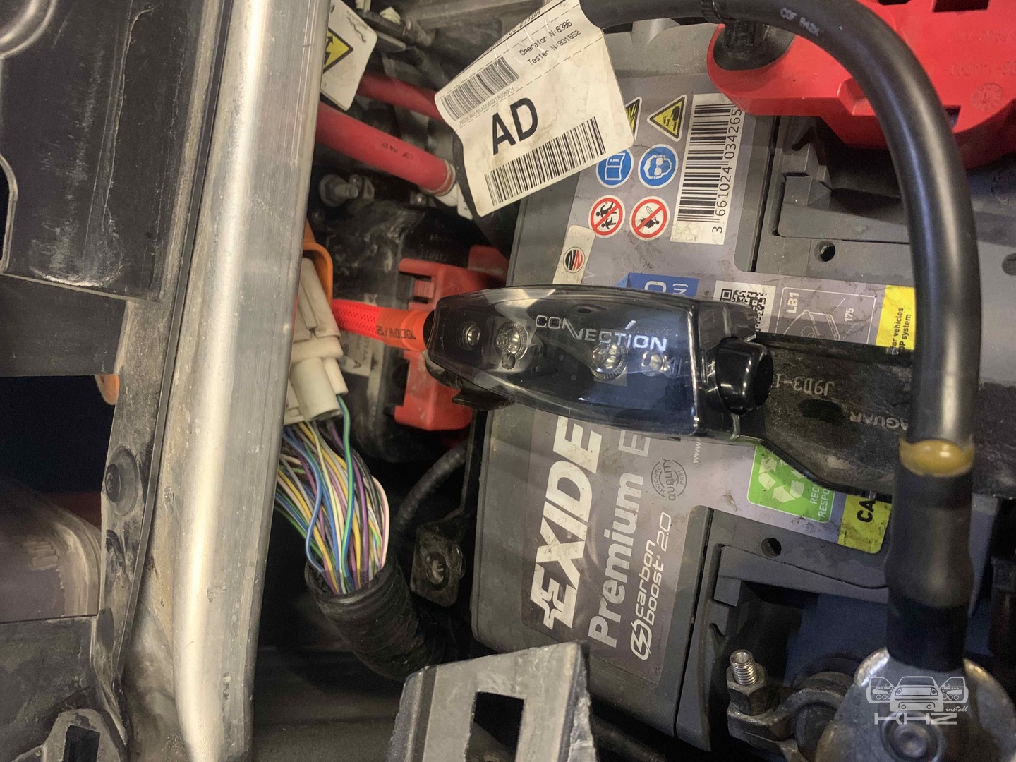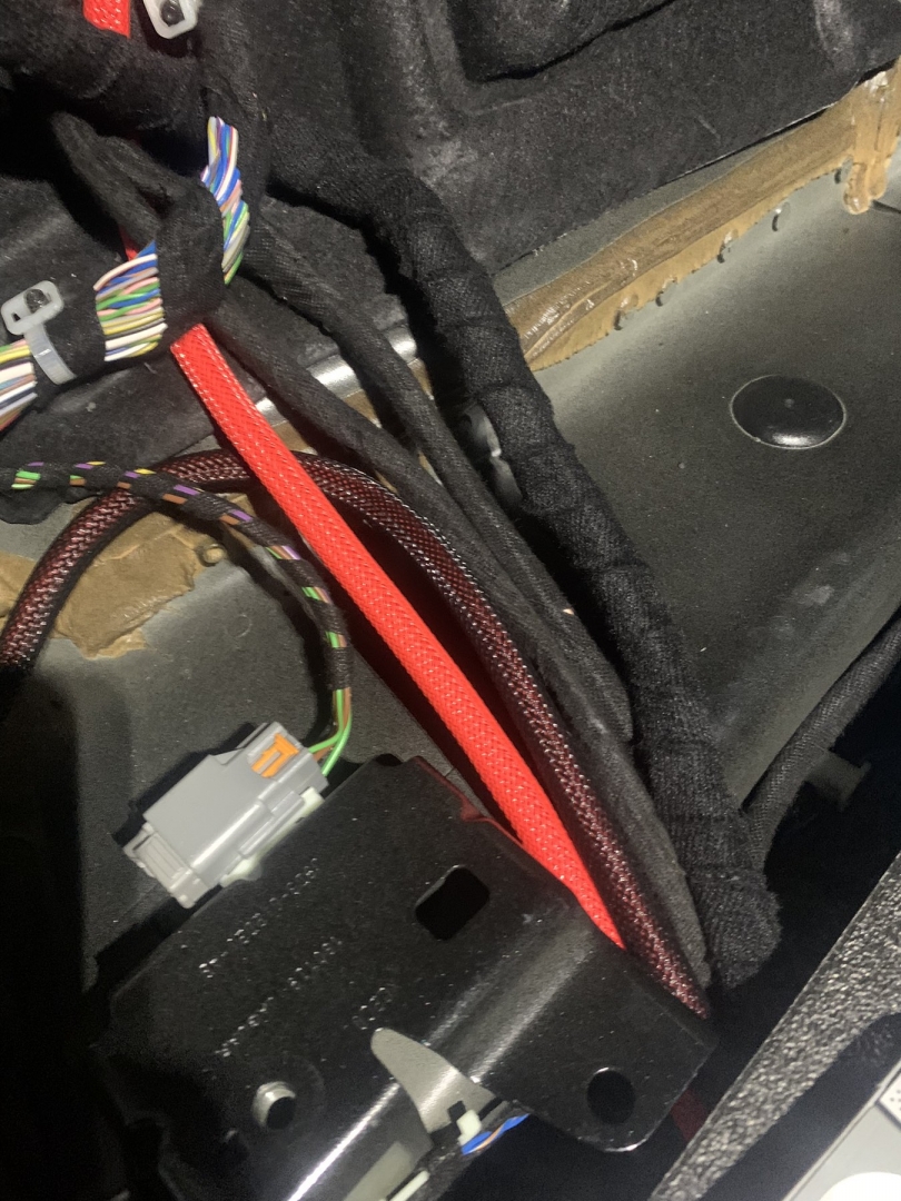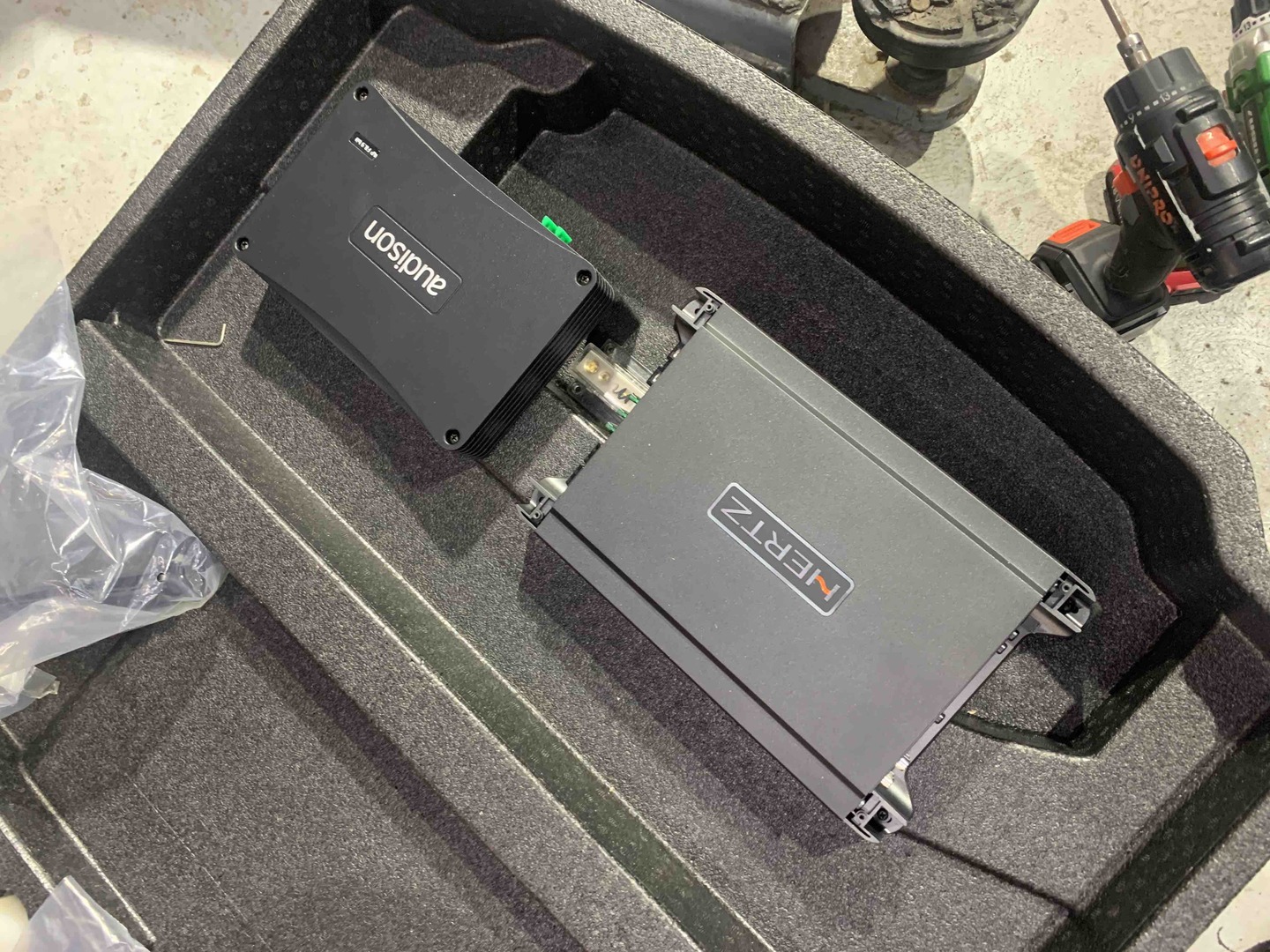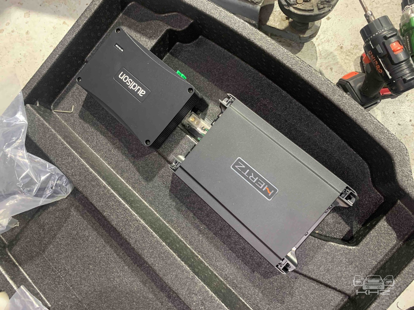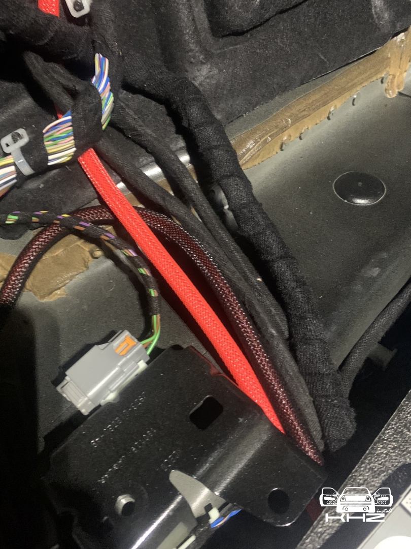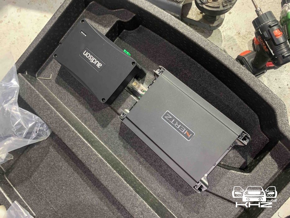 Переходимо до встановлення підсилювачів звуку, їх буде 2 - один це серце аудіосистеми Jaguar I-Pace процесорний 8-ми канальний підсилювач з 9 каналами процесора Audison AP F8.9Bit, даний підсилювач звуку допоможе нам коректно зняти сигнал і обробити його, очистити і вирівняти а потім підсилювач вже його посилить, і відправить далі, а другий підсилювач звуку це 1-канальний моноблок, високої потужності Hertz HCP 1Dk - цей підсилювач і компактний як для своєї потужності і якісний, а головне він видає саме ту потужність, що заявлено. Два підсилювачі звуку Jaguar I-Pace ми довго думали де розмістити, та єдине місце де це було можливо, це у пінопластовій ніші під підлогою, для цього ми зробили такі опори, з дерева та перетягнули карпетом, до них ми закріпили підсилювачі а їх знизу до пінопластового органайзера. Довели проводку, силову та акустичну, яка захищена оплетками від перетирань.